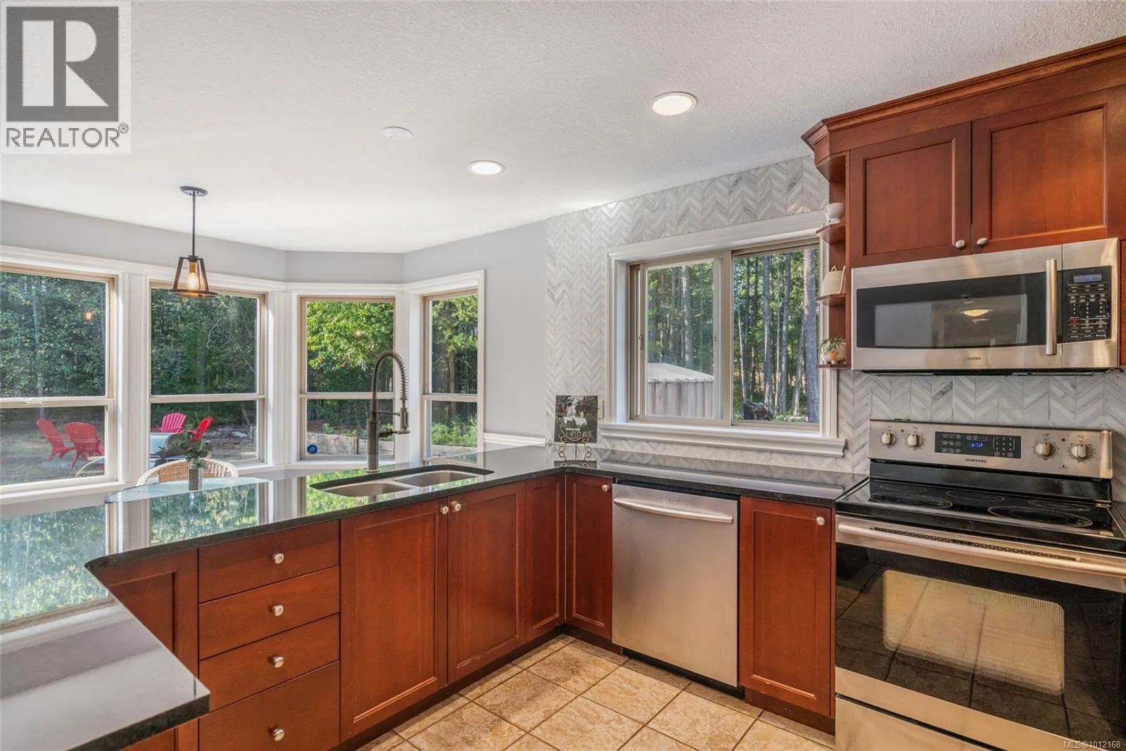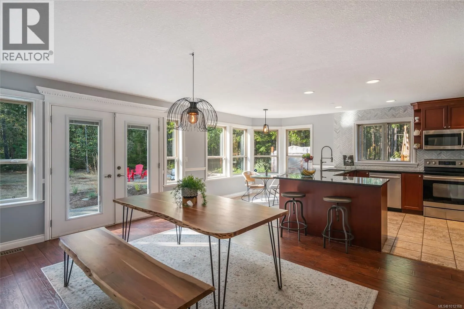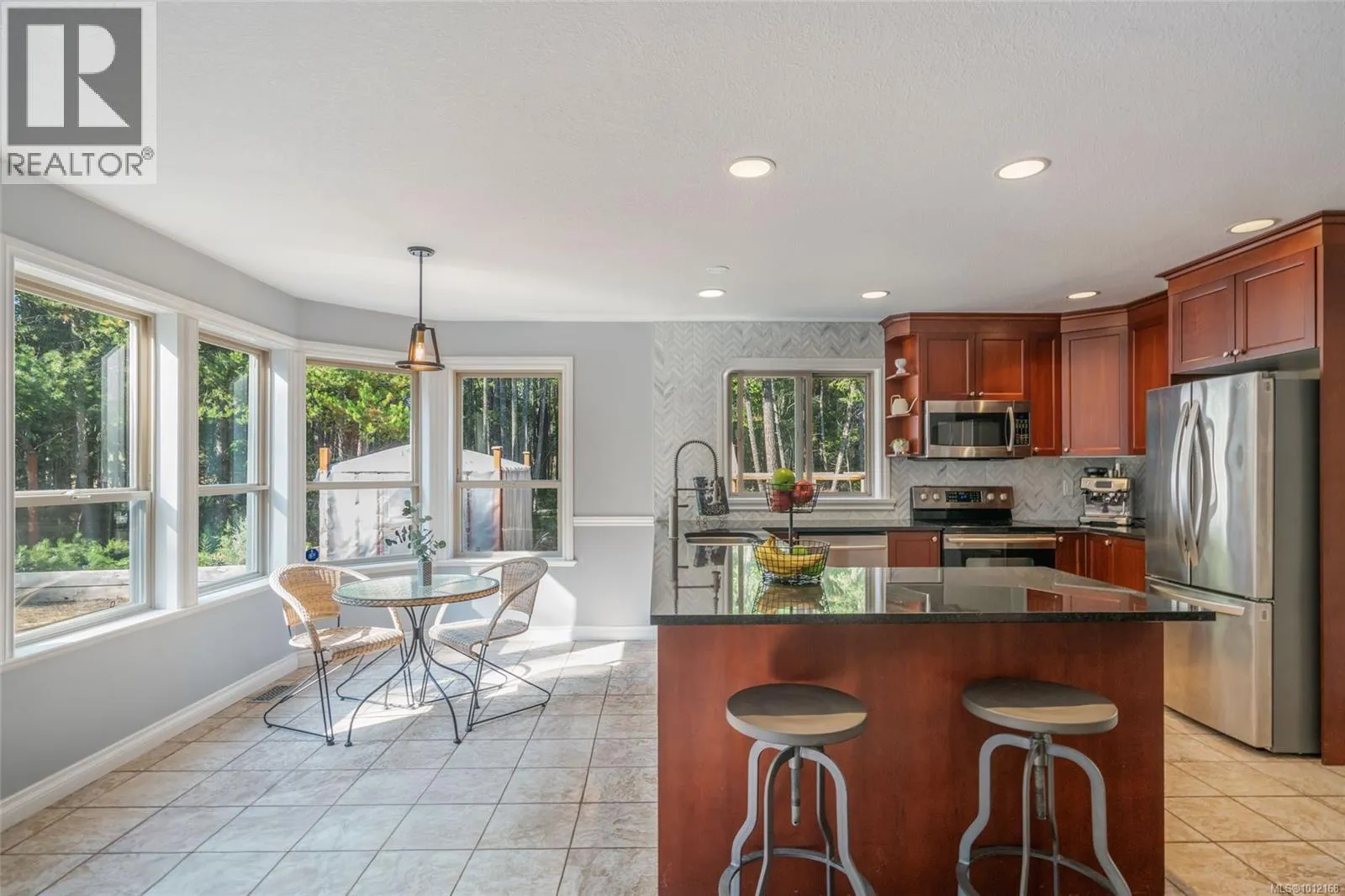 Impressive Rivers Edge Country Acreage! Fabulously located on mid-eastern Vancouver Island along the Englishman River lies the prestigious community of âRivers Edge,â a peaceful subdivision of upscale acreages. Here youâll find this Custom 2630 sqft 3 Bed/4 Bath Family Home with a separate Guest Suite, perfectly set on a sprawling 2.60-acre parcel. This stylish abode boasts contemporary fixtures and finishing, abundant windows framing acreage views, great guest accommodations, superb outdoor living space, ample parking including an RV spot with sani dump, a Greenhouse and garden area, and an unbeatable location just minutes from Parksvilleâs shopping and amenities. An extended drive winds through grassy fields past a charming pond to the parking area of this captivating home set amid towering trees and open skies. An east-facing semi-circle front patio is perfect for morning coffee or shaded relaxation. Inside, the tiled foyer with stone feature wall leads to the formal Living Room with oak floors, an elec fireplace, and arched windows framing serene views. The open Kitchen/Dining Room is bright and stylish, with wainscoting, abundant windows, and a 4-piece Contemporary Kitchen featuring porcelain tile flooring, wood cabinetry, stainless appliances, pantry, and bay-windowed breakfast nook. Dining Room with hutch alcove and door to massive 475 sqft patio, ideal for entertaining. The west-facing backyard offers privacy, grass, and a fire pit. Main-level amenities include a Laundry Room with walk-through closets, a Powder Room, and an Office/Den. Upstairs, the Primary Suite has oak floors, cathedral ceiling, bay window, makeup vanity with beverage fridge, custom walk-in closet, and a 5-piece spa ensuite. Two additional Bedrooms share a 4-piece Bath. A main-level Guest Suite with living area and 4-piece Bath offers flexible use. The property also features a sun-soaked garden with greenhouse, raised beds, and a shed. Visit our website for more info. (id:27476)