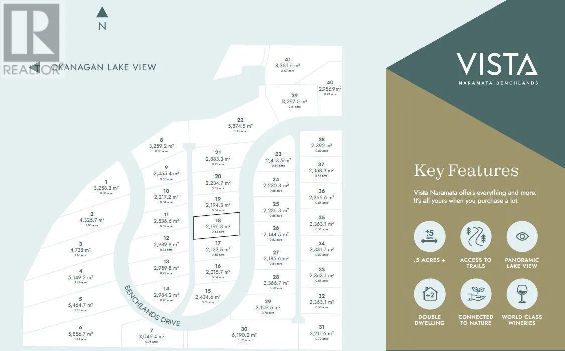 Incredible opportunity to build your dream home, with limitless flexibility of design. Join the lucky few in the community of VISTA - Naramata Benchlands. This premium building lot with panoramic views of Lake Okanagan boasts over half an acre of useable land, with zoning in place for carriage home or suite, and tons of space for a pool, expansive yard, and generous parking. This 23,086 Sqft (0.53 Acre) lot has all services ready to go. With road *and* laneway access you have more development options, including the option for secondary dwelling! Perfect location for wine lovers and outdoor adventure seekers. This property is within minutes to many of Naramtaâs world famous wineries, Kettle Valley Trail (among others), beaches and much more. Build your dream home or use the available building plans. Vacant land is open to Foreign Buyers! (id:27476)