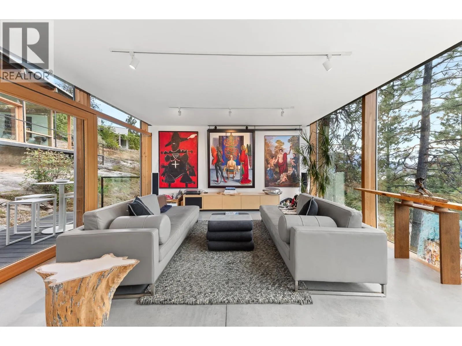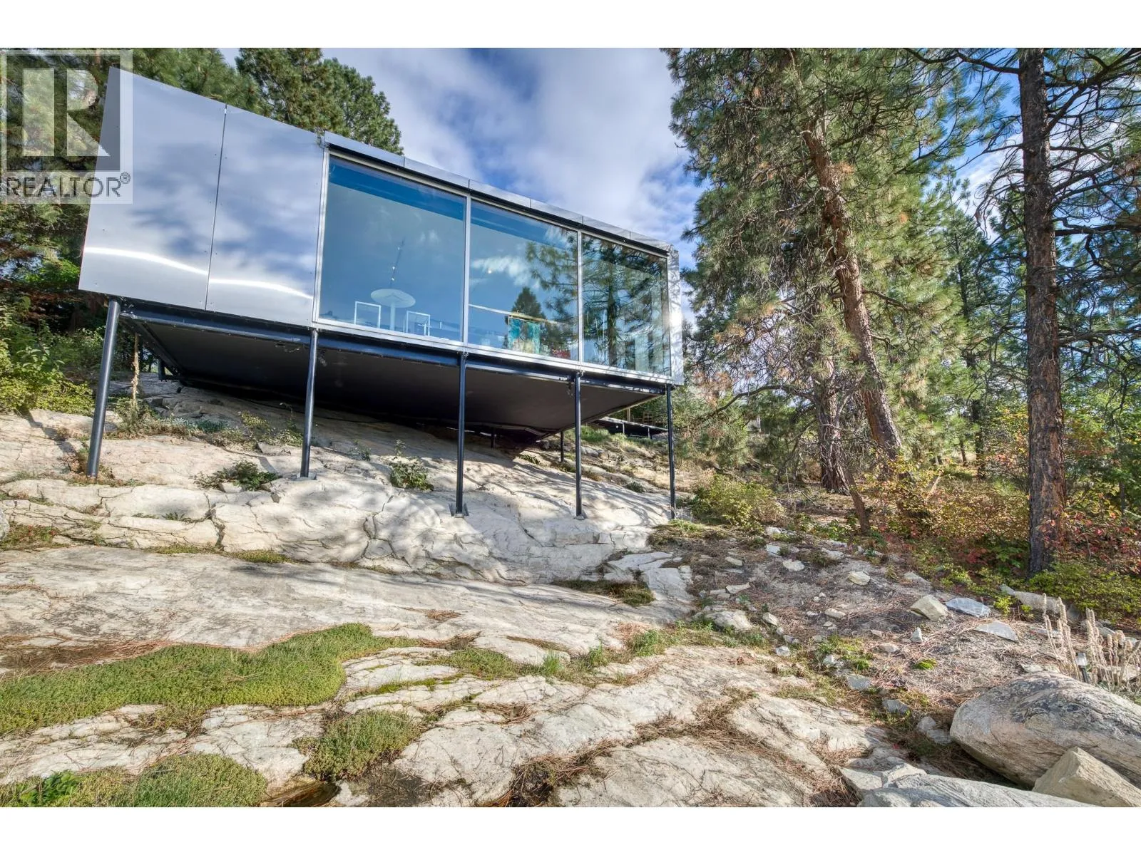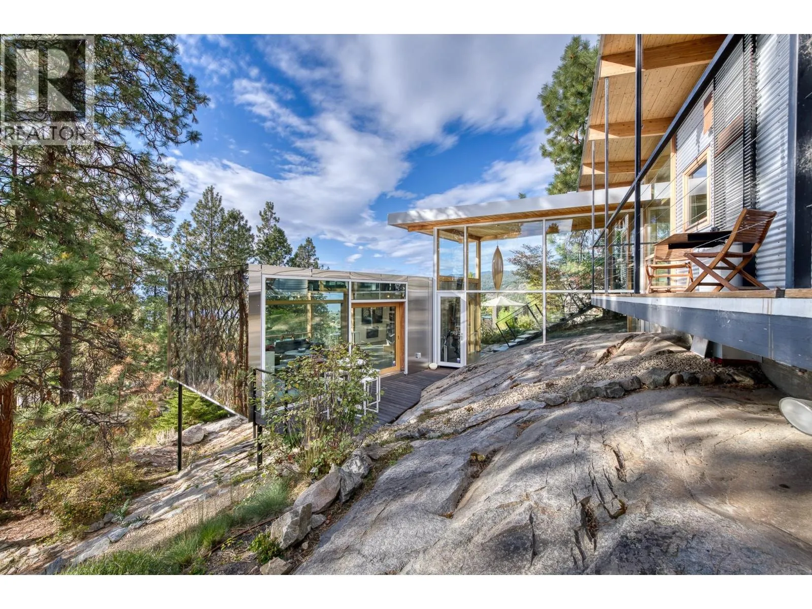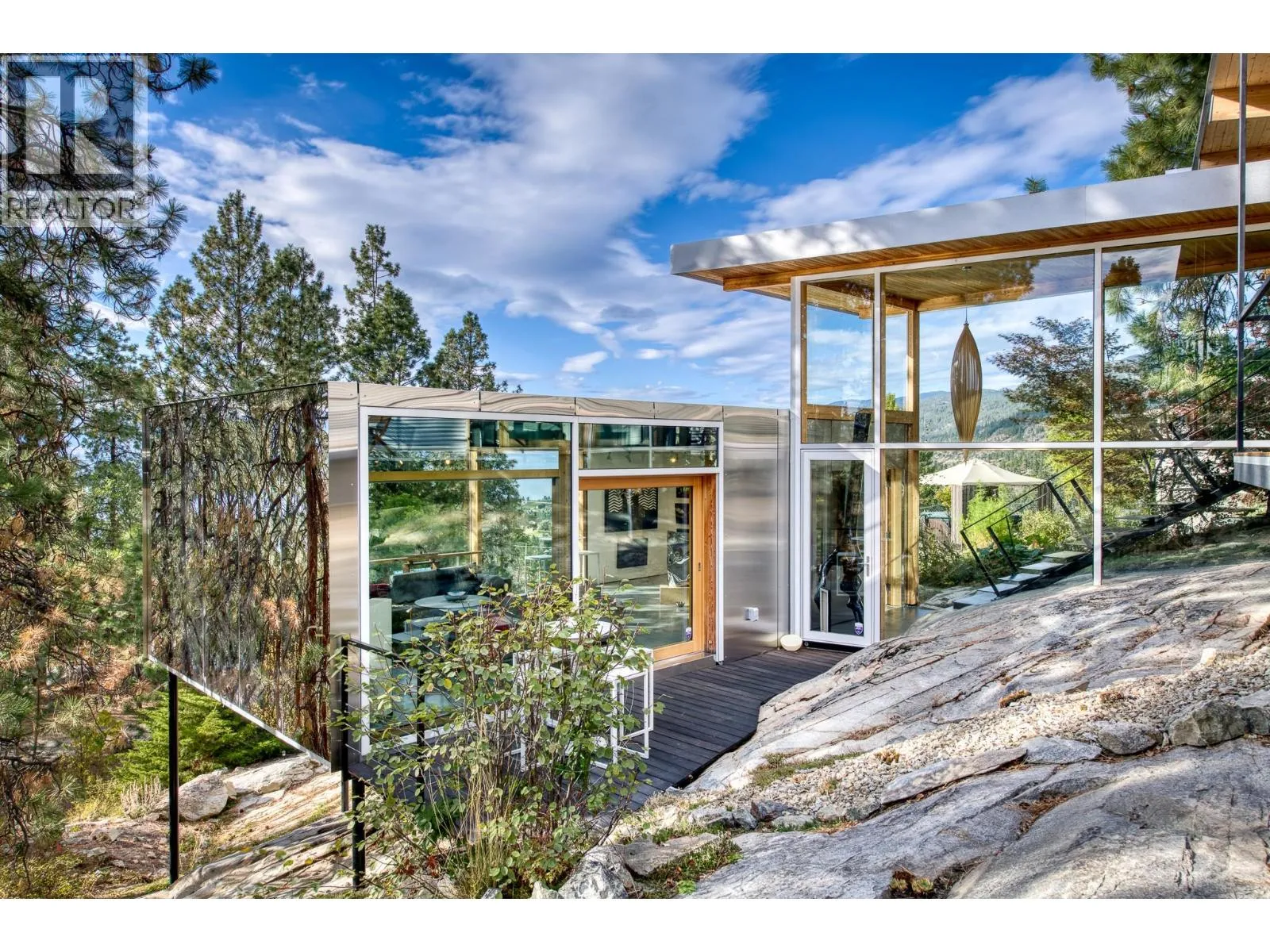 All but hidden from view is 2843 Arawana Place, a work of art designed by renowned Architect Florian Maurer. Designed as his personal residence, this home epitomizes his desire for the calm and serene as he believed the world was loud enough without him adding to it. Winning the Governor General's medal in 2006 for his design, Maurer connects the detached inside spaces by way of exterior flow for effortless functionality, with a focus on the magical courtyard space. In this home you find, rather than an abundance of square footage, a spaciousness bound with total privacy, achieving his goal of controlling the view so as not to have oneâs enjoyment and privacy governed by neighbours. Entering the gates, you pass by the upper level serving as a home office or guest suite, with an adjacent garage and storage area. From there, venture into a secret garden with entertaining spaces, corners for quiet retreat, and the beauty of dappled sun through the leaves of the trees. The second detached space serves as the primary bedroom, while the main space consists of the kitchen, large pantry, living room, and guest bedroom. A large wraparound deck affords gorgeous views through the trees to the lake and mountains where the sounds of nature settle over you. Completing the home is the gallery space, added by the current owners and set upon slim steel posts. Clad in stainless steel reflecting the sky and forest, this structure disappears as it floats above the bedrock, gently fitting into the surrounding greenspace. Book your private viewing of this one-of-a-kind home today! All msmts approx. (id:27476)