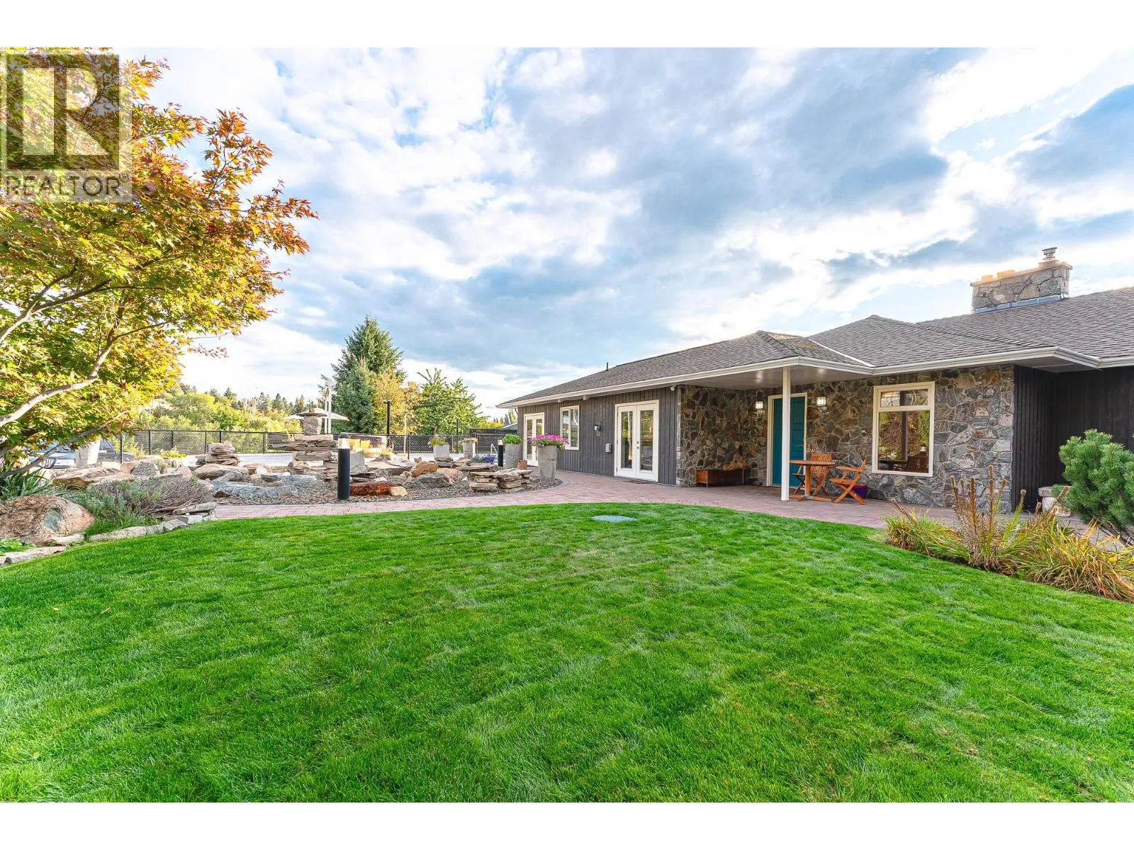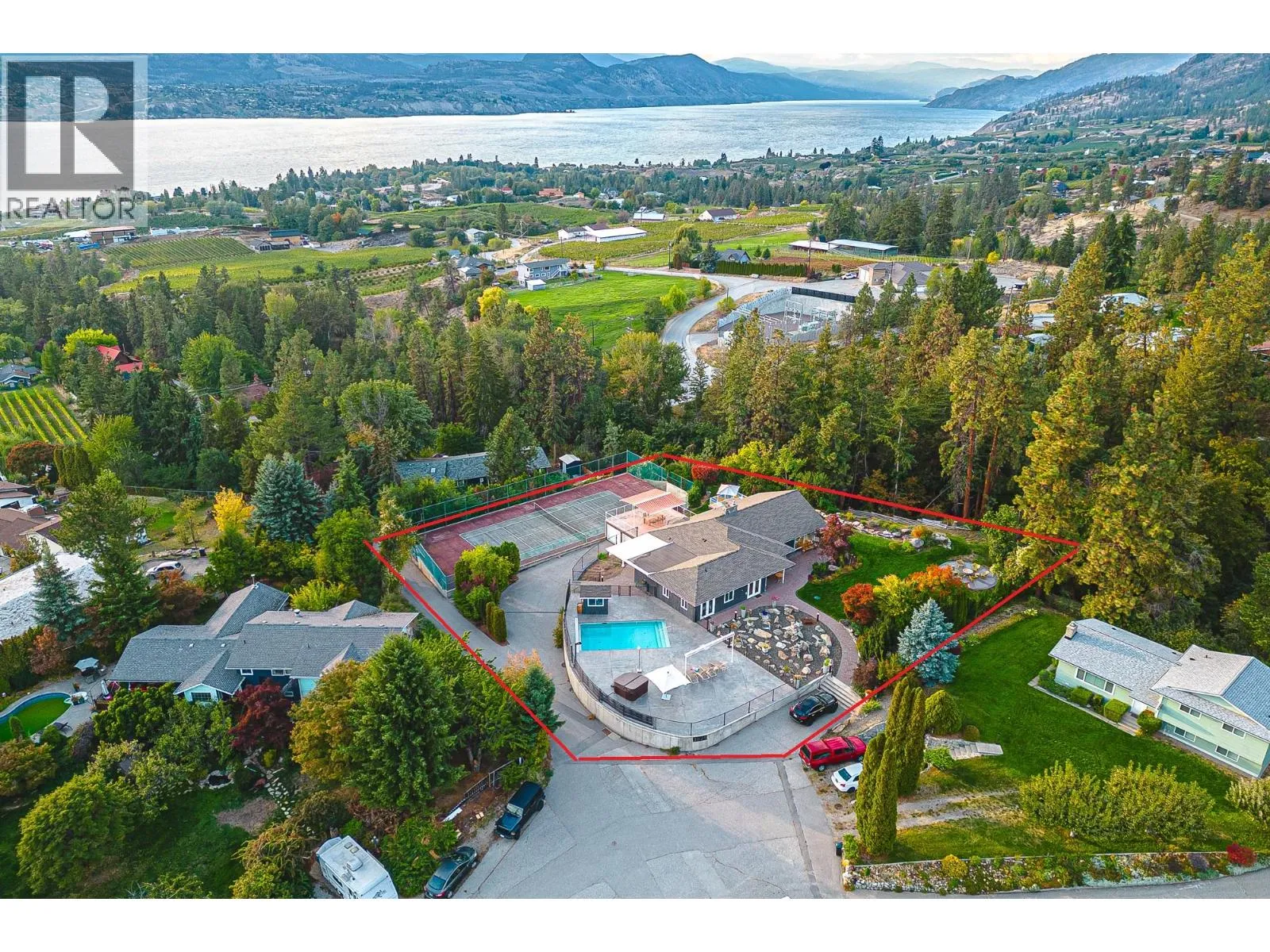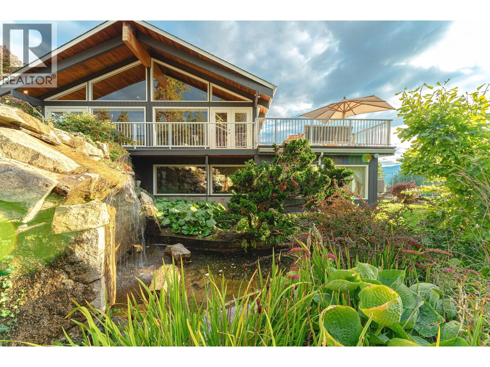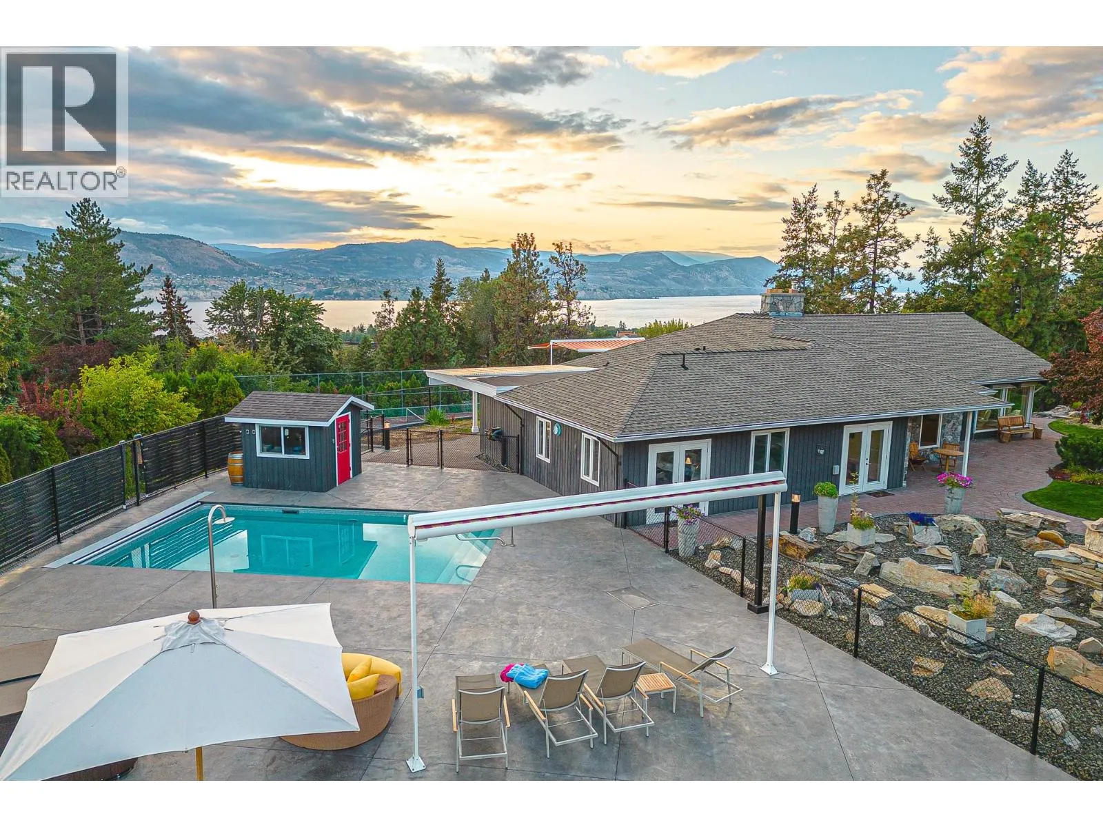 Nestled in luscious grounds this sprawling over 4700 sq ft RANCHER plus basement features: VIEWS, salt-water POOL, pickleball/tennis/basketball COURT, WORKSHOP and a GARAGE. Walk into your home with pouring natural light, massive wood beams and double sided granite fireplace overlooking the WATERFALL. This expansive home has a grand room with vaulted ceilings, room for a 10-person table, walk-out onto your vast patio with spectacular views of the lake. Perfect for entertaining or relaxing. Primary bedroom is beautifully finished with over 190sqft, walk through closet and tranquil ensuite. Bedrooms are steps away from the pool for ease. Downstairs you will find storage/den/wine cellar and a bathroom plus BONUS ROOM: gym/theater room or a potential suite. (id:27476)