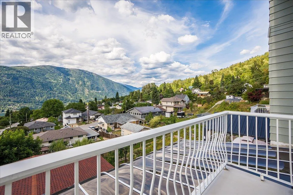 Nestled in the heart of Nelson, BC, this stunning 7-bedroom, 4-bathroom home offers over 5,000 sqft of comforting living space with breathtaking lake and mountain views. Perfectly blending modern elegance with timeless charm, this solid-built residence boasts 2x6 walls, a brand-new roof, and recently renovated bathrooms, ensuring both durability and contemporary comfort. The main level features a bright and open dining and kitchen area, ideal for hosting gatherings, with seamless flow into expansive living and family rooms. A fully enclosed sunroom bathes in natural light, offering panoramic views of Nelsonâs serene landscape. Step outside to the spacious balcony, equipped for entertaining and soaking in the stunning vistas. Upstairs, 5 bedrooms provide ample space and tranquility, with the master suite stealing the show. It includes a private balcony and an ensuite bathroom, creating a peaceful retreat. The home also features an additional full kitchen and pantry room, perfect for extended family or guests. A charming 1-bedroom suite with an updated bathroom and separate entrance offers versatility for rental income or guests. The newly paved driveway leads to an attached garage with RV parking, while a detached workshop and double garage below present potential for a secondary home. The flat garden beds, tranquil outdoor sitting area with a water feature, hot tub space, and extra storage complete this idyllic property, blending functionality with natural beauty. (id:27476)