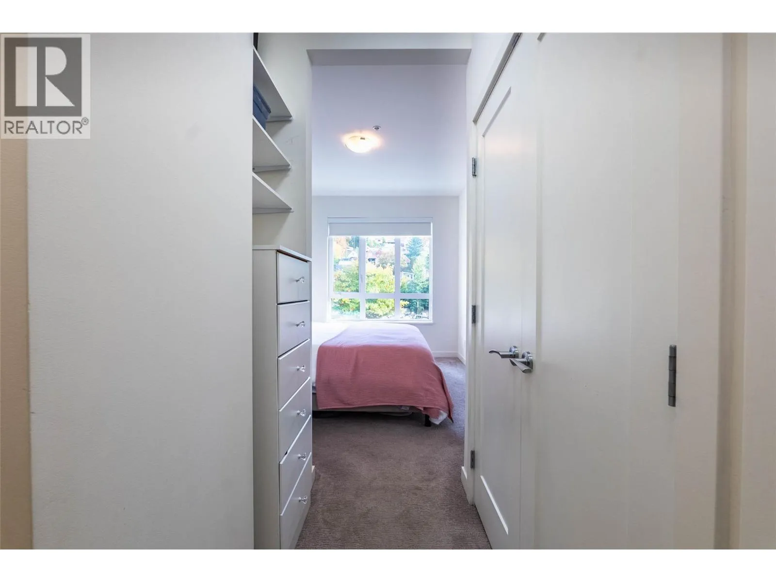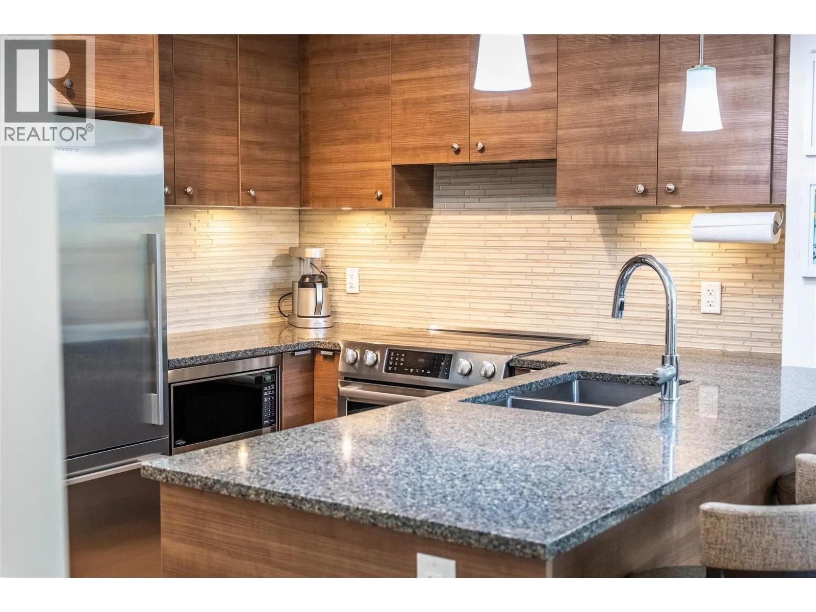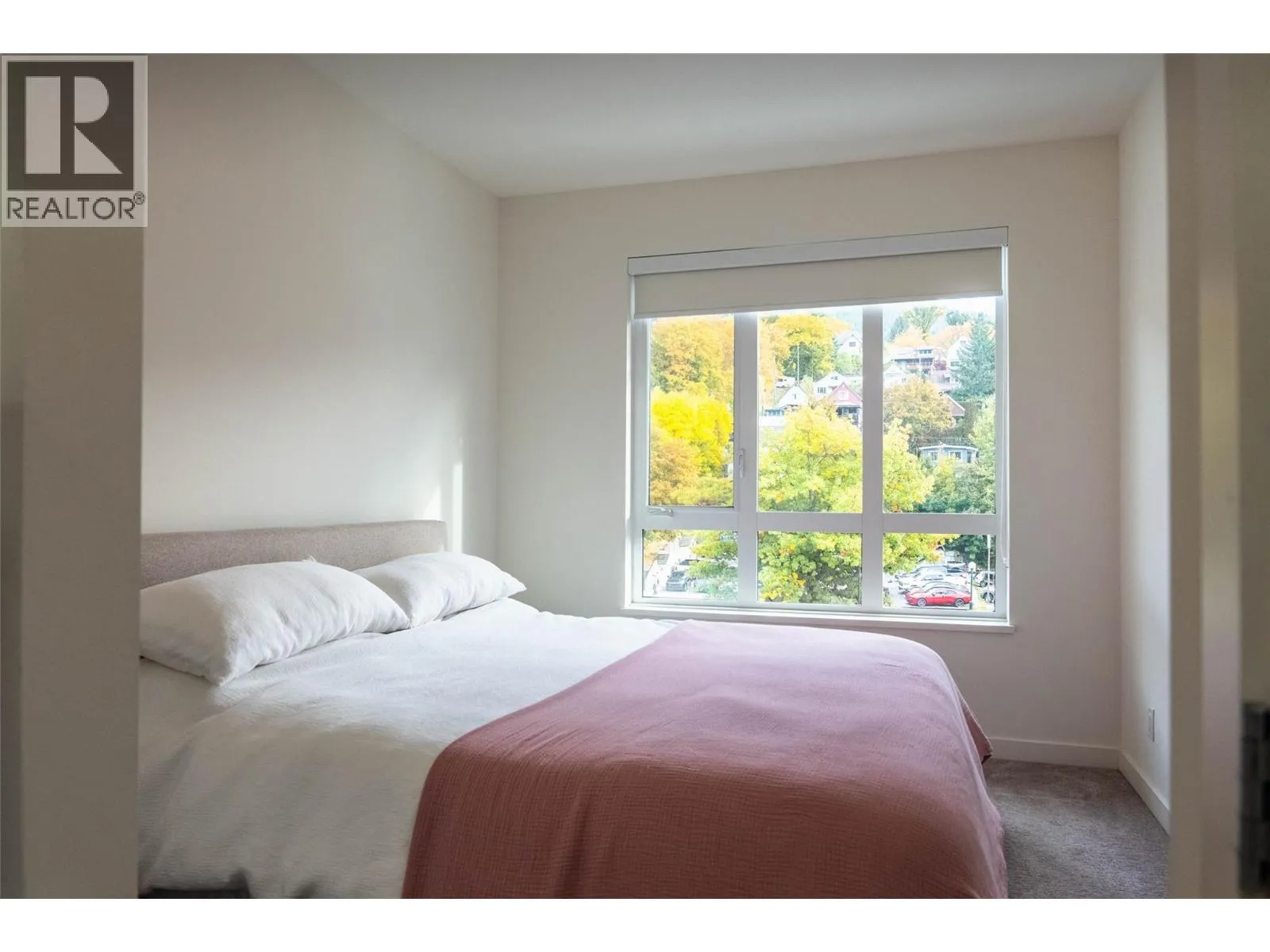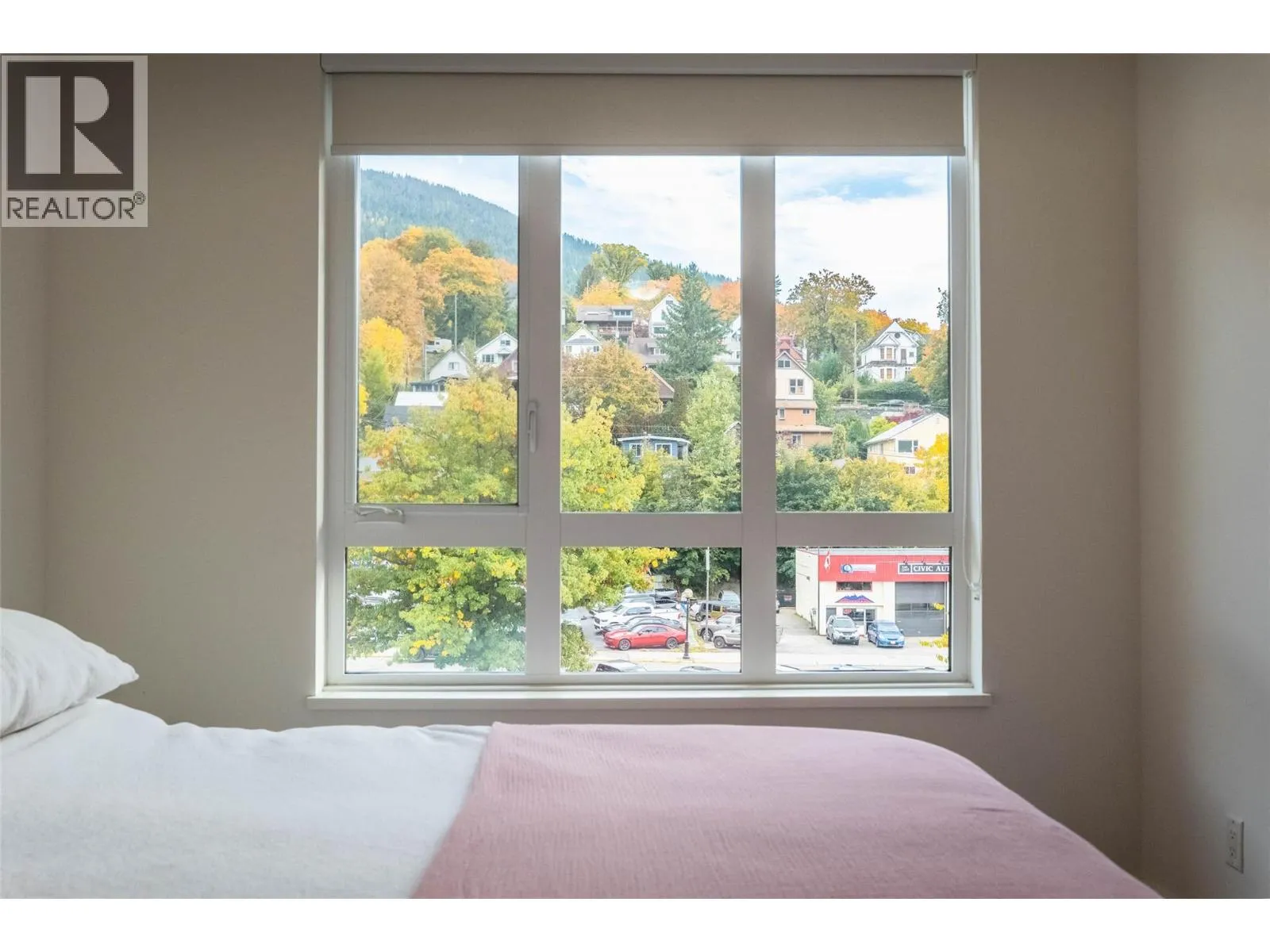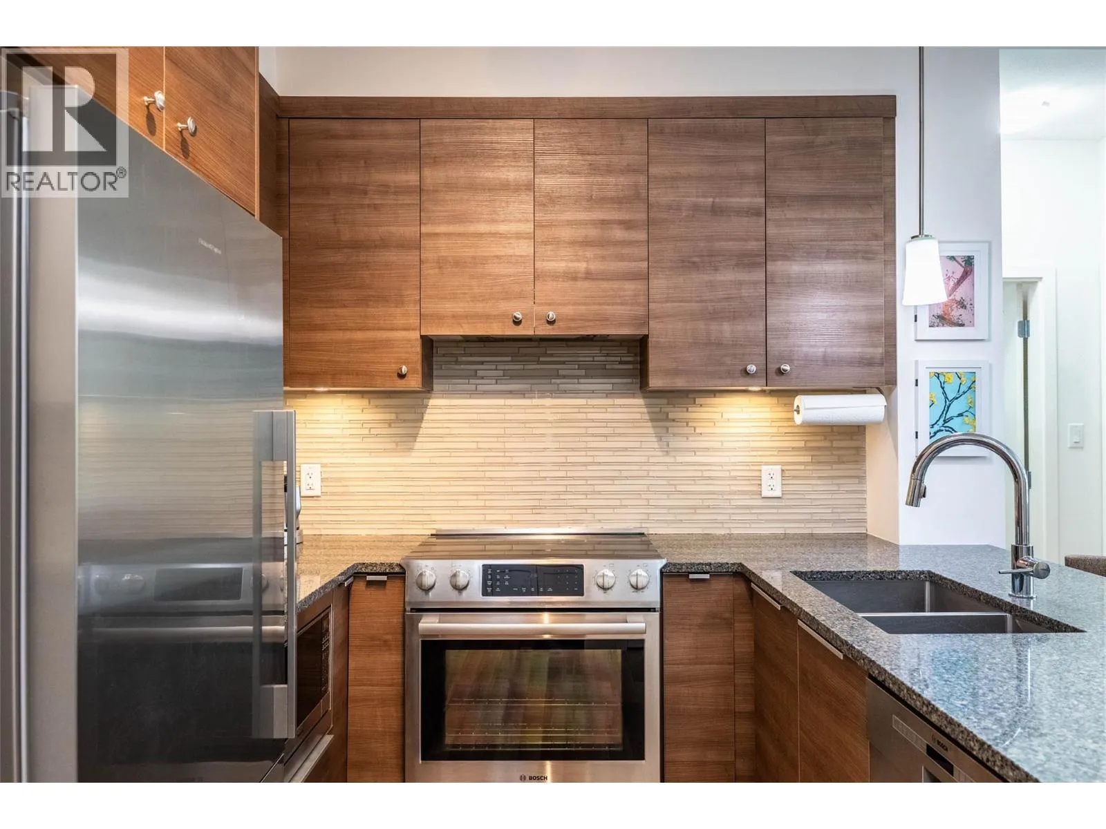 Welcome to the highly sought-after Nelson Commons at 710 Vernon St, where this immaculate two-bedroom plus den, two-bathroom unit offers the perfect blend of modern convenience and sophisticated downsizing. Situated on the top floor, you'll enjoy the peace and quiet of having no one living above you, a premium feature that elevates this unit above the rest and allows for overheight celings in the main living area. Built in 2016, the 868 square foot home features an open-concept living space flooded with natural light, ideal for entertaining or quiet relaxation. The kitchen boasts sleek stainless steel appliances and flows seamlessly into the main area, while the private balcony provides a tranquil outdoor retreat with a dedicated natural gas hookup for easy, year-round grilling. The versatile den is perfect for a home office, hobby room, or storage. Practicality meets luxury with in-unit laundry, a secure underground parking stall, and a private storage locker. The star feature is the unbeatable location: step outside and you are within a single block of a major grocery store, pharmacy, medical clinic and restaurants, dramatically simplifying daily errands and offering an unparalleled walkable urban lifestyle. Experience the ultimate in comfort and quality in a building that sets the benchmark for contemporary living in Nelson. (id:27476)