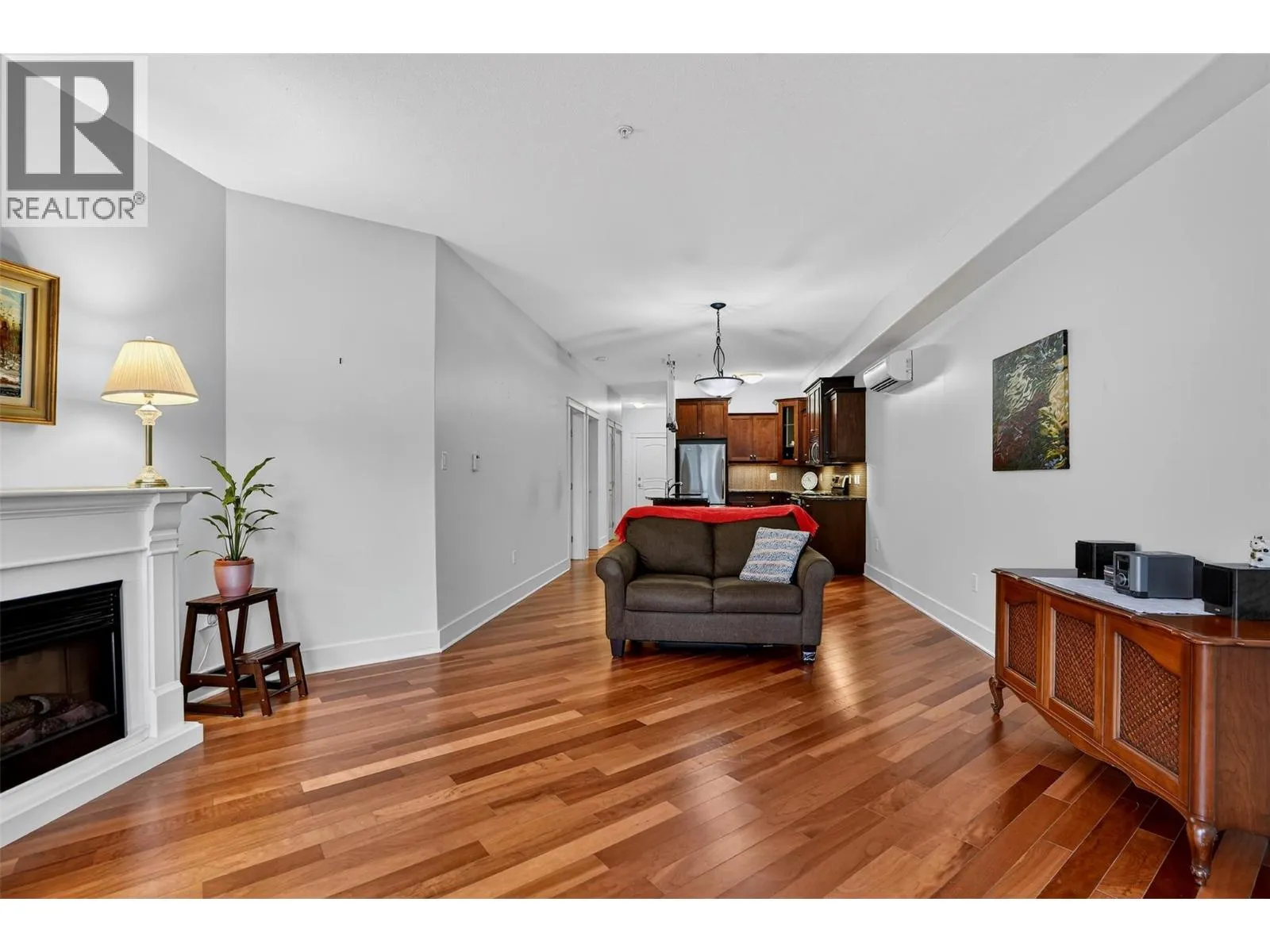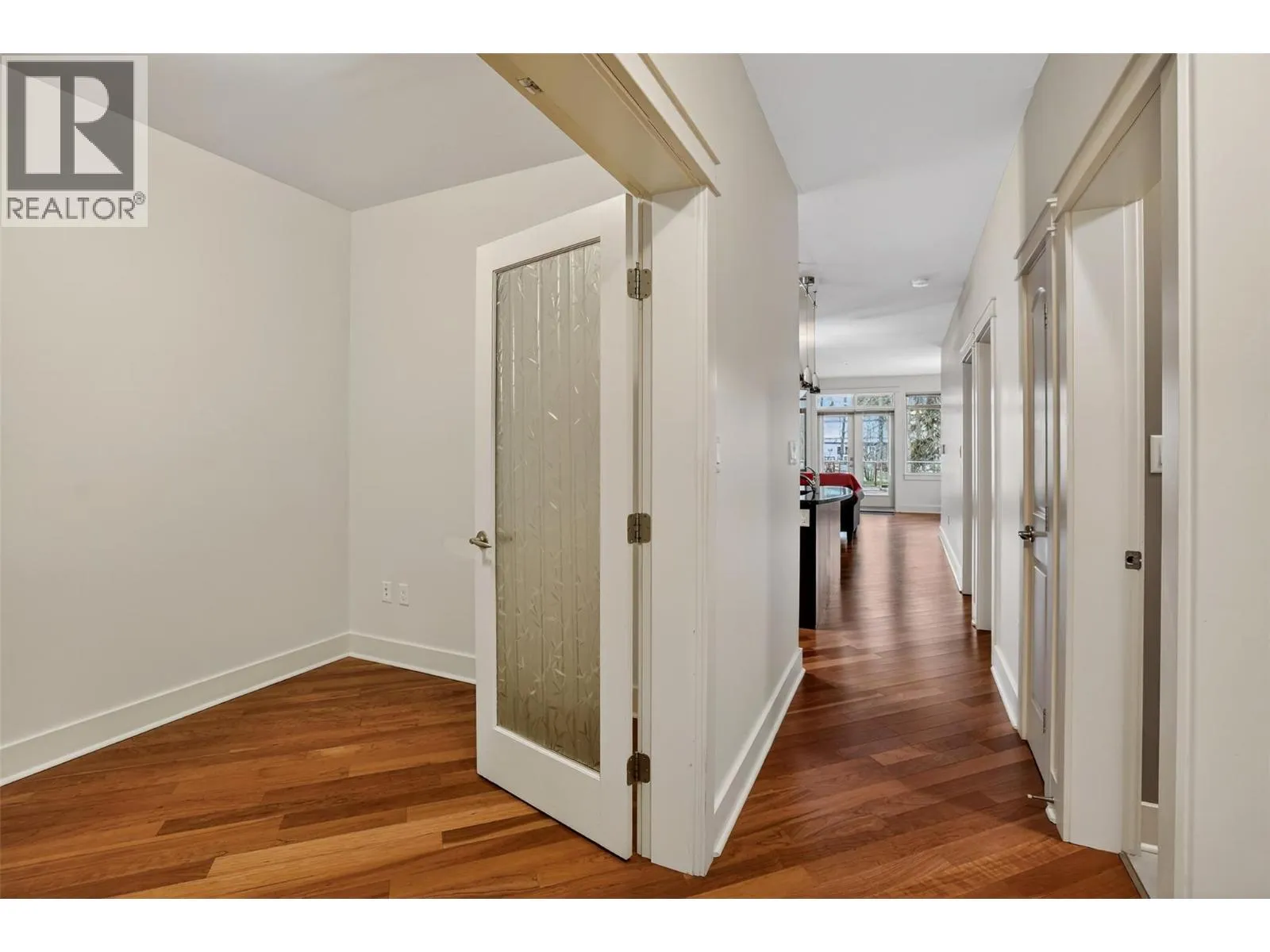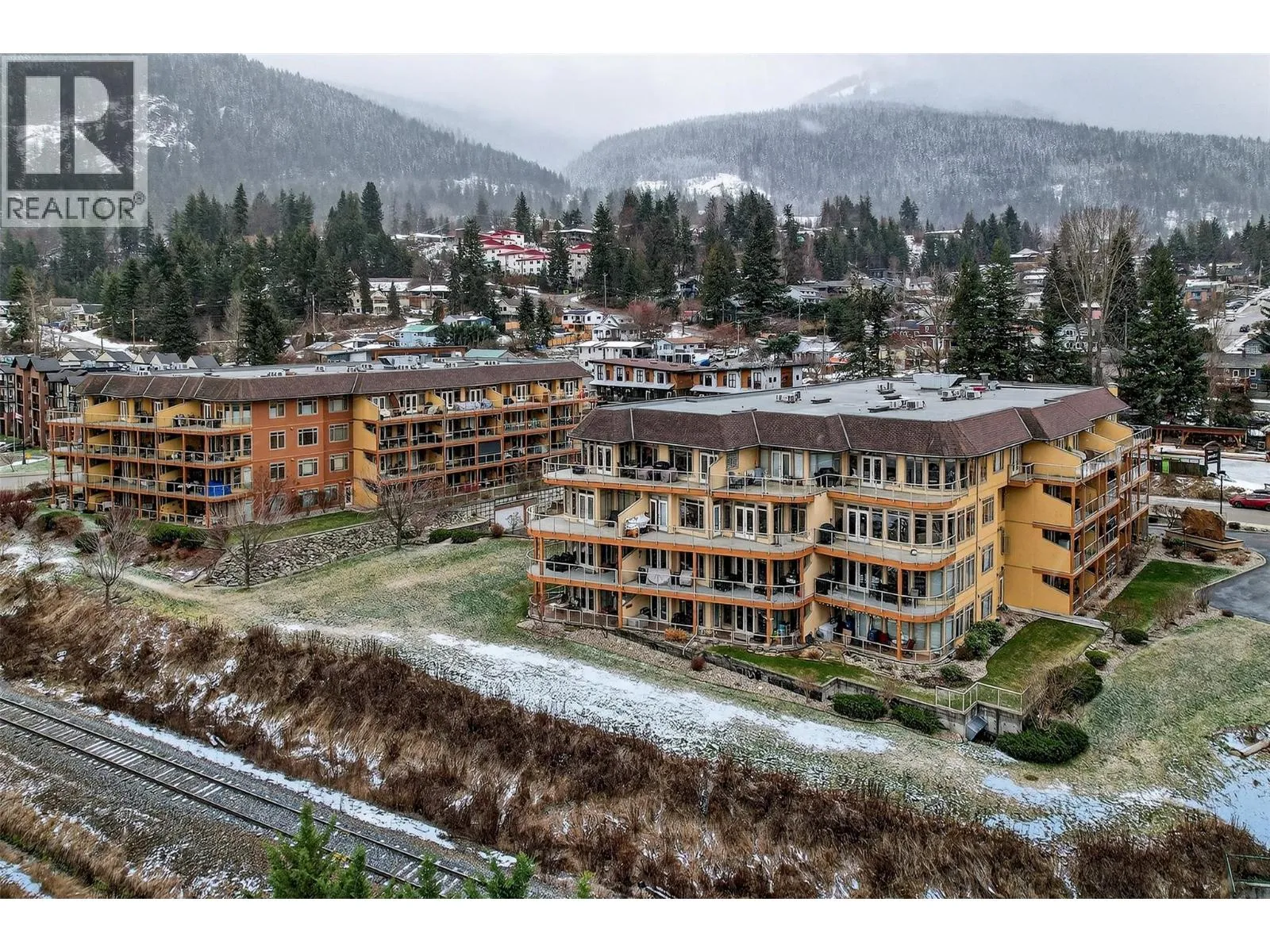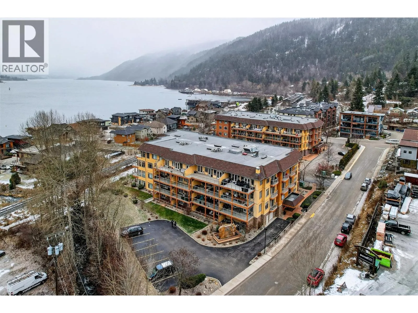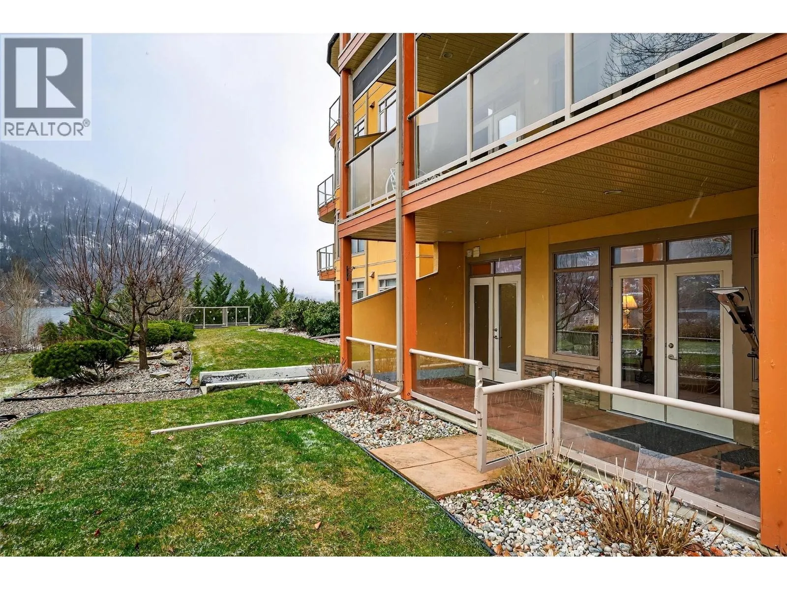 Experience sophisticated living in this exquisite main floor unit, ideally situated in the much loved Fairview neighbourhood of Nelson. This immaculate 1 bedroom plus den residence is a true gem, featuring a comprehensive upgrade package that defines modern elegance. Revel in the warmth of cherry wood cabinets and rich hardwood flooring, complemented by a gourmet gas range and granite countertops. Located on the ground floor with separate entrance will give you total privacy and easy one floor living. This thoughtfully designed space with overheight ceilings is equipped with air conditioning for your comfort and an electric fireplace that adds a touch of coziness. The unit boasts a private walk-out covered patio with gas BBQ hookup, seamlessly connecting you to the meticulously landscaped grounds, perfect for serene outdoor living. Included are secure underground parking and a separate storage locker, ensuring your convenience and lifestyle needs are met. Residents enjoy exclusive access to a beautifully appointed common meeting room and washroom for events. Indulge in a lifestyle that merges luxury with recreation, all within moments of the stunning lakeside setting, walking path and the famous L and C French bakery cafe. Donât miss the opportunity to claim this exceptional residence as your own. (id:27476)