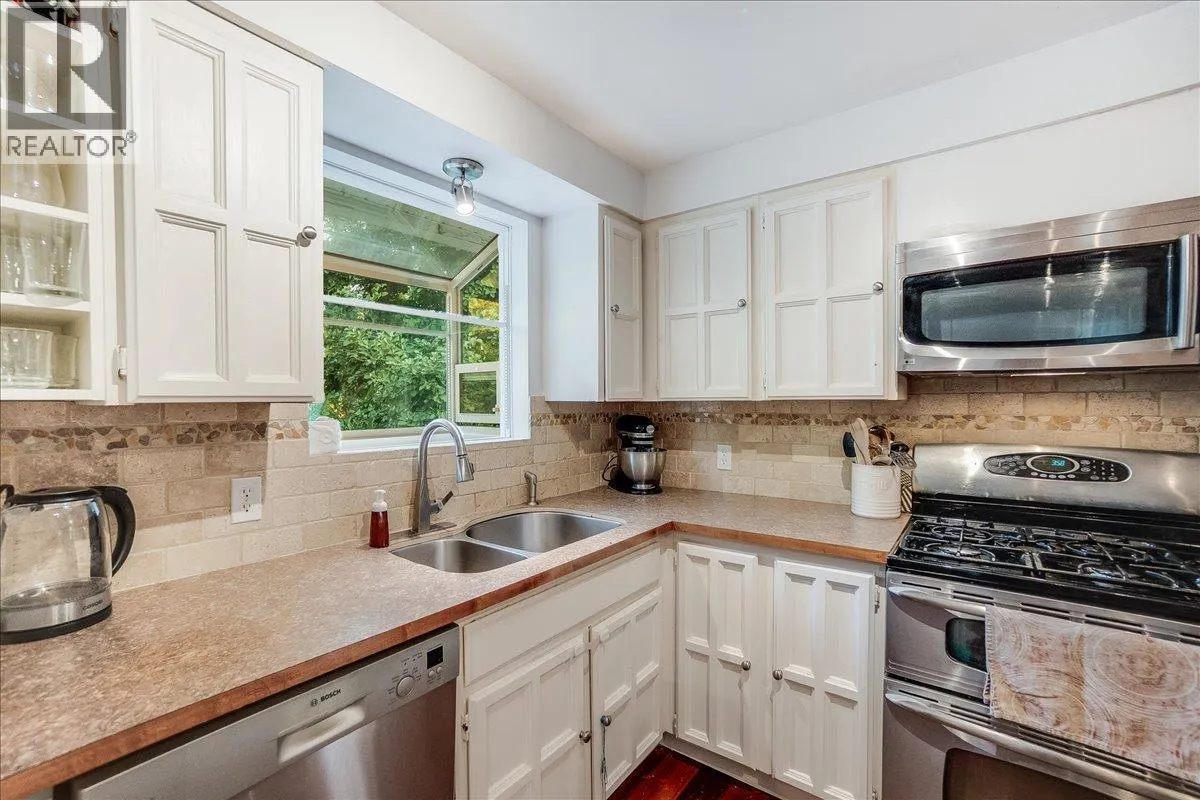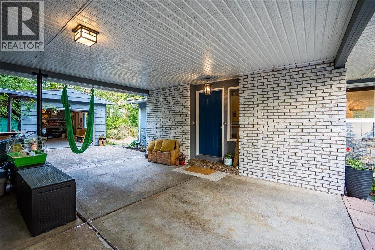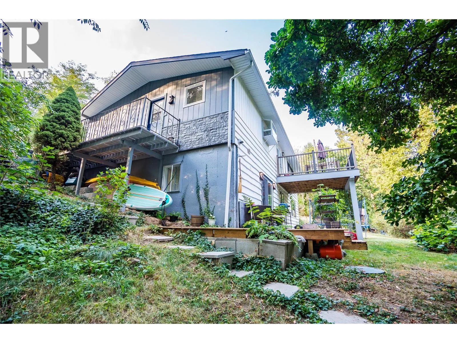 This well-kept 3-bedroom, 3-bath family home has been extensively updated and has a wonderful inviting feel. The main level features a spacious entry, a custom kitchen with a large island and breakfast bar, stainless steel appliances including a gas stove, and a living room highlighted by a stone fireplace. Mahogany hardwood floors, custom wrought iron railings, and quality finishes throughout add to its charm. The primary bedroom includes a 3-piece ensuite, with a second bedroom and a full bath completing the main floor. The lower level has been partially converted into a cozy two bedroom in-law suite with in suite washer & dryer, a walk-out glass door to a private deckâperfect for extended family or guests. Additional lower-level spaces include a family room, storage/laundry, and nook. Outside, enjoy decks, terraced yard with mature landscaping plus a paved driveway with an attached carport and detached single garage. Located close to beautiful beaches and 15 minutes from Nelson at Six Mile on the North shore. (id:27476)