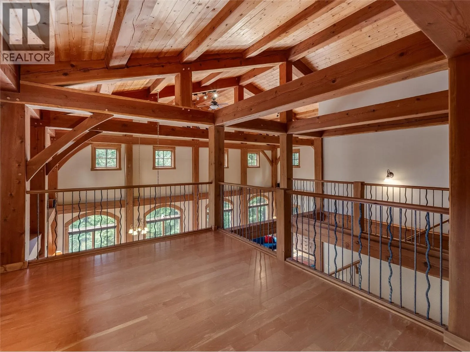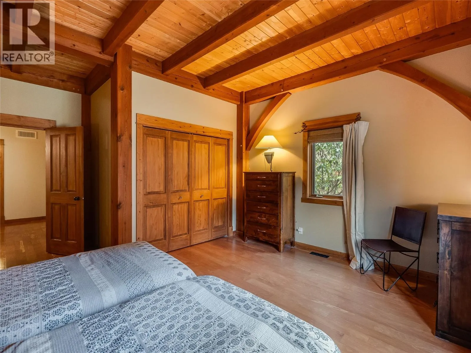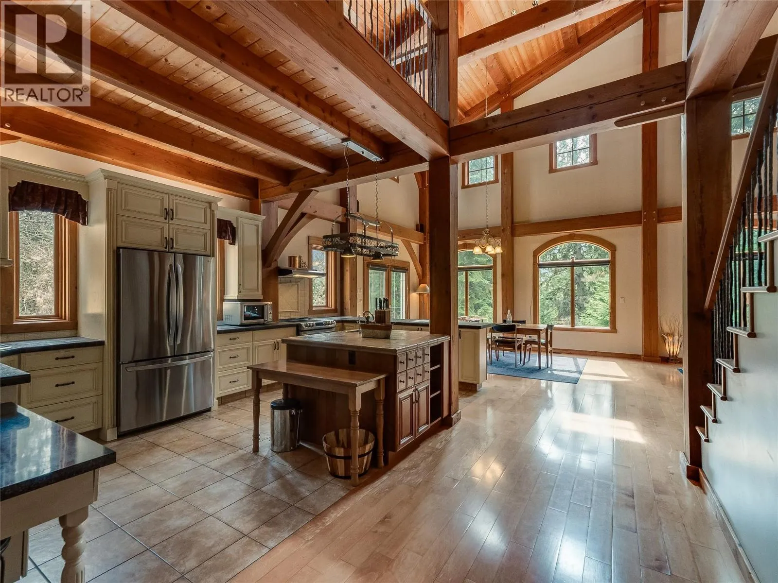 Welcome to 3179 Heddle Road. This custom crafted timber frame home features spectacular 24- foot vaulted ceilings and rests on a professionally landscaped, level, 1.25 acre lot 15 minutes from Nelson on the North Shore of Kootenay Lake. The home offers a well-designed open floor plan and plenty of living area that includes 5-6 bedrooms (three on the main floor), and 5 bathrooms, including a newly installed main-floor walk-in shower. The in-floor heating throughout has recently been updated from electric to gas. Quality finishes complement this post and beam structure with arched windows, hardwood and porcelain tile flooring throughout, and a gourmet kitchen with island open to the living and dining rooms, and main floor deck area, perfect for entertaining guests. There is a spacious double garage with a fully contained studio guest suite above, The backyard is an attractive outdoor living space, including stone patio, landscaped gardens and a forested area. Now priced lower than BC Assessment, this home offers outstanding value to a buyer looking for high quality finished space for a large or extended family, with the option to earn income from the secondary suite. (id:27476)