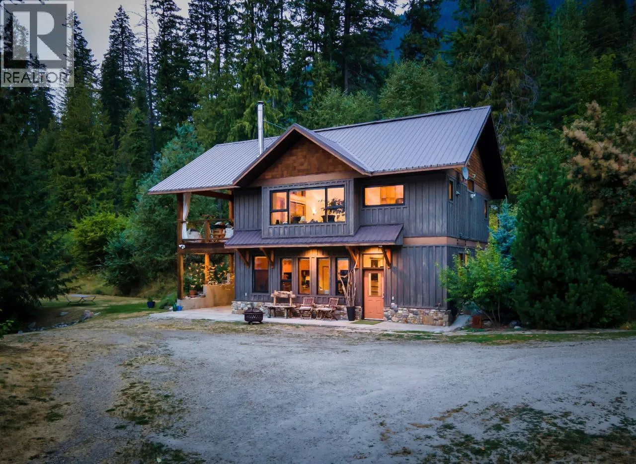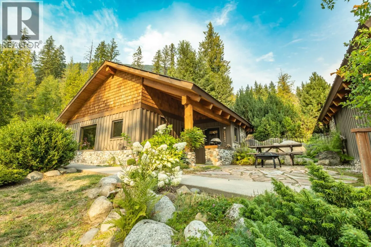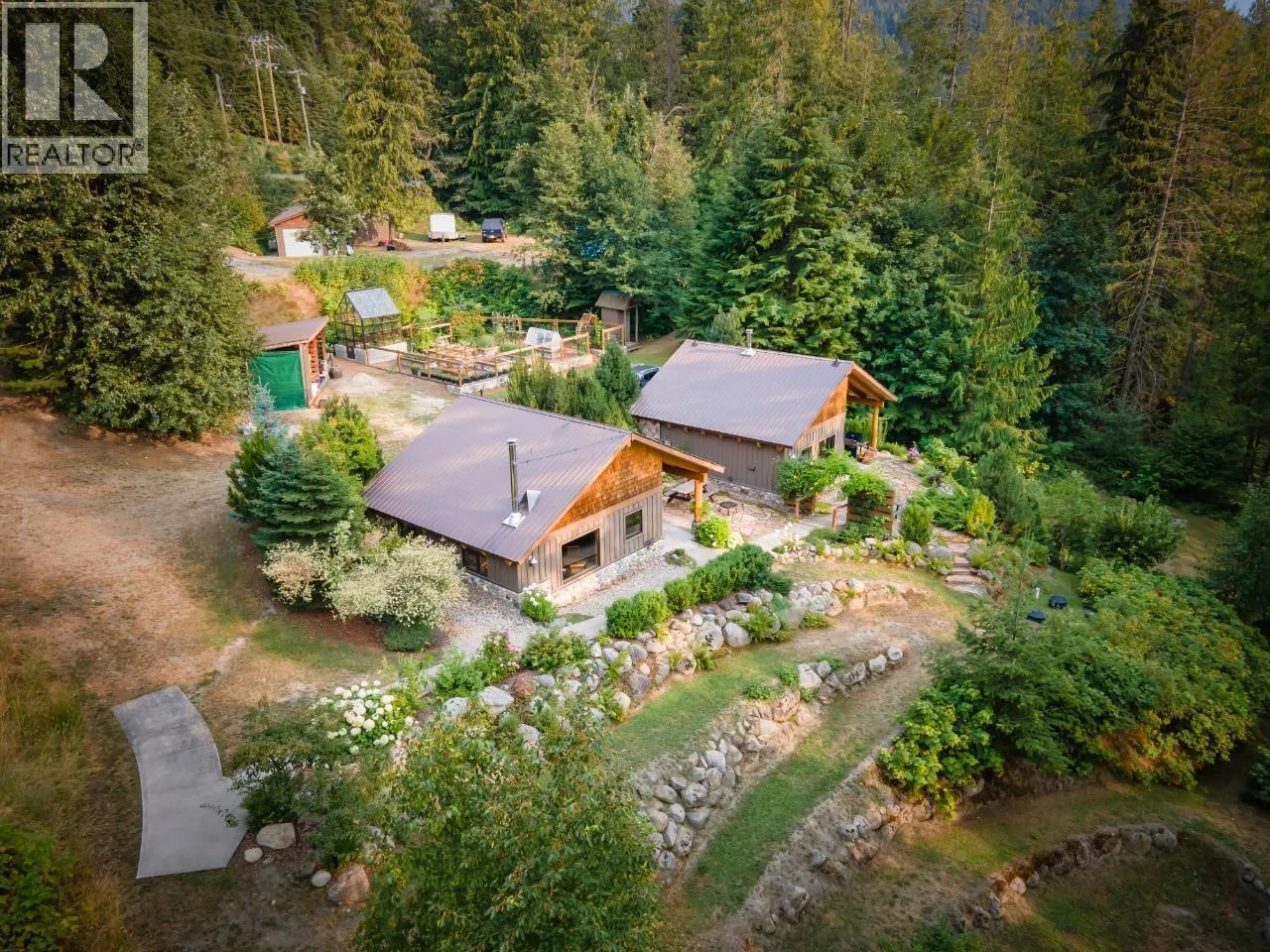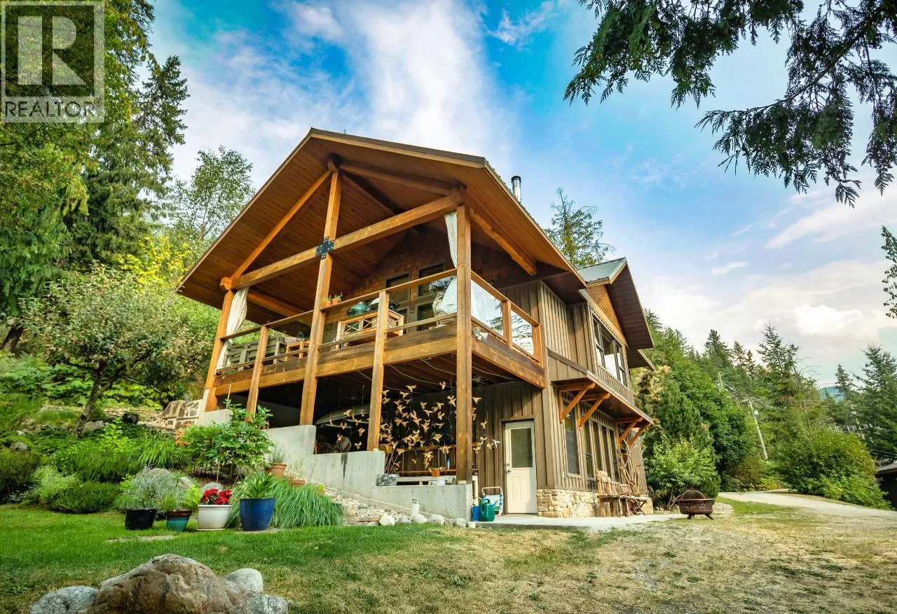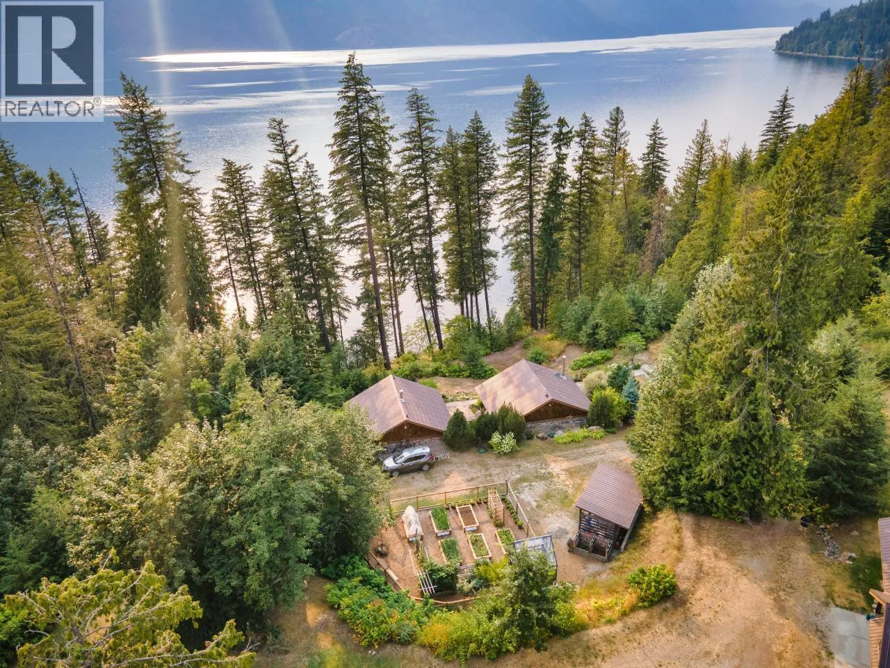 Beautiful 3.5+ acre dream-like waterfront property with 275 feet of gorgeous shoreline on Slocan Lake bordering the town of New Denver. The property includes a 1,578-square-foot two-story main residence, two vacation rental cabins, a new studio office, an RV site (or future building site that has a septic system in place). The main home has two bedrooms and two bathrooms, a 26 x 12 covered deck, a wood stove, an open floor plan, vaulted ceilings on the main floor, and a lower level walk-out, updated custom cabinetry and Murphy bed for guests, plus an attached carport. The two cabins (Freya & Loki) are well separated from the main home and are perched nicely to take in the views of Slocan Lake, New Denver Glacier, and the Valhalla Mountain Range. The beautiful hand-crafted cabins are very private, wheelchair accessible, have wood stoves, full kitchens, washers/dryers, and internet, and have provided great rental income. There is also a 24 x 16 detached garage, a 10 x 16 shed, a wood shed, a hot tub, a large fenced raised garden, and a greenhouse with a built-in root cellar. This property has been lovingly landscaped and there are numerous gardens, pathways, patios, and private lawn areas throughout. The 275 feet of waterfront bordering Bigelow Bay Regional Park is great for swimming, paddle boarding, and all other summer activities. (id:27476)