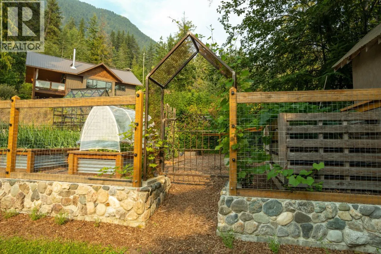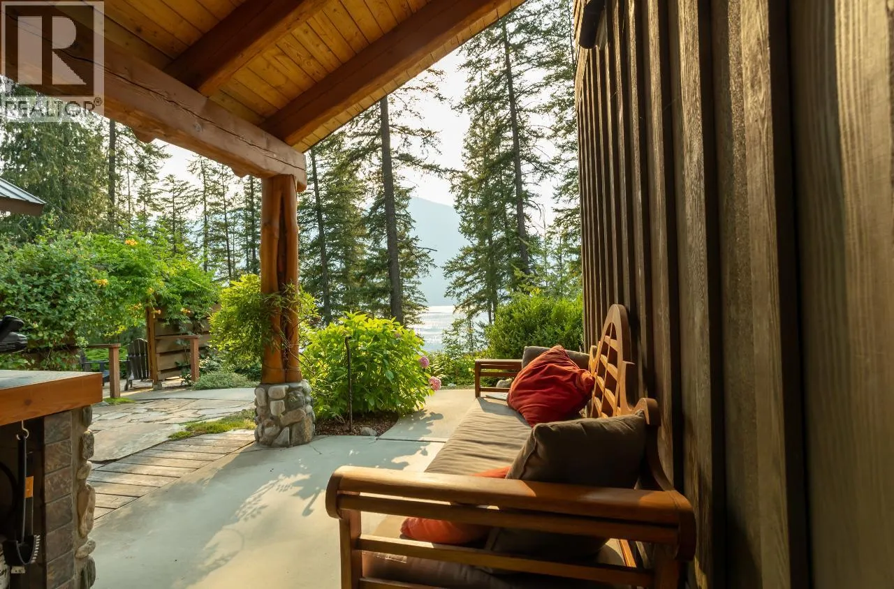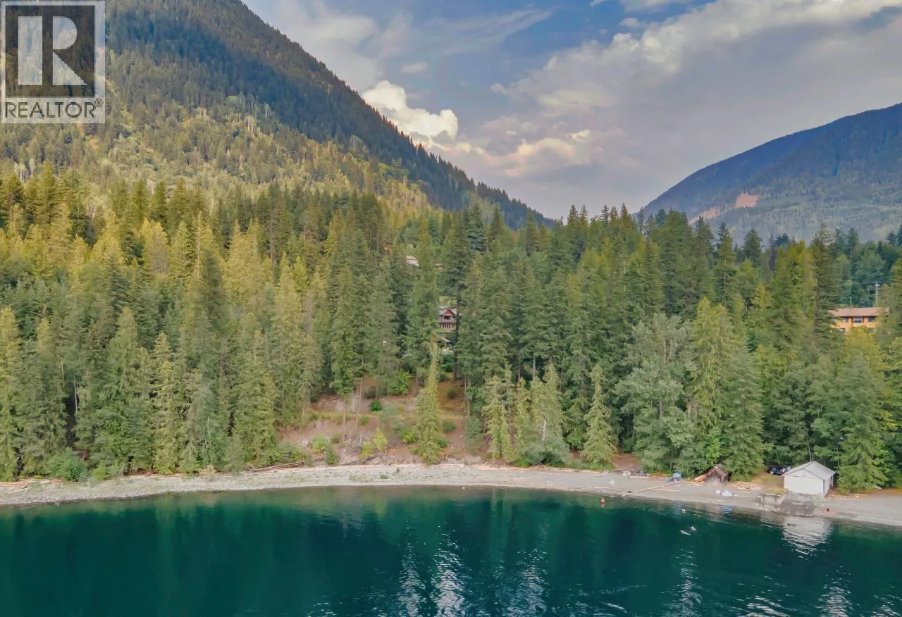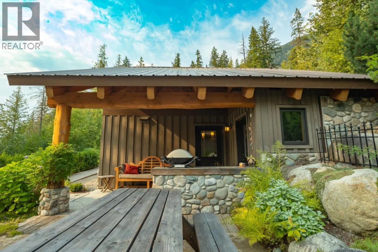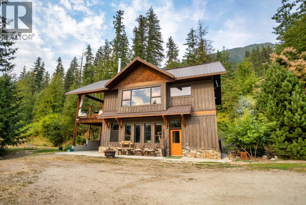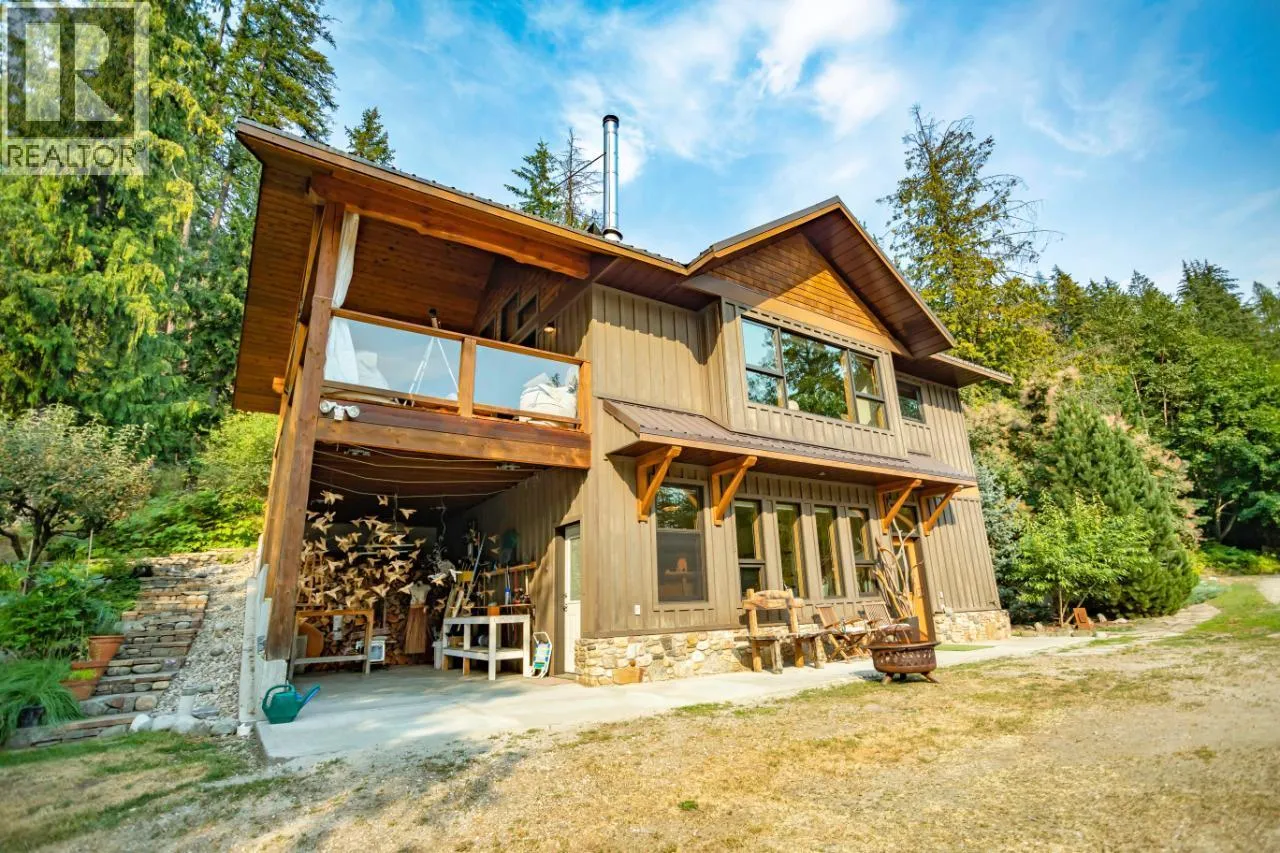 Beautiful 3.5+ acre dream-like waterfront property with 275 feet of gorgeous shoreline on Slocan Lake bordering the town of New Denver. The property includes a 1,578-square-foot two-story main residence, two vacation rental cabins, a new studio office, an RV site (or future building site that has a septic system in place). The main home has two bedrooms and two bathrooms, a 26 x 12 covered deck, a wood stove, an open floor plan, vaulted ceilings on the main floor, and a lower level walk-out, updated custom cabinetry and Murphy bed for guests, plus an attached carport. The two cabins (Freya & Loki) are well separated from the main home and are perched nicely to take in the views of Slocan Lake, New Denver Glacier, and the Valhalla Mountain Range. The beautiful hand-crafted cabins are very private, wheelchair accessible, have wood stoves, full kitchens, washers/dryers, and internet, and have provided great rental income. There is also a 24 x 16 detached garage, a 10 x 16 shed, a wood shed, a hot tub, a large fenced raised garden, and a greenhouse with a built-in root cellar. This property has been lovingly landscaped and there are numerous gardens, pathways, patios, and private lawn areas throughout. The 275 feet of waterfront bordering Bigelow Bay Regional Park is great for swimming, paddle boarding, and all other summer activities. (id:27476)