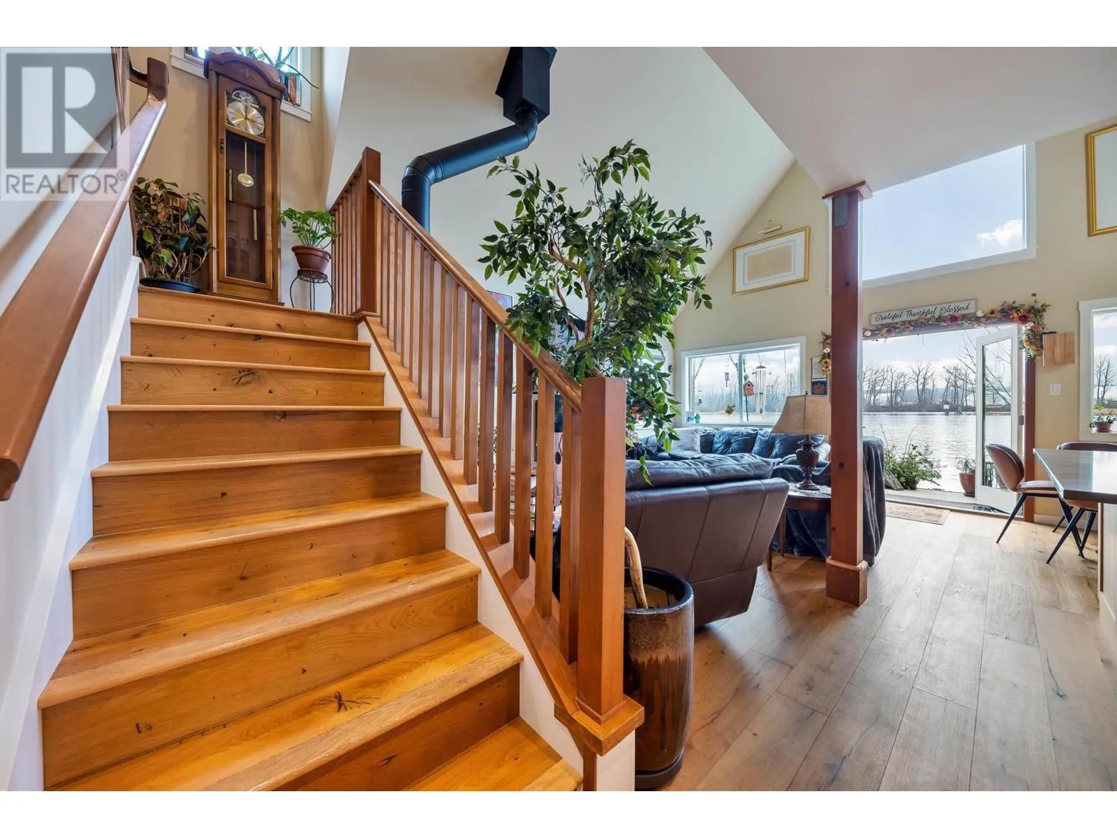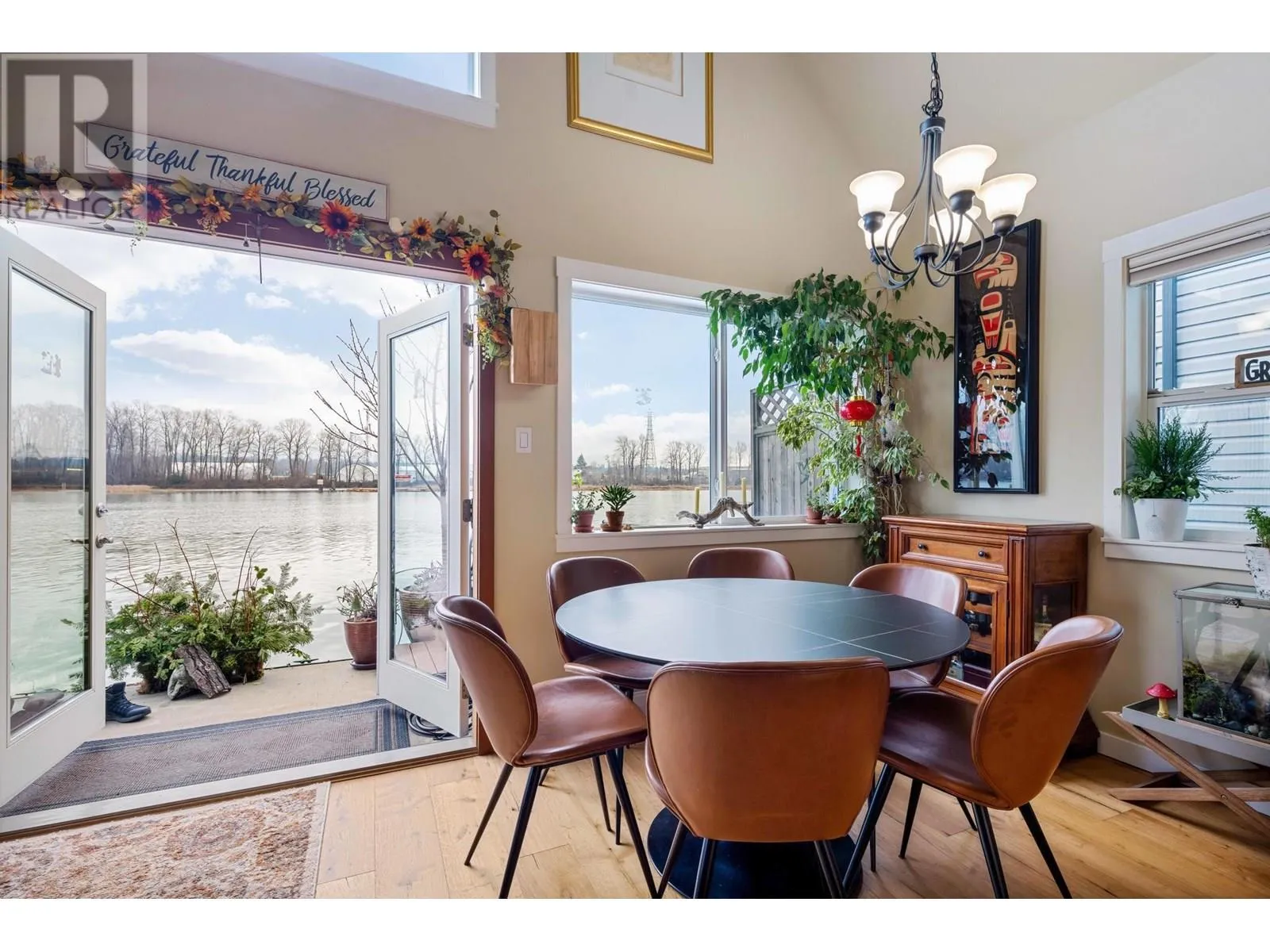 Rare opportunity to own a freehold water lot with a 3 bed 2 bath float home in an exclusive marina community. Just 10 years old, this AJIA Custom-built Craftsman offers vaulted ceilings, open living, and energy-efficient design that feels like 1500sf. Enjoy stunning sunrises and sunsets, or fish for all species of salmon and sturgeon right from your dock. Rich wood accents bring warmth and harmony with nature. Includes hot tub, float, kayaks, and boat-ready for your waterfront lifestyle. Host guests on the 450sf commercial float or relax in the hot tub with panoramic views. Located on a deeded bare land strata foreshore (no moorage fees), with 1 parking stall and ample street parking. (id:27476)