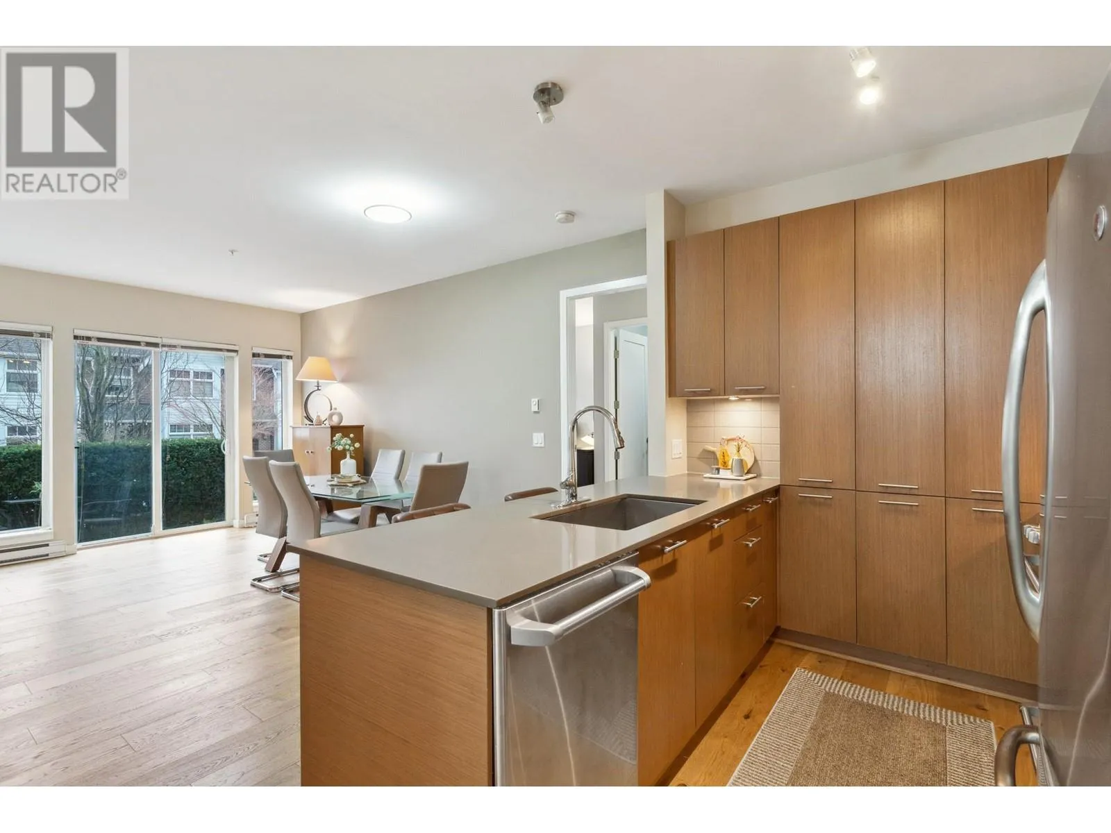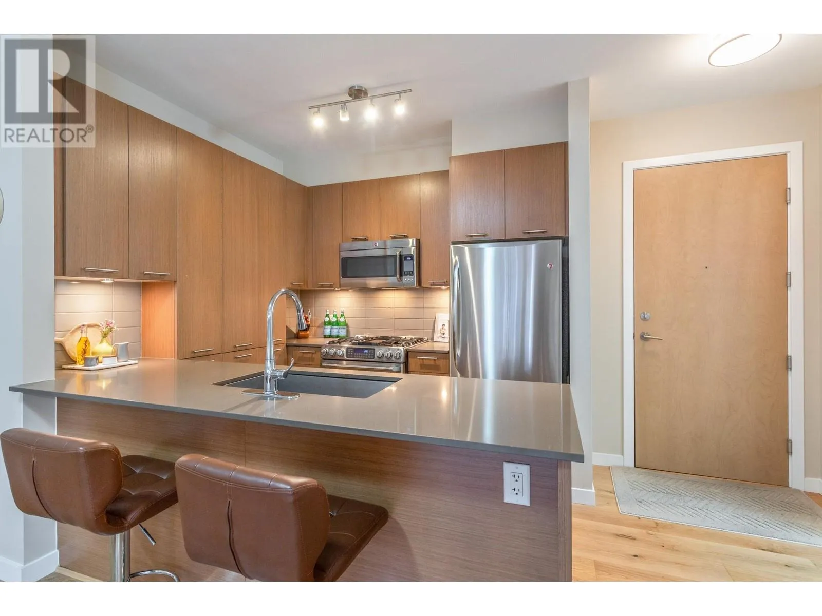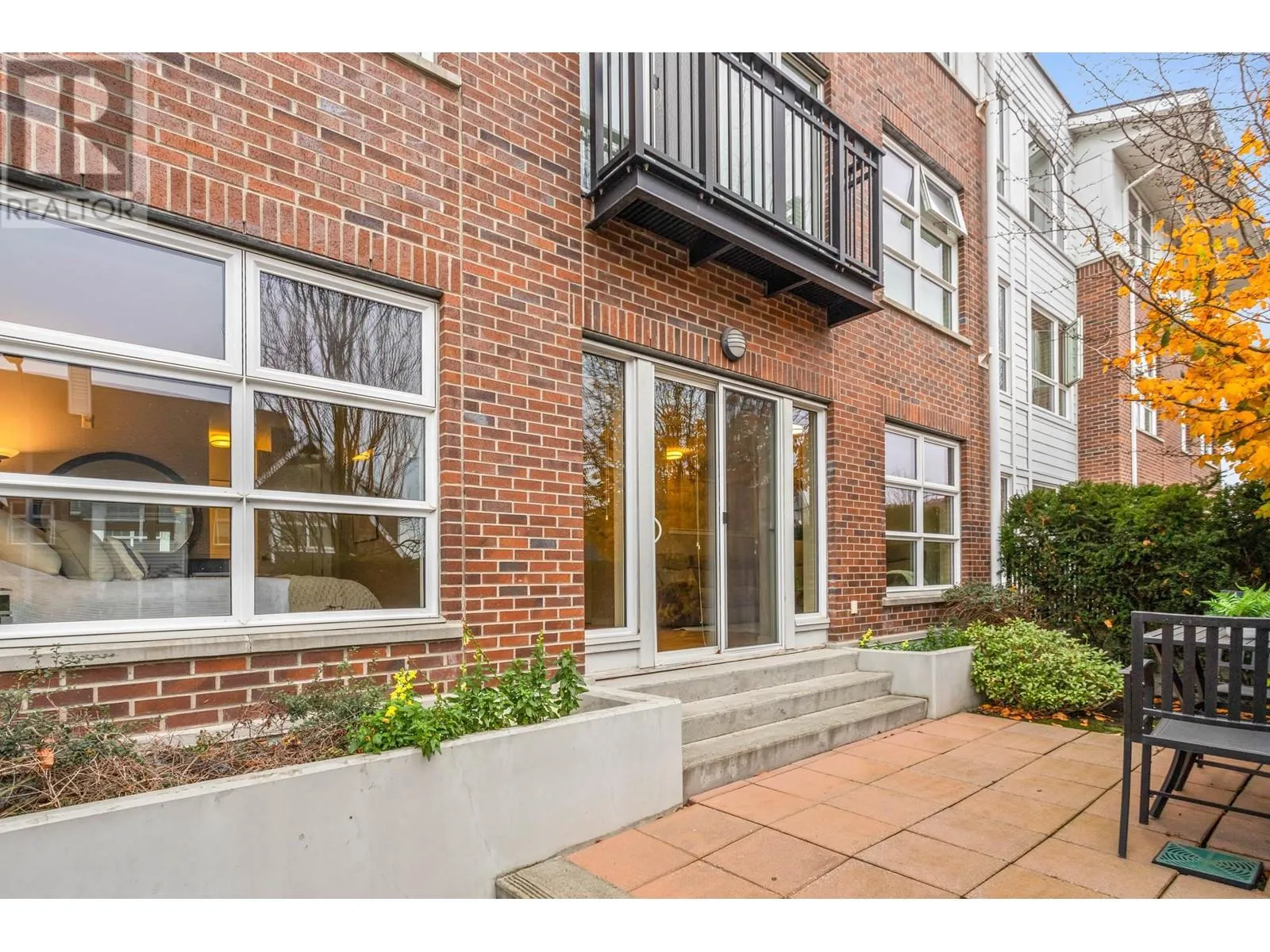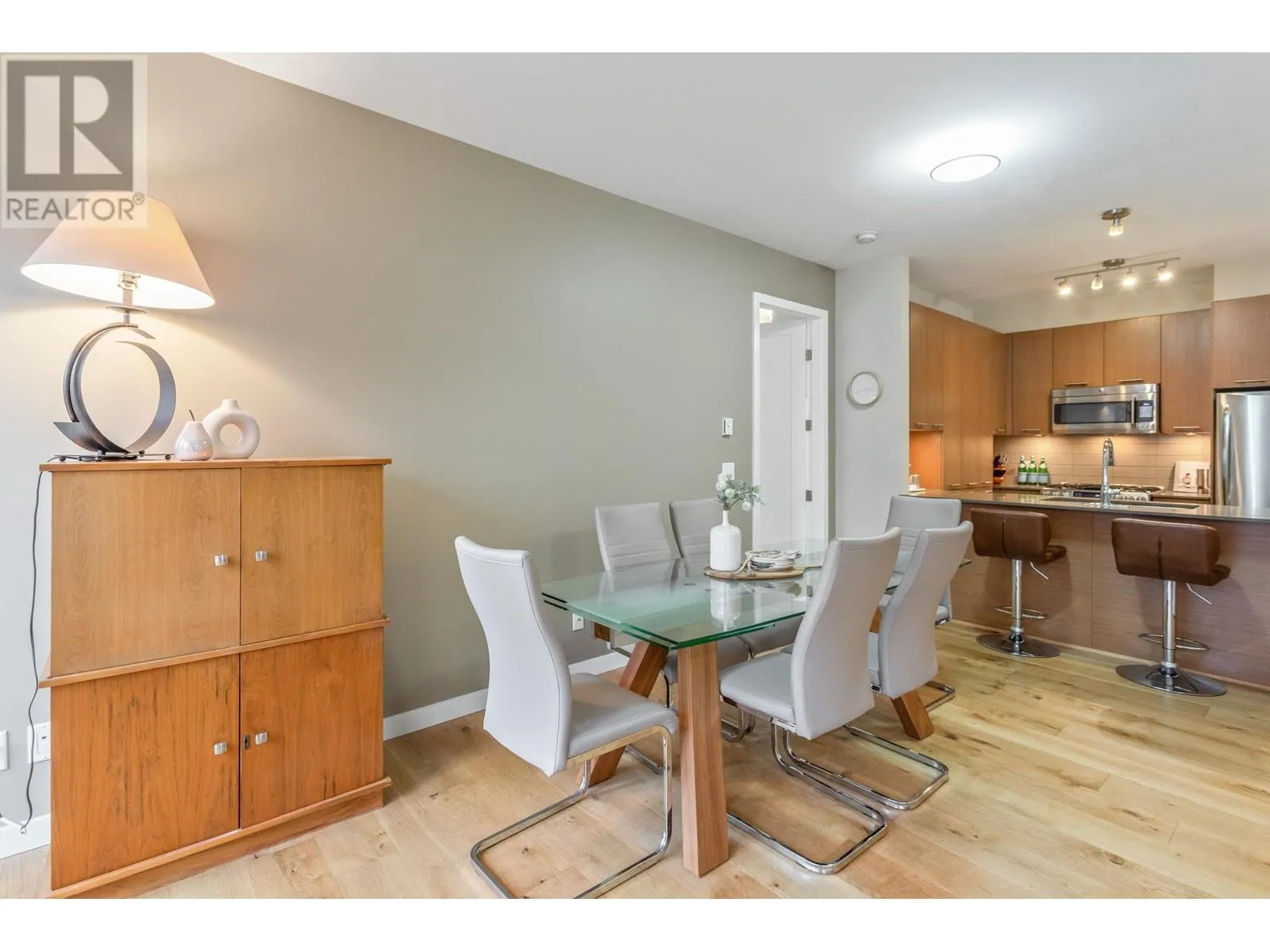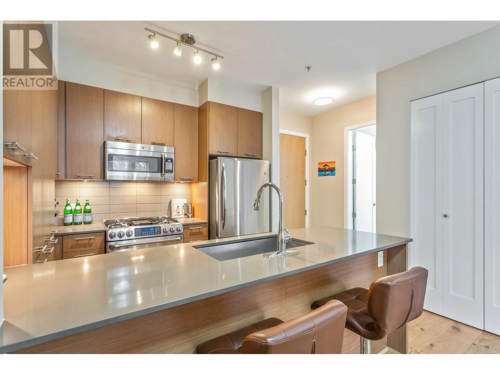 This thoughtfully designed townhome-style 2-bedroom, 2-bathroom home is nestled in the sweetest family-oriented community, filled with parks, playgrounds, waterfront trails & in close proximity to transit, Q2Q ferry & amenities. Boasting the largest floor plan in the building, this home offers an open-concept plan with chef´s kitchen, featuring s/s appliances + gas range, & beautiful updated hardwood floors throughout. Spacious primary bedroom with ensuite & double closets, second bedroom & bath, + laundry room with extra storage. Enjoy seamless indoor-outdoor living with sliding door access to private 176 sq. ft. patio with convenient gated street access. Additional perks incl. rooftop BBQ / community garden, exercise room, secure parking, visitor parking & storage locker. Nothing to do, but move-in! (id:27476)