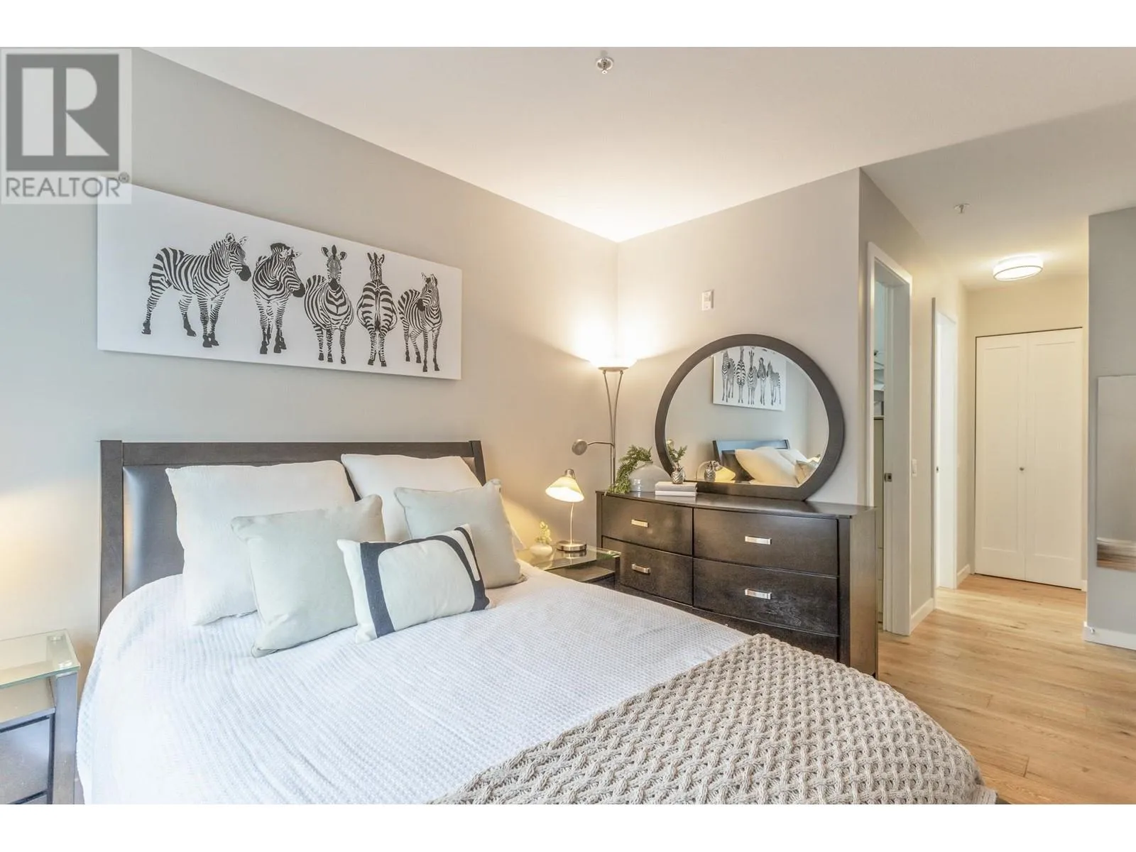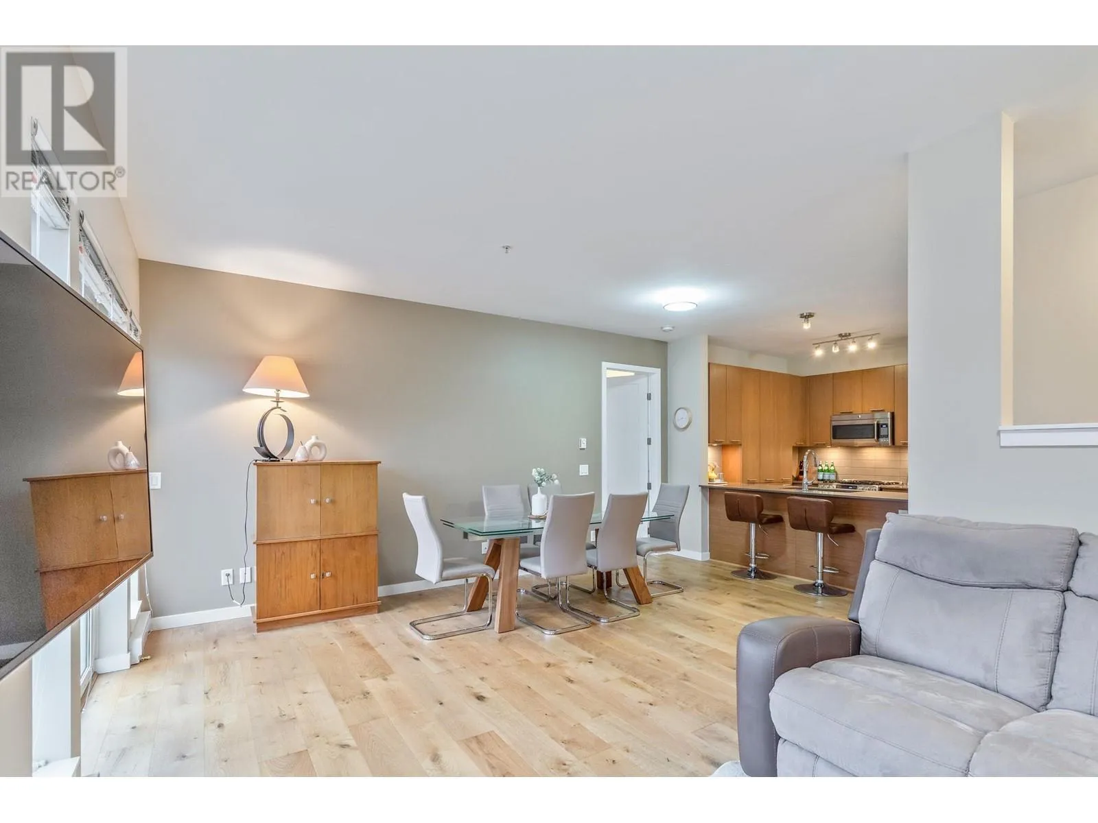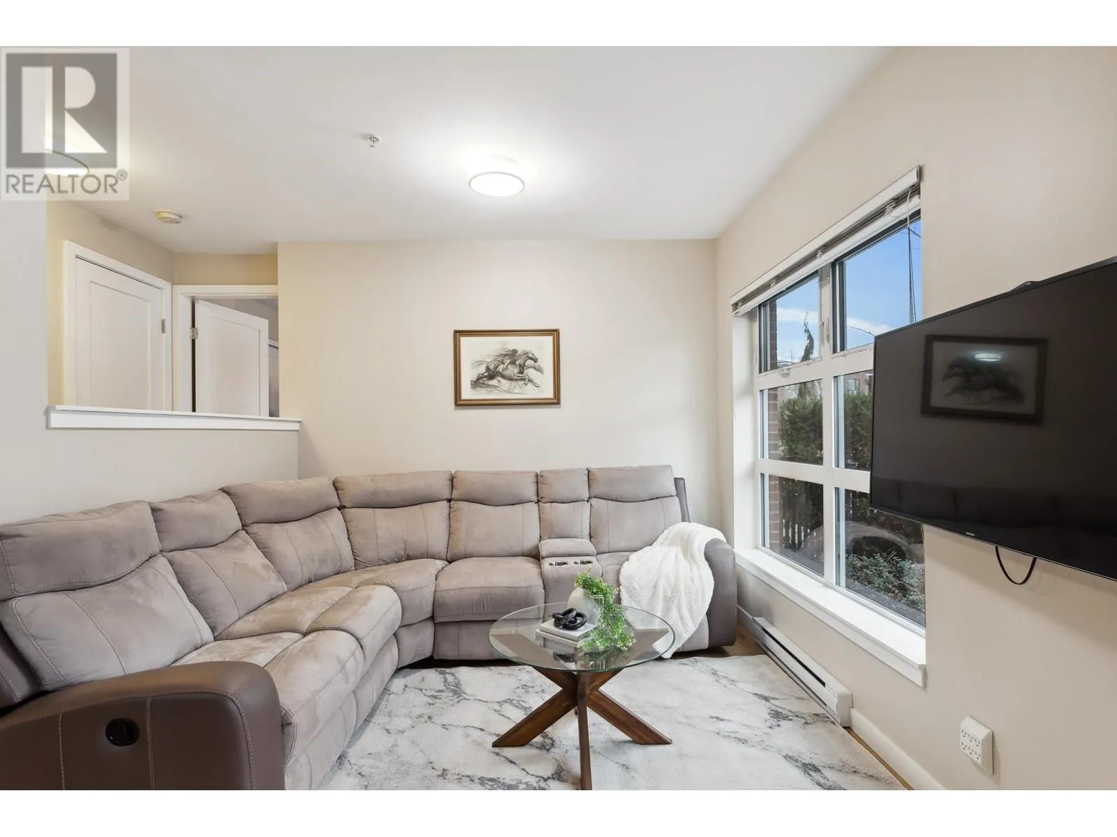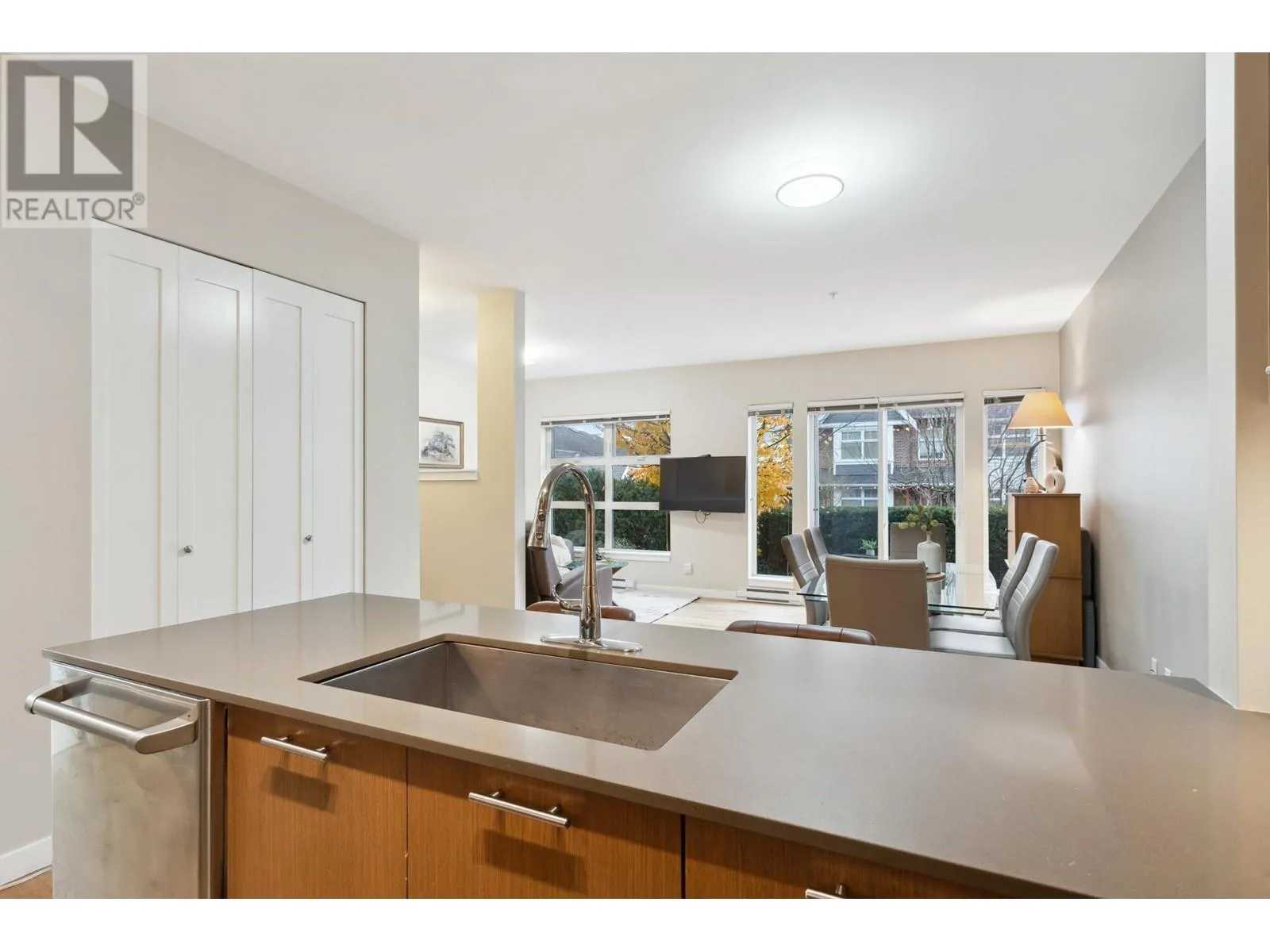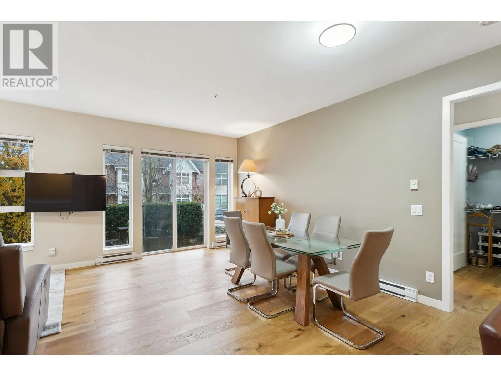 This thoughtfully designed townhome-style 2-bedroom, 2-bathroom home is nestled in the sweetest family-oriented community, filled with parks, playgrounds, waterfront trails & in close proximity to transit, Q2Q ferry & amenities. Boasting the largest floor plan in the building, this home offers an open-concept plan with chef´s kitchen, featuring s/s appliances + gas range, & beautiful updated hardwood floors throughout. Spacious primary bedroom with ensuite & double closets, second bedroom & bath, + laundry room with extra storage. Enjoy seamless indoor-outdoor living with sliding door access to private 176 sq. ft. patio with convenient gated street access. Additional perks incl. rooftop BBQ / community garden, exercise room, secure parking, visitor parking & storage locker. Nothing to do, but move-in! (id:27476)