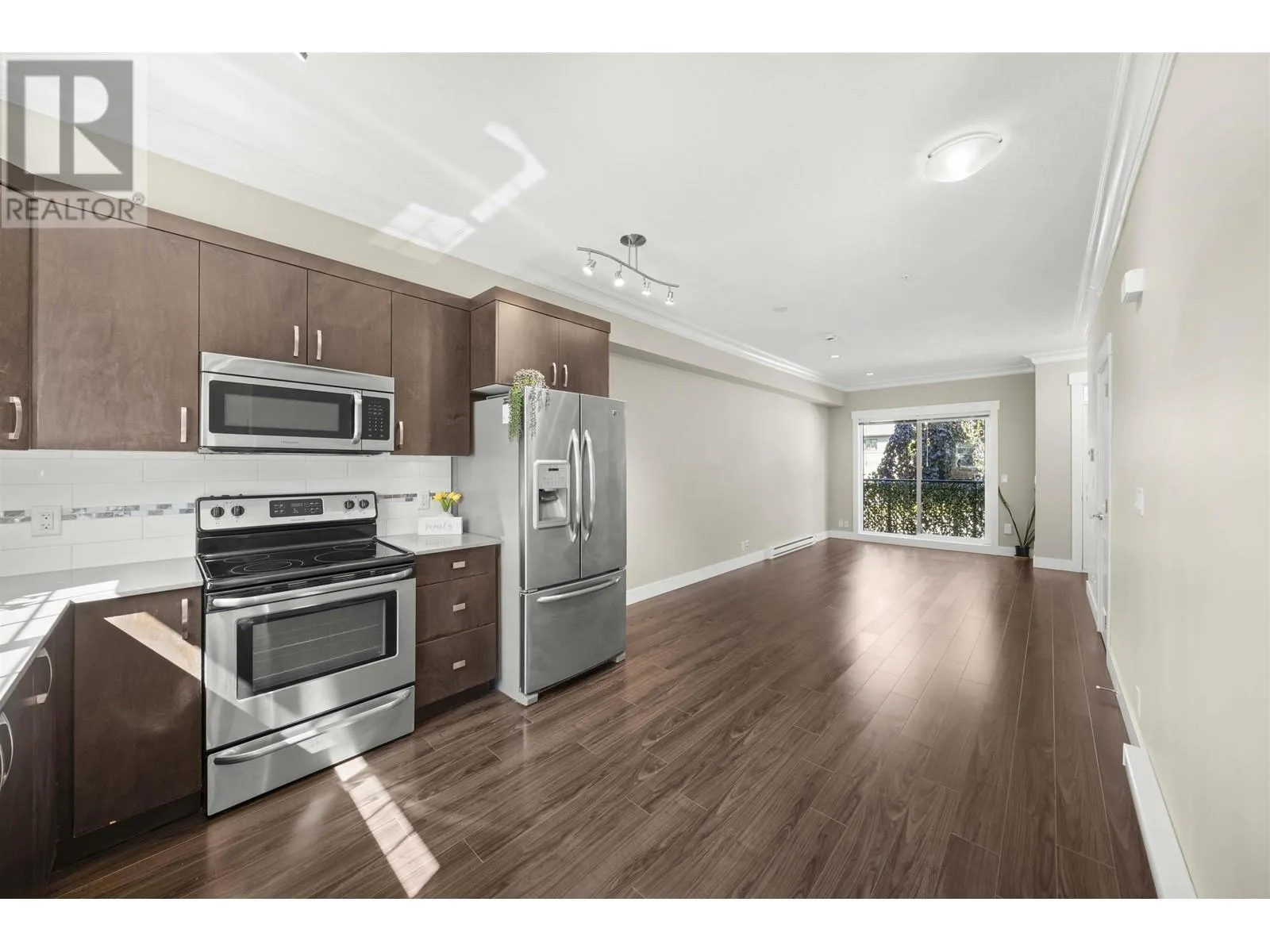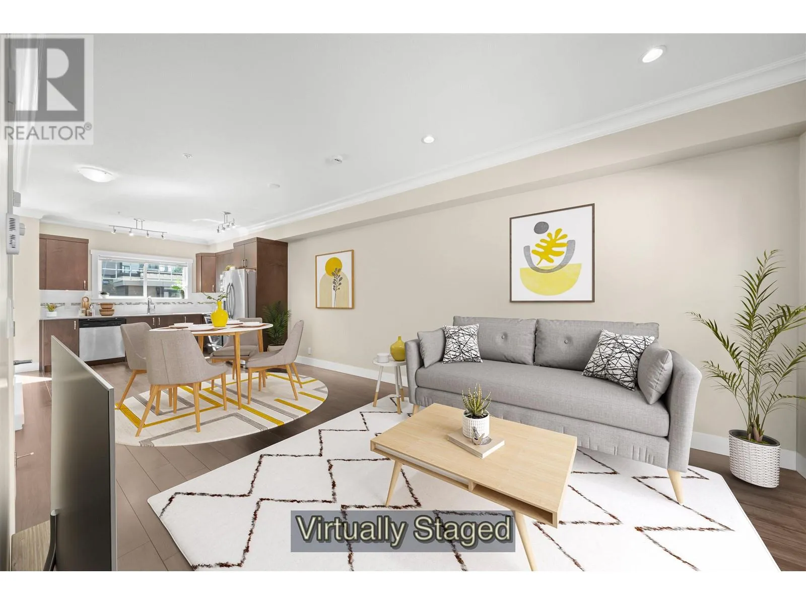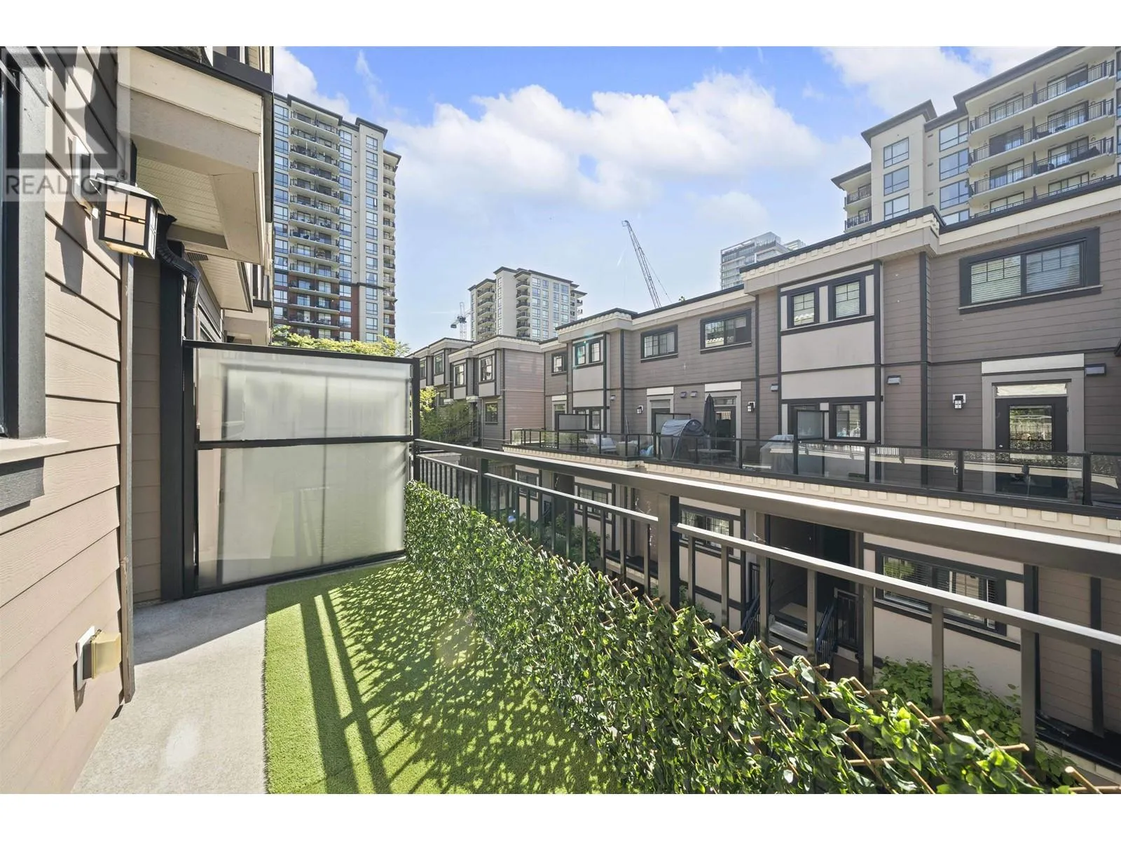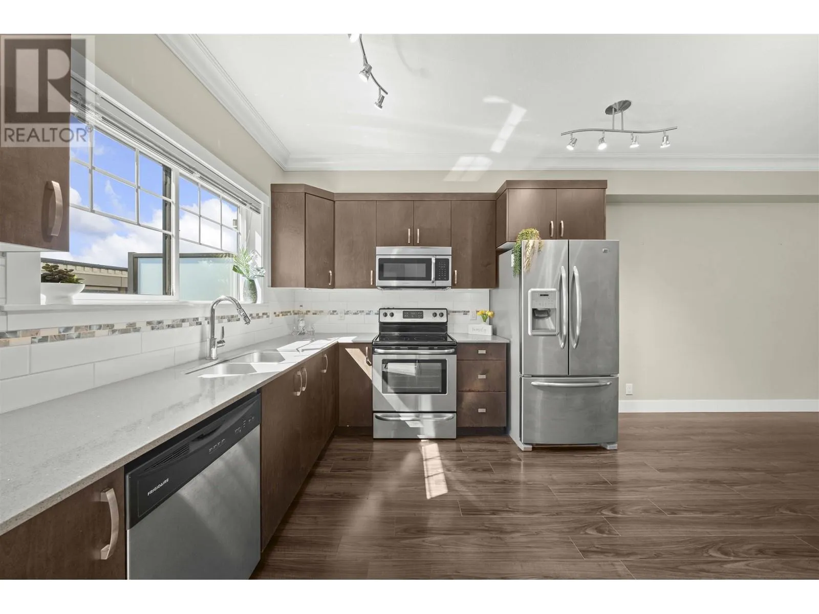 Welcome to Brickstone Walk II - a boutique, heritage-inspired townhome community in the heart of historic downtown New West! This bright, sought-after upper-level 2 bed/3 bath home features the developer's upgraded package, soaring almost 9´ ceilings, laminate floors, and a contemporary kitchen with quartz counters, S/S appliances, and south/west exposure. Enjoy a spacious open layout, large sun-filled patio off the main, and a convenient powder room. Upstairs offers 2 generous bedrooms, each with its own bathroom. The primary bedroom boasts a peek-a-boo water view! Flooded with natural light from large front/back windows. Steps to SkyTrain, Douglas College, the Quay, shops & restaurants. Includes 1 parking & elevator access to the garage. (id:27476)