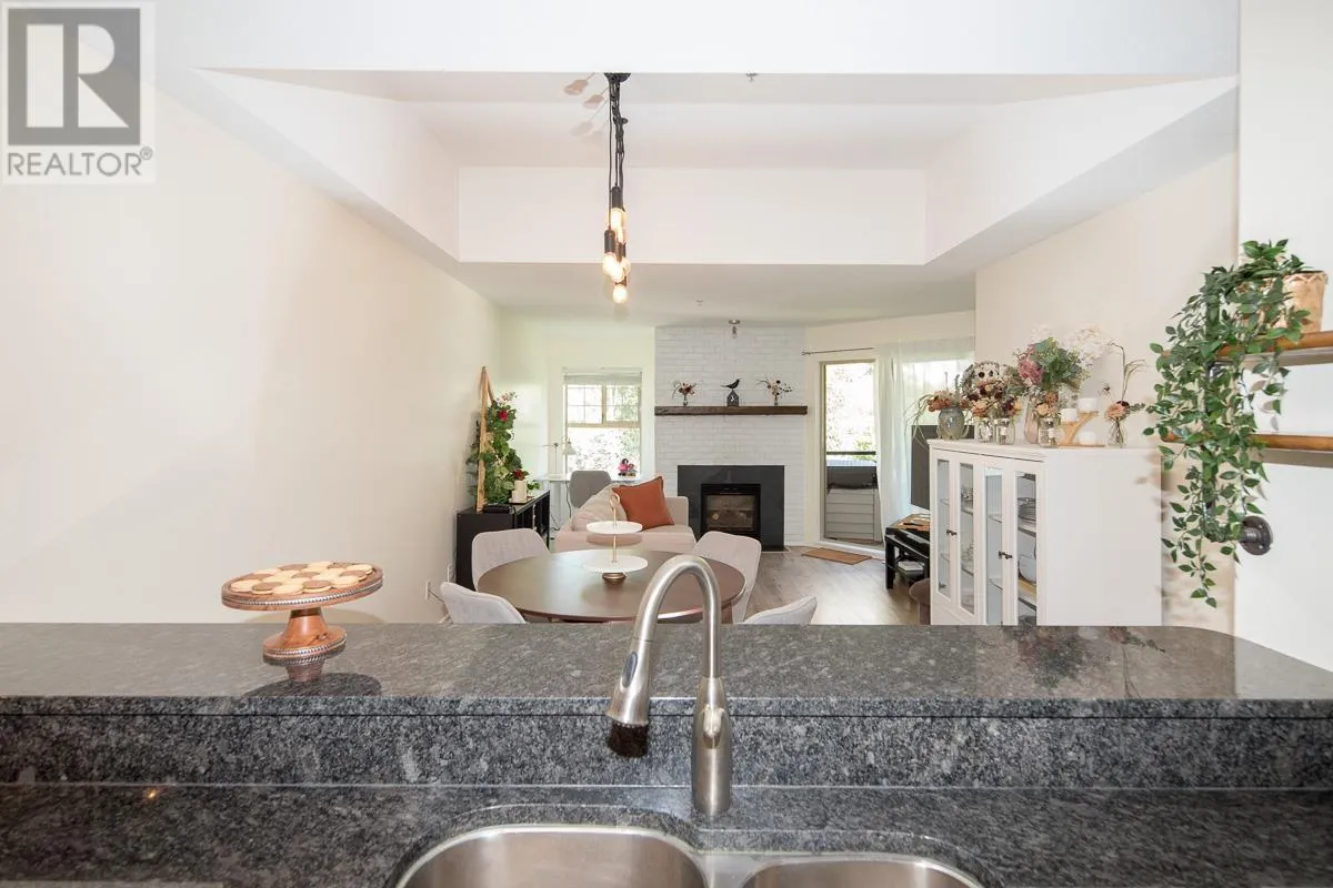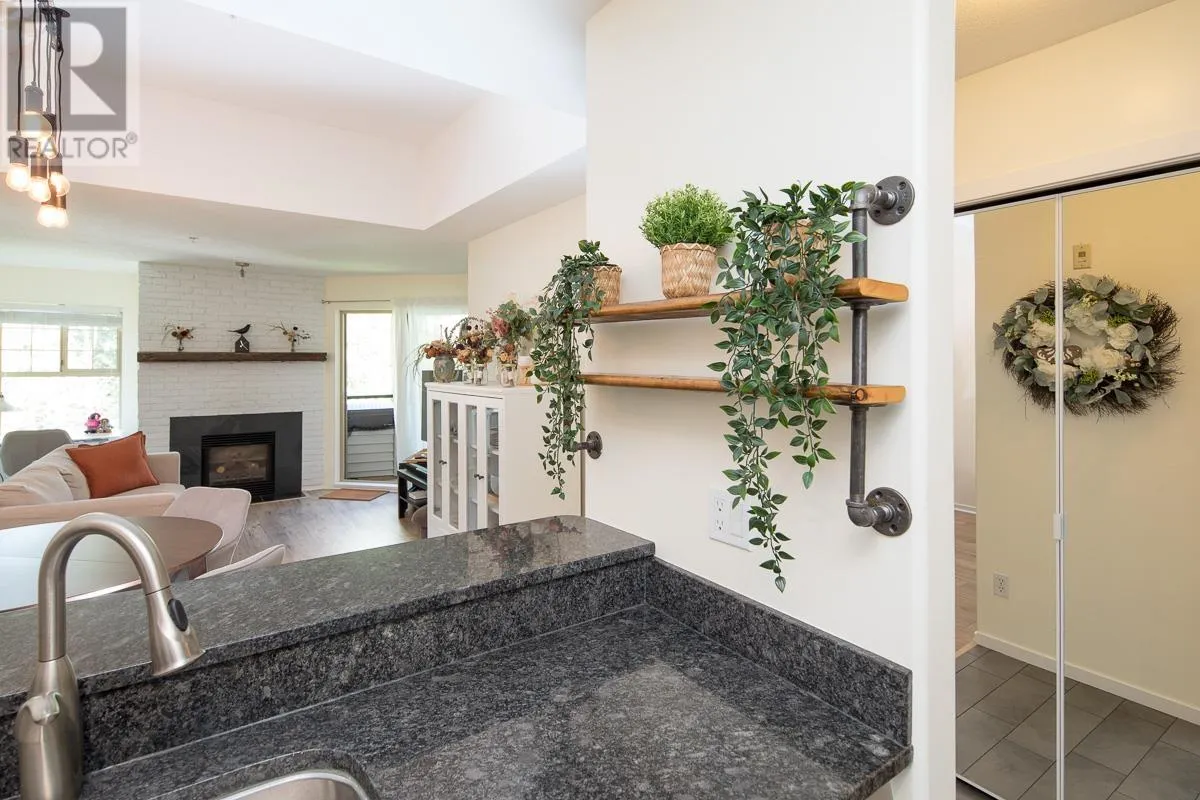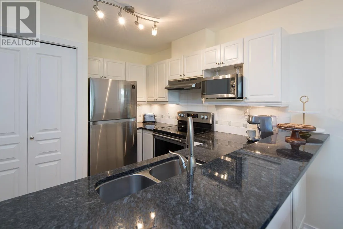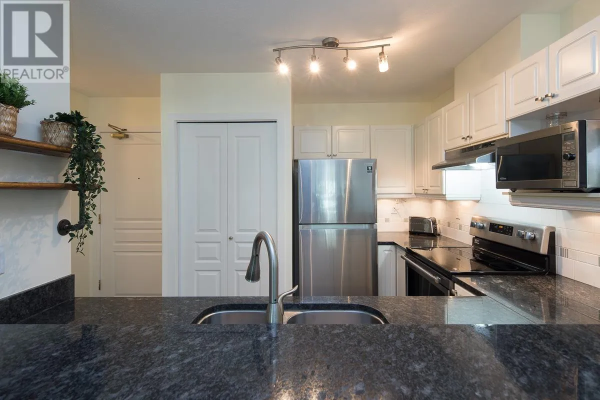 OPEN Sunday 2-4pm. 2 Large Dogs OK. Updated top floor one bedroom condo has a spacious covered balcony with green belt and city views. The spacious living room has a gas fireplace and a nook for your computer gaming and home office. There is easy to clean laminate flooring throughout. The kitchen has stainless appliances, granite counter tops and and breakfast bar. In-Suite Laundry. There is lots of space for dinner parties and you can easily have larger dining table. The master bedroom can fit a king sized bed and has a walk in closet. The cheater en-suite bathroom can be entered from the master bedroom or the foyer and features a larger soaker tub. 1 Secure Underground Parking, 1 Locker, bike room, gym, and beautifully landscaped garden courtyard. Bus Stop on other side of complex on 12th St, steps to the New Westminster Quay, The Boardwalk, Shopping, Key West FORD, Movie Theatres & SkyTrain. 2 Pets OK. Propane BBQ's OK. Measurements: BC Floor Plans 719sq ft / 709 square ft from the Strata Plan. (id:27476)