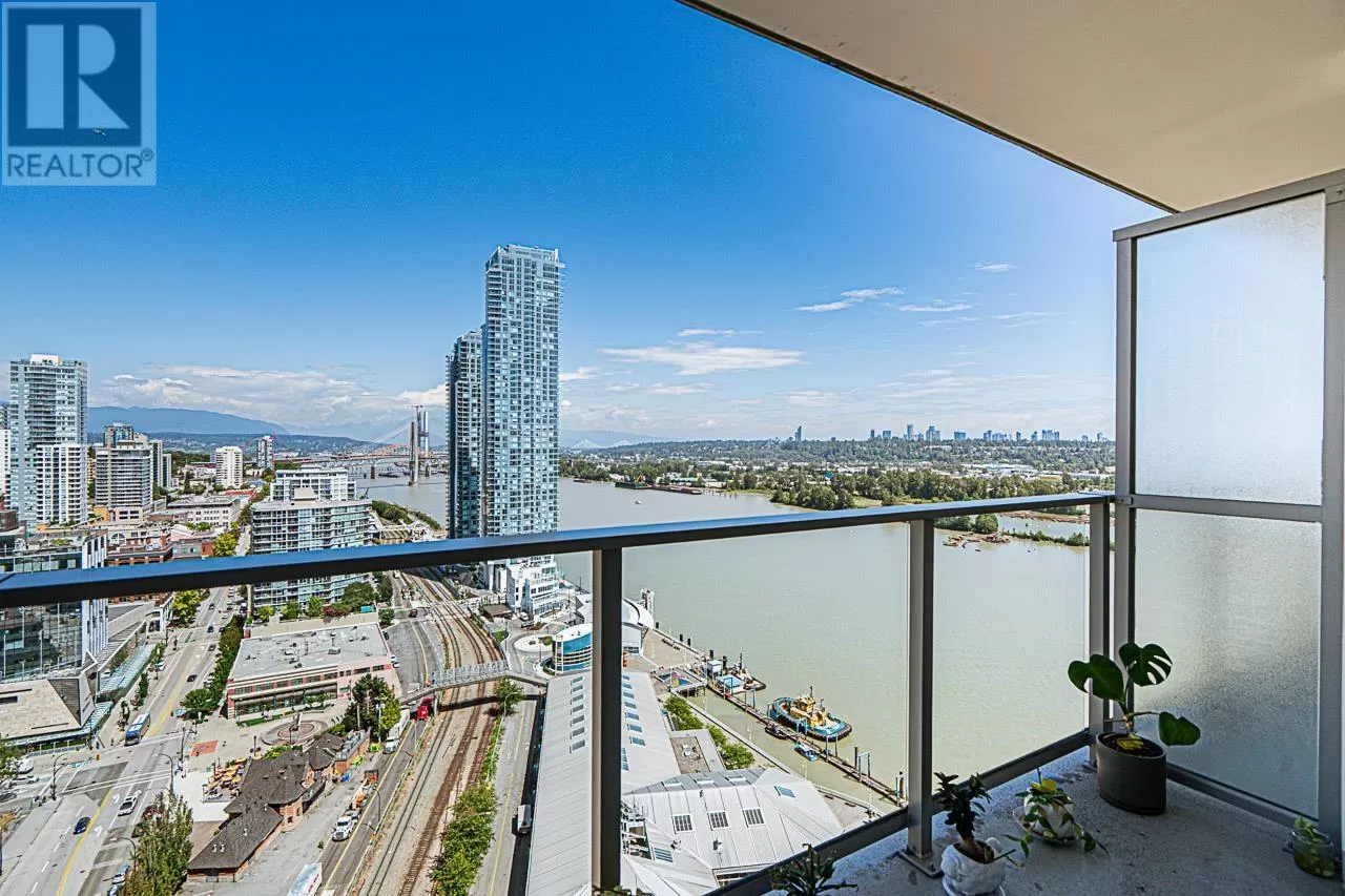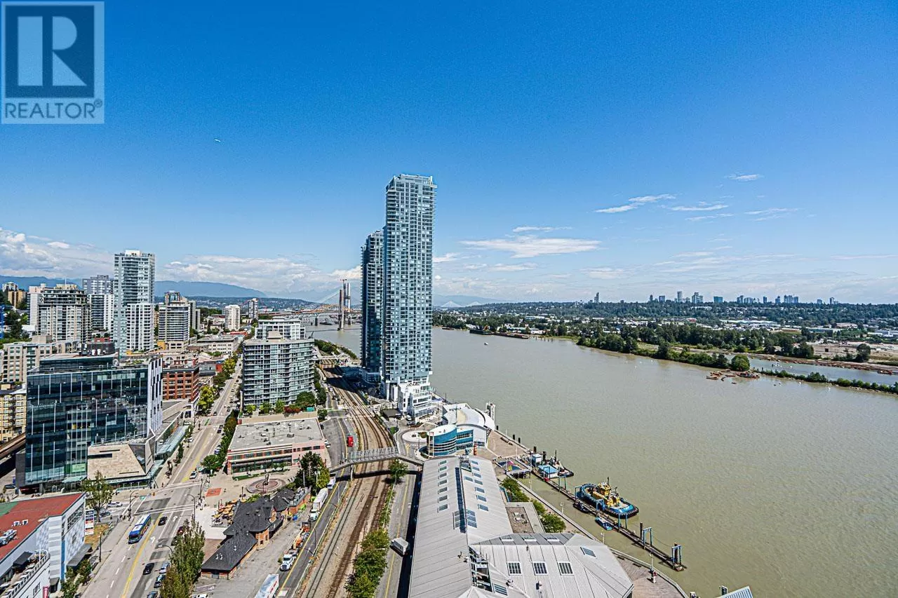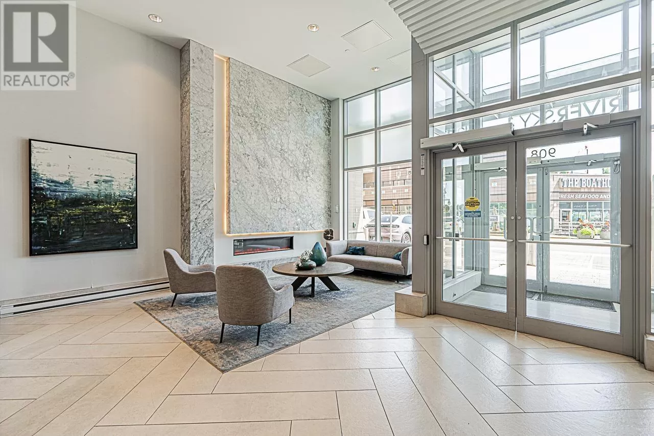 Riversky 1 by Bosa! This stunning waterfront high-rise is located in the heart of New Westminster Quay. This spacious 1 bed, 1 bath home offers 575 square ft of open-concept living with views of the Fraser River and mountains. Large windows fill the space with natural light. Features include a built-in extendable dining table and a floating TV panel that slides to reveal extra space for a pull-out bed. Amenities include a gym, yoga studio, entertainment lounge, rooftop patio, terrace, and bike room. Steps to the Boardwalk, River Market, parks, shopping, and SkyTrain. Includes 1 parking stall and a storage locker. (id:27476)