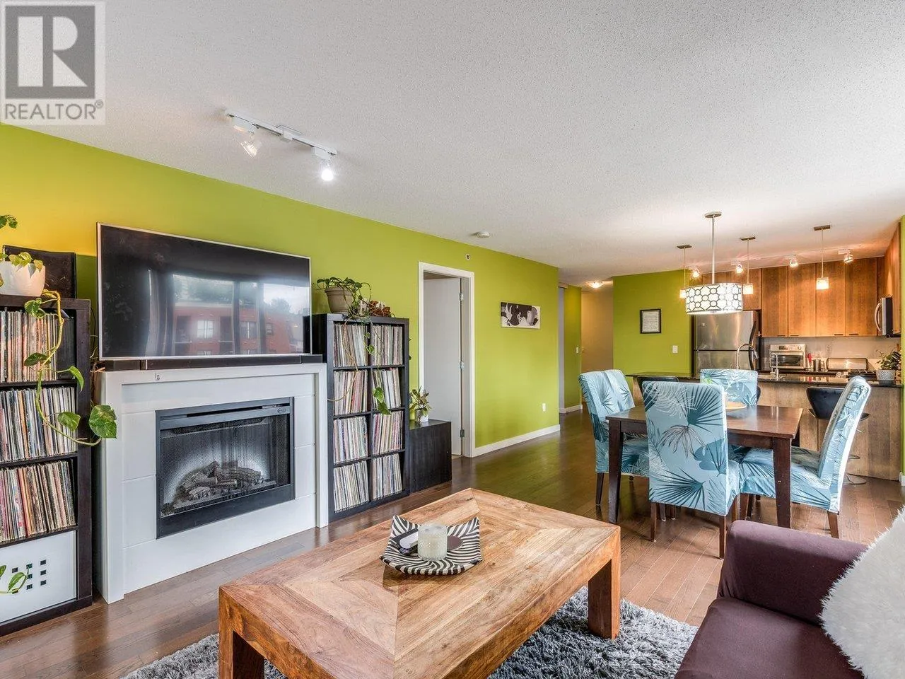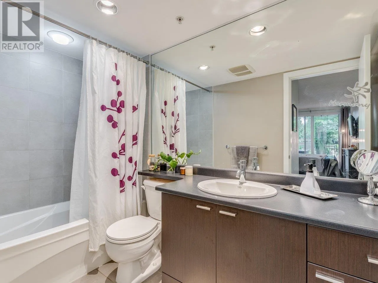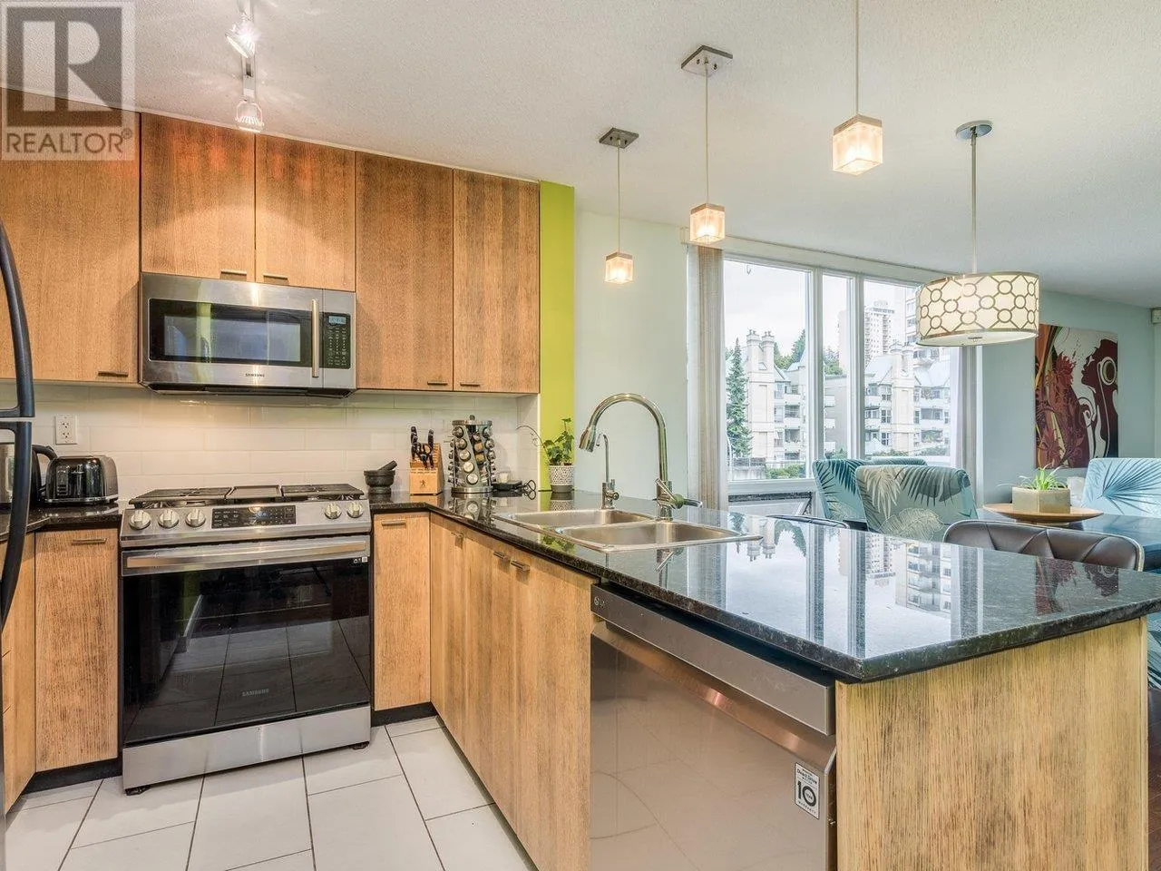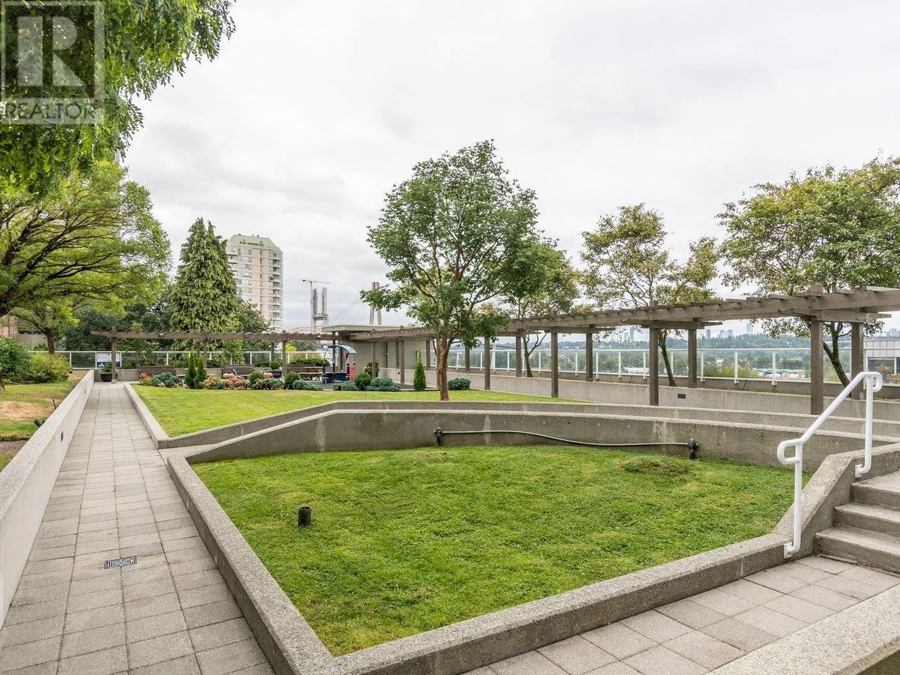 Quantum built by Bosa -- east facing two bedroom + den, two bath (1027 sf) condo with a spacious patio (362 sf) backing onto the 5th floor private garden. There's an open kitchen with a peninsula, plus a large dining and living area. Bedrooms are separated on either side of the condo. Amenities include a fabulous gym, sauna. One parking, one locker. Wonderful downtown walk-ability as you are steps to the skytrain station (either New West or Columbia), Pier Park and the New West Quay, shopping, schools. Two pets allowed, dogs and cats (dogs up to 20" at shoulder). Interested? Call your realtor for a viewing. Open house Sunday Aug 3 2-3:30 pm. (id:27476)