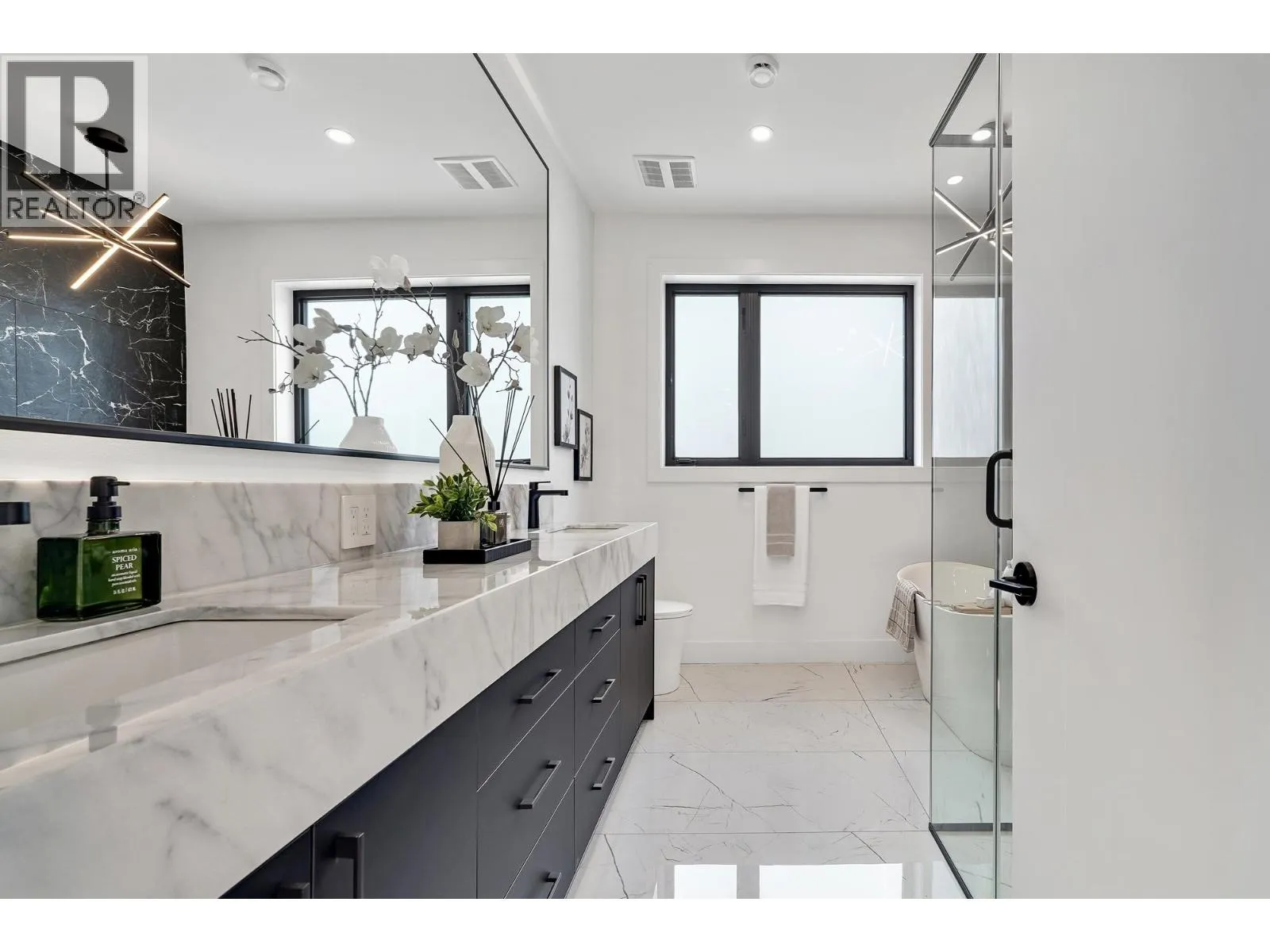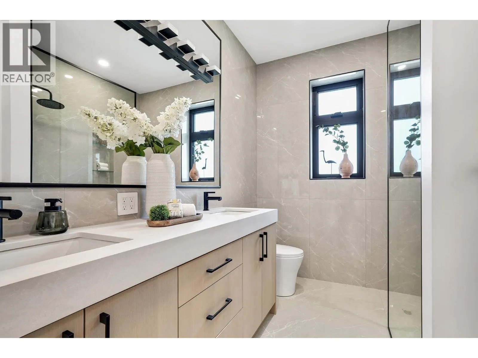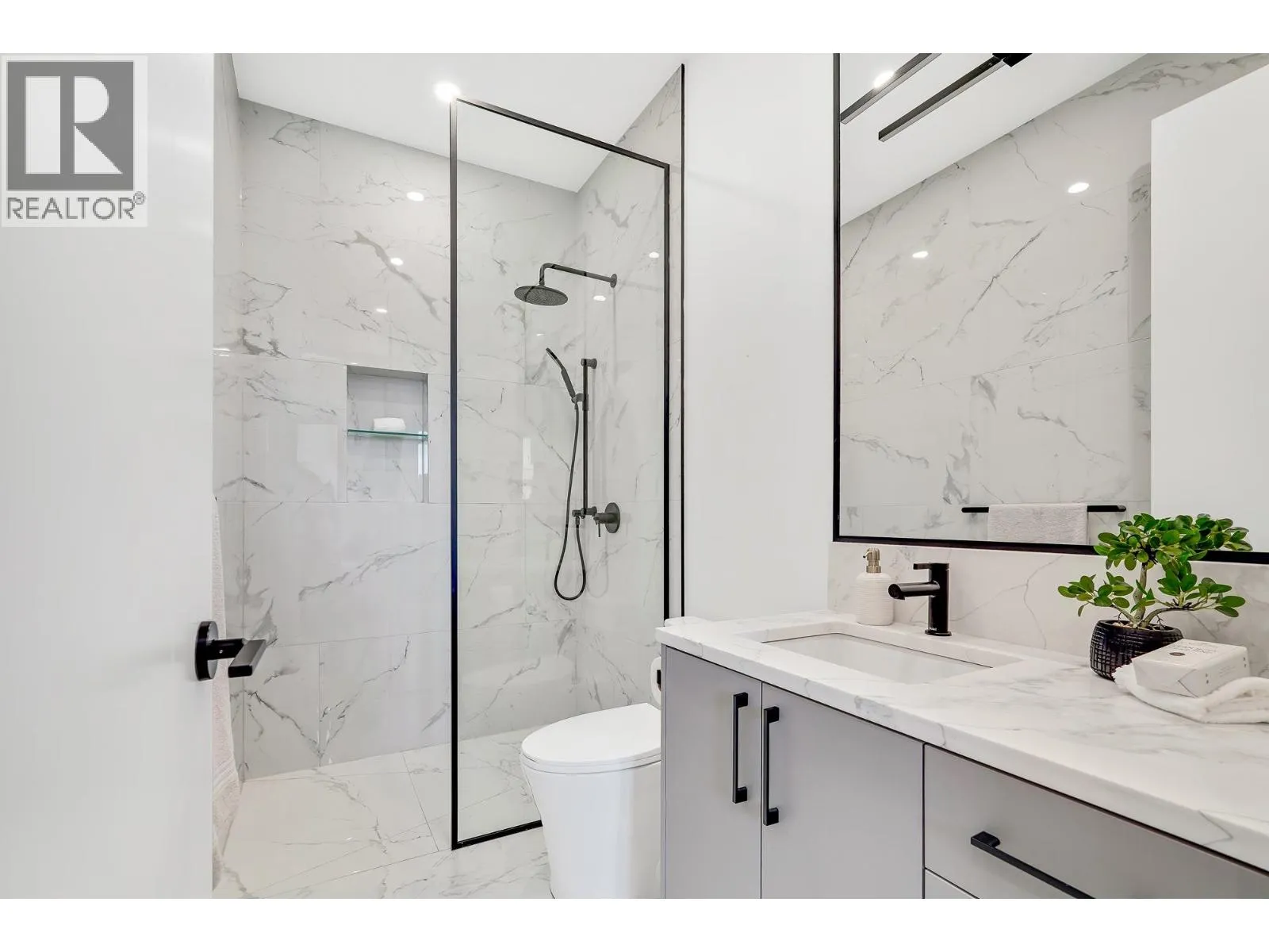 Experience unmatched luxury & sustainability in this stunning Net Zero Ready residence perfectly located in the vibrant heart of New Westminster. Thoughtfully designed, this 8 bed, 8 bath masterpiece offers exceptional versatility & comfort for multi-generational living or investment potential. The open-concept main floor features 10" ceilings, glass folding patio doors, chef-inspired gourmet marble kitchen, wok kitchen with city & mtn views, mud room, & primary bed with walk in shower adding modern practicality. 4 beds, 3 bath & laundry upstairs with legal 1-bed suite, & rec room downstairs. High-performance building standards ensure superior energy efficiency, year round comfort, & unparalleled indoor air quality. Over 4100 square ft living space plus a spacious 700 square ft garage ready with level 2 EV charging - perfect for multiple vehicles, a workshop or gym. Situated close to top-rated schools, parks, shopping, & transit. Showings by Appointment. (id:27476)