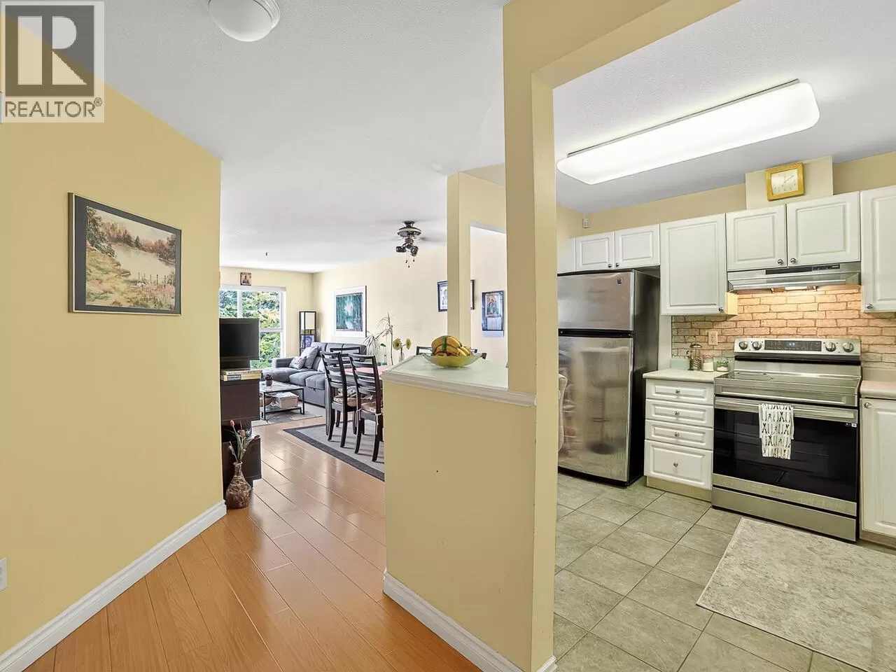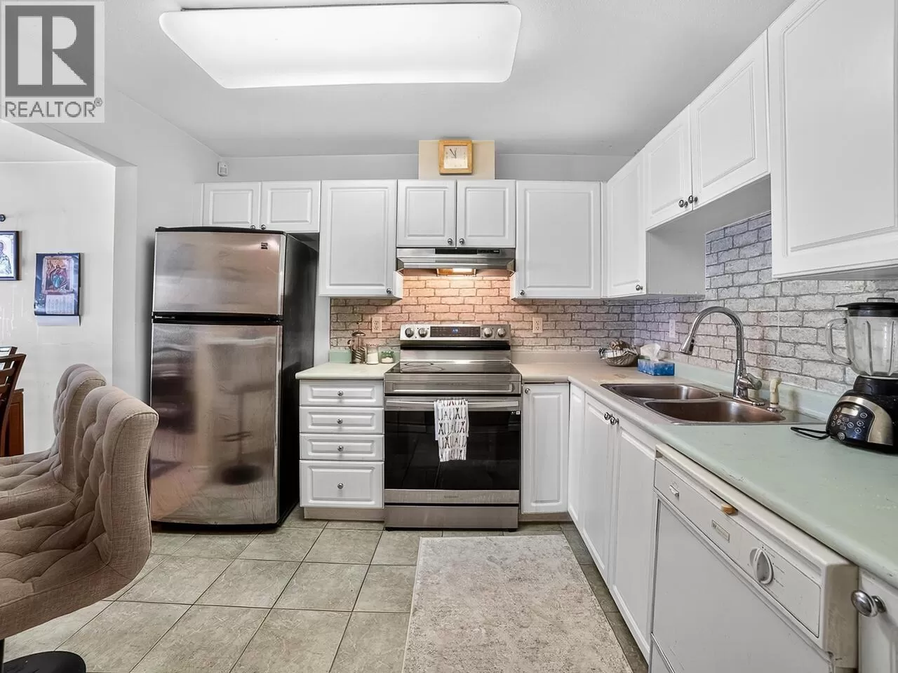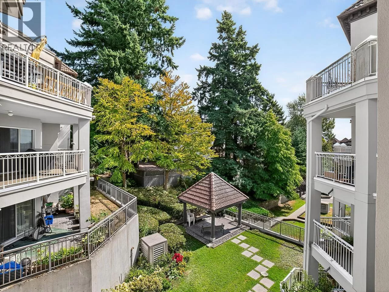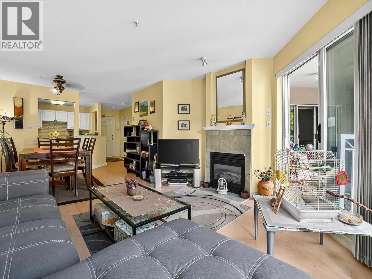 Welcome to Kingsgate Court in uptown New West. This inside corner unit opens up to laminate wood floors in the foyer, running to the dining room and living room with a gas fireplace and sliding glass doors that step out to the covered balcony, accessed as well from both bedrooms. The open kitchen has a breakfast bar opposite the stainless steel appliances and double sink. In suite storage sits adjacent to the hall closet. The three-piece main bathroom sits across the hall from the second bedroom. The primary bedroom, enjoying the same green belt, courtyard views from the deck and living room, has double mirrored closets on the way to the en suite and stacked washer and dryer. With a walk score of 90, this home is surrounded by amenities and only a short walk to Moody Park and Royal City Center. 2 cats/dogs allowed. 3D virtual tour at Realtor's site. (id:27476)