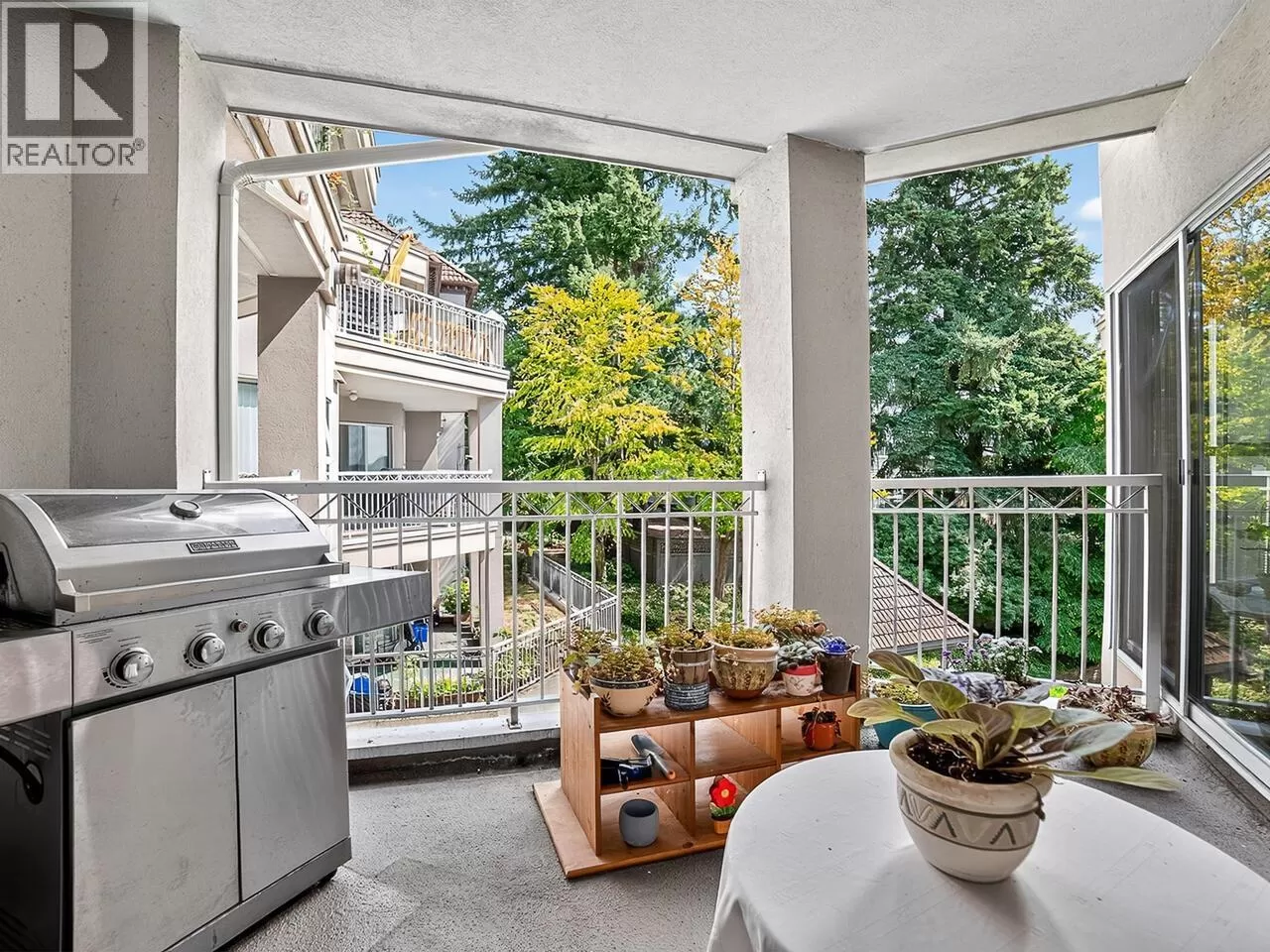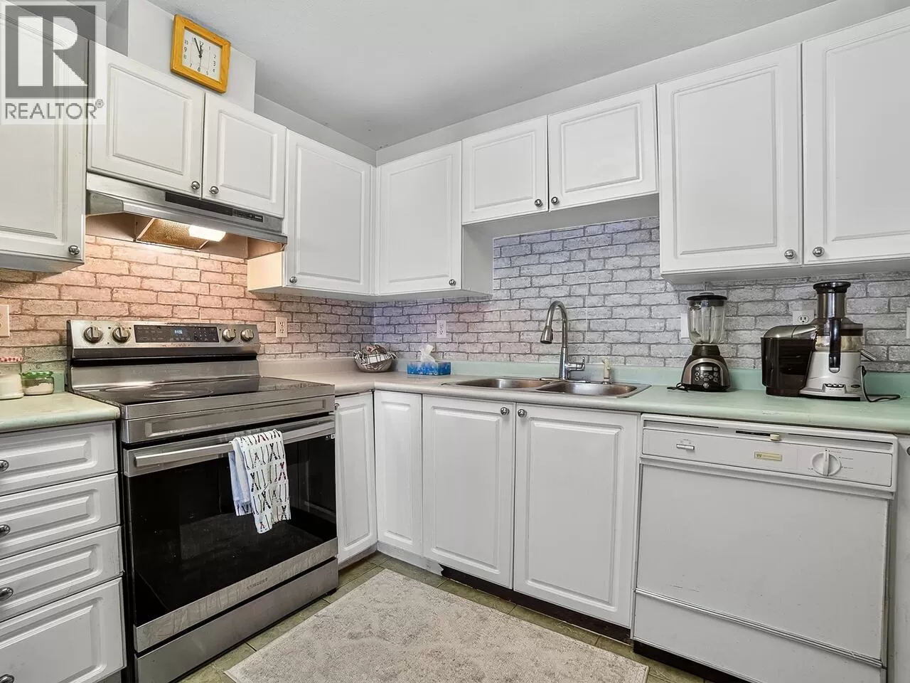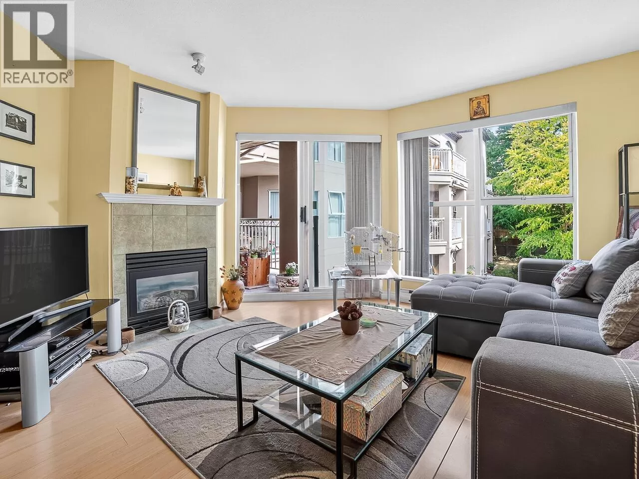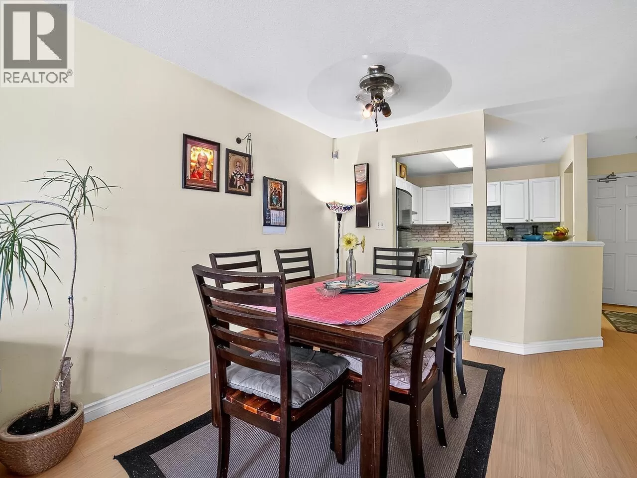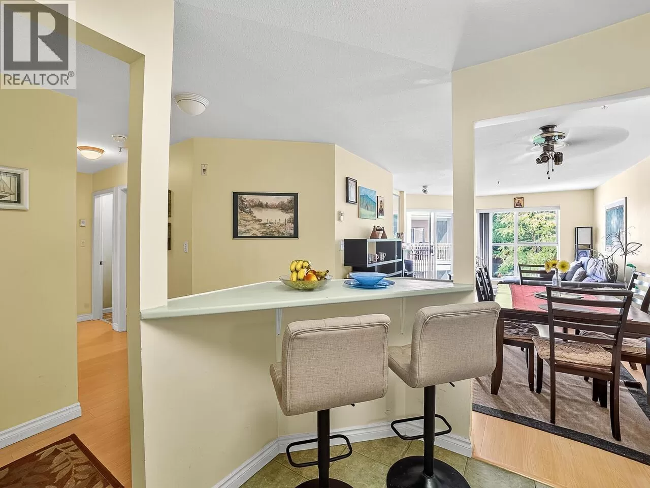 Welcome to Kingsgate Court in uptown New West. This inside corner unit opens up to laminate wood floors in the foyer, running to the dining room and living room with a gas fireplace and sliding glass doors that step out to the covered balcony, accessed as well from both bedrooms. The open kitchen has a breakfast bar opposite the stainless steel appliances and double sink. In suite storage sits adjacent to the hall closet. The three-piece main bathroom sits across the hall from the second bedroom. The primary bedroom, enjoying the same green belt, courtyard views from the deck and living room, has double mirrored closets on the way to the en suite and stacked washer and dryer. With a walk score of 90, this home is surrounded by amenities and only a short walk to Moody Park and Royal City Center. 2 cats/dogs allowed. 3D virtual tour at Realtor's site. (id:27476)