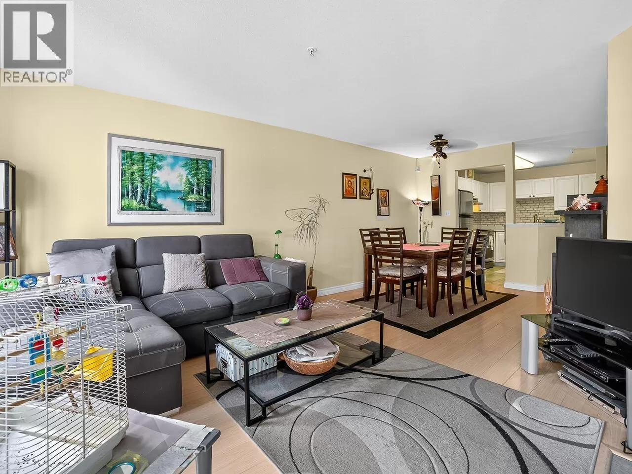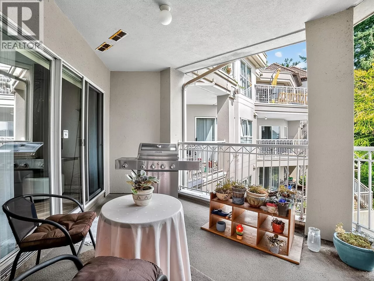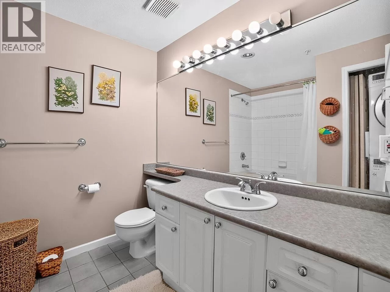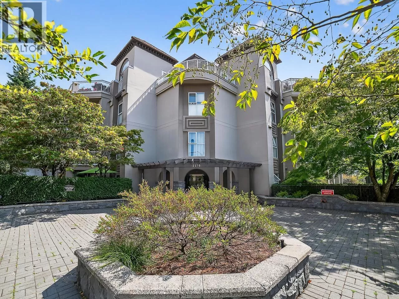 Welcome to Kingsgate Court in uptown New West. This inside corner unit opens up to laminate wood floors in the foyer, running to the dining room and living room with a gas fireplace and sliding glass doors that step out to the covered balcony, accessed as well from both bedrooms. The open kitchen has a breakfast bar opposite the stainless steel appliances and double sink. In suite storage sits adjacent to the hall closet. The three-piece main bathroom sits across the hall from the second bedroom. The primary bedroom, enjoying the same green belt, courtyard views from the deck and living room, has double mirrored closets on the way to the en suite and stacked washer and dryer. With a walk score of 90, this home is surrounded by amenities and only a short walk to Moody Park and Royal City Center. 2 cats/dogs allowed. 3D virtual tour at Realtor's site. (id:27476)