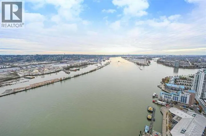 Pier West by Bosa ~ Never occupied, brand-new top-floor waterfront luxury condo with iconic views of the Fraser River, mountains & city skyline. This stunning corner 2 bed + 2 bath home features an open layout, floor-to-ceiling windows, gourmet Bosch Chef's Kitchen, and Caesarstone waterfall island. Chef´s kitchen with Bosch appliances, gas cooktop, quartz backsplash & waterfall island. Spa-inspired ensuite with walk-in closet. A/C, large balcony, 2 underground parking (1 EV-ready), and private locker. Top tier amenities: 24-hr concierge, gym, steam/sauna & social lounge. Steps to SkyTrain, New West Quay, Shops & Riverfront walks.Quick Possession n' Move in ready. Call to view. (id:27476)