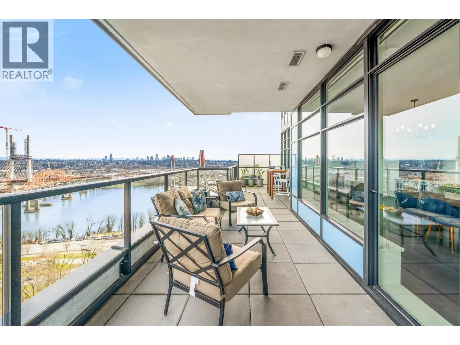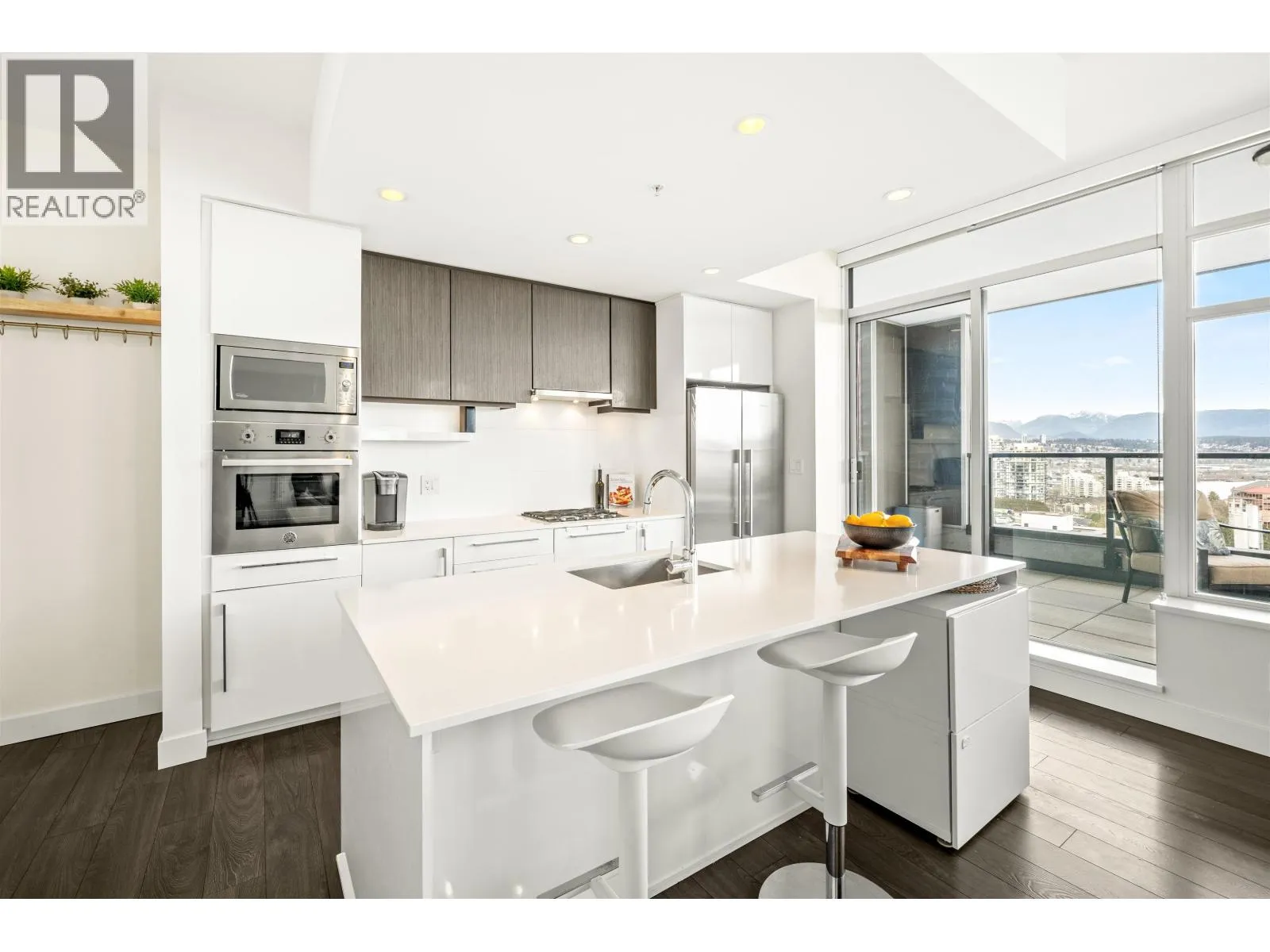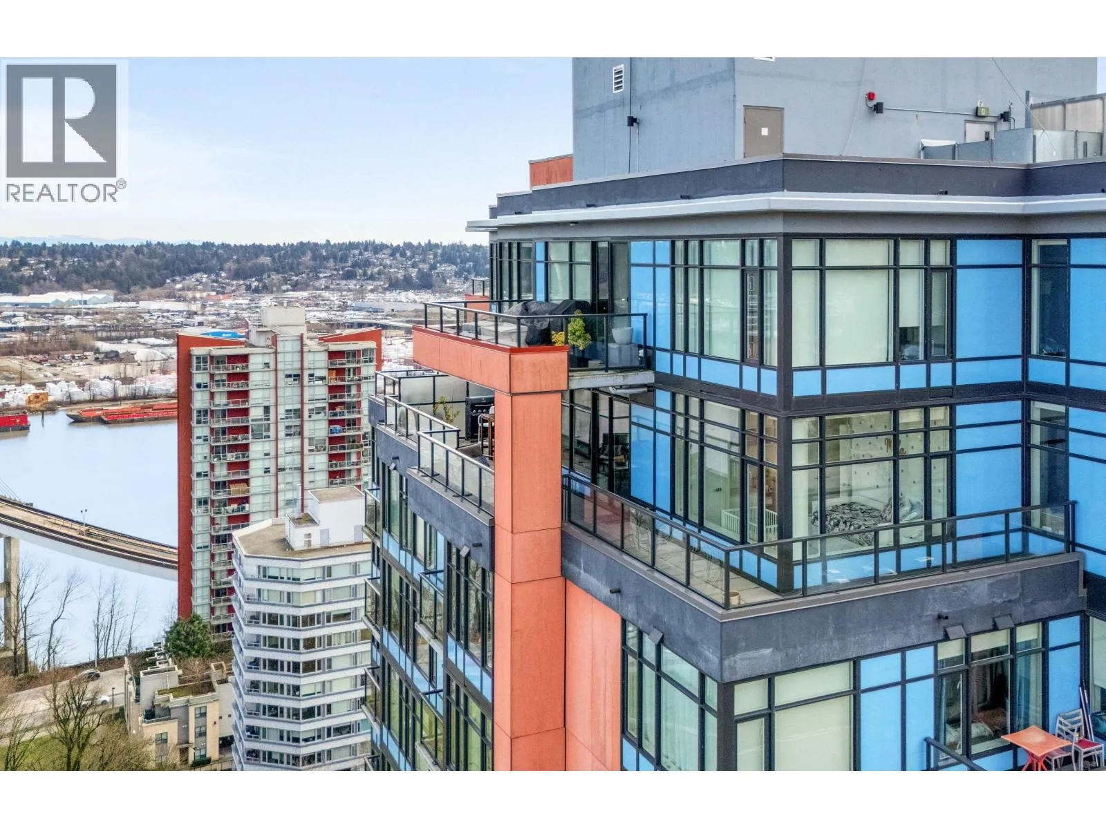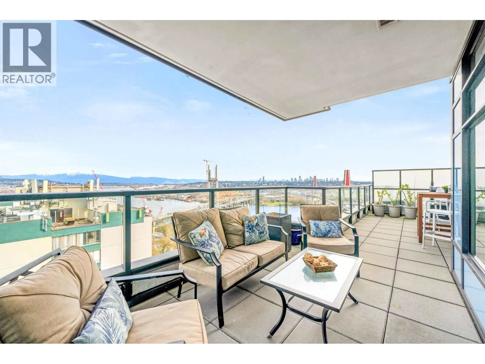Stunning sub-penthouse high above downtown New West, this corner unit at Elliot Street offers panoramic views from the North Shore mountains, to the Fraser River & Mt Baker. Huge wrap around semi-covered patio, great for entertaining, over 300sf, enjoy morning sunsets & north, east & south facing views! Open floor plan, 1,154sf of living space, with 2 bedrooms, 2 bathrooms, open-concept living/dining/kitchen area with 10´ ceilings, large kitchen with island, high-end European appliances, gas range, and modern cabinetry. Located on the east side of Downtown New West, backing onto Albert Crescent park, tucked away from city noise and a close walk to Columbia Skytrain, Restaurants, Shopping and Pier Park. Includes 1 parking & 1 storage. (id:27476)