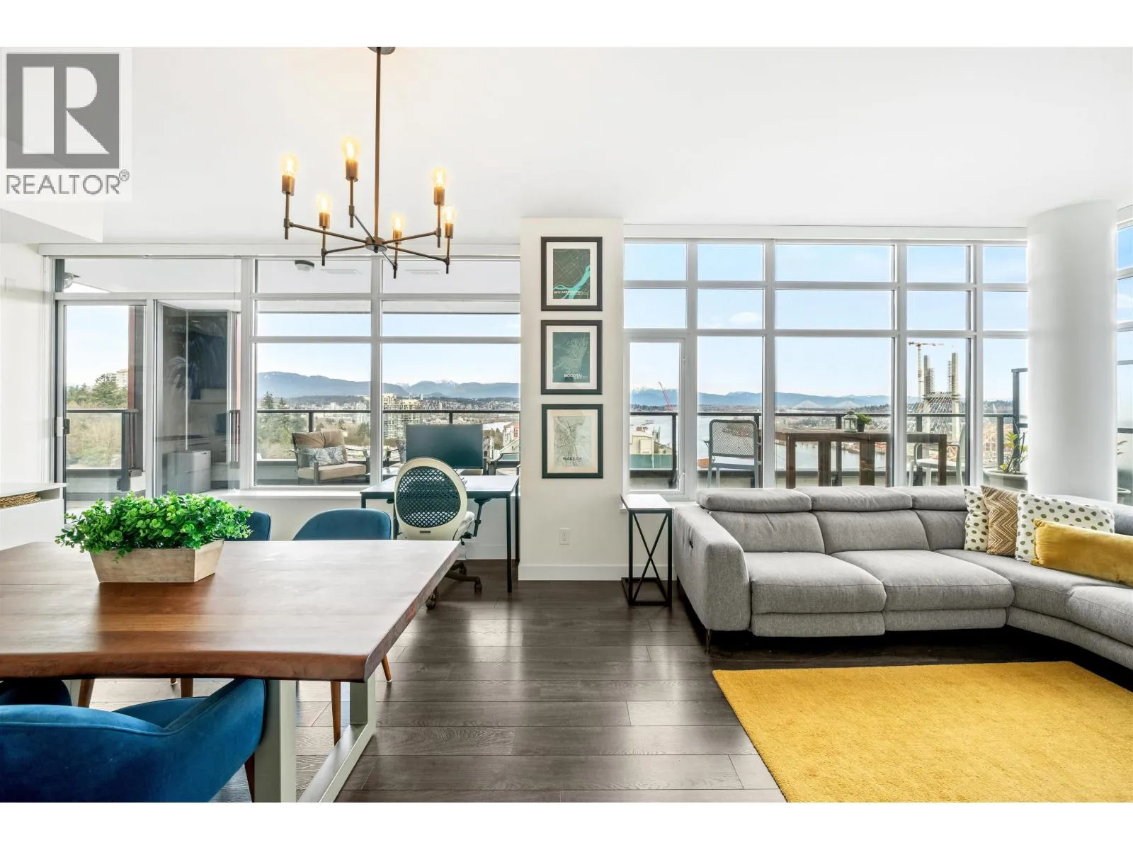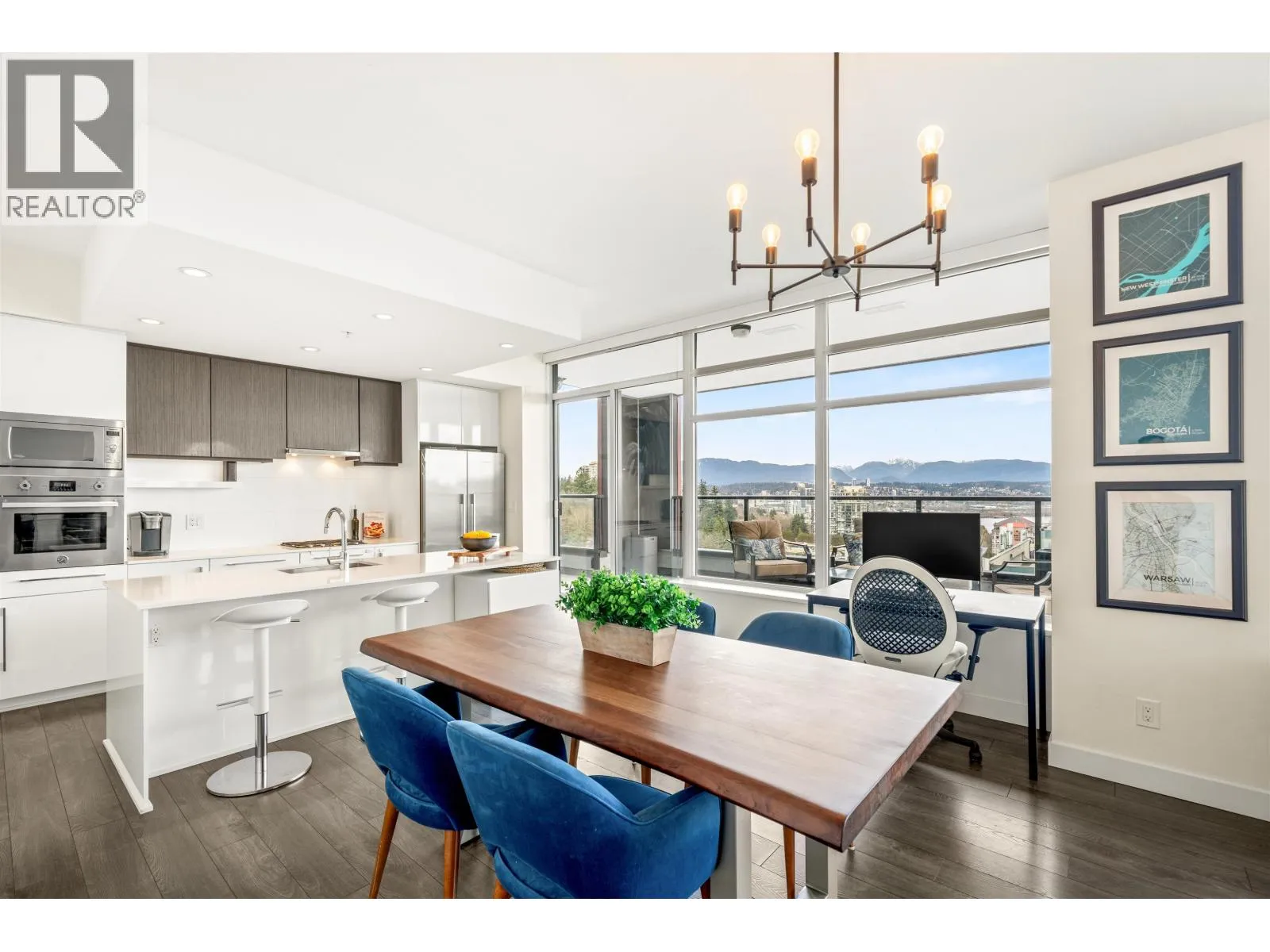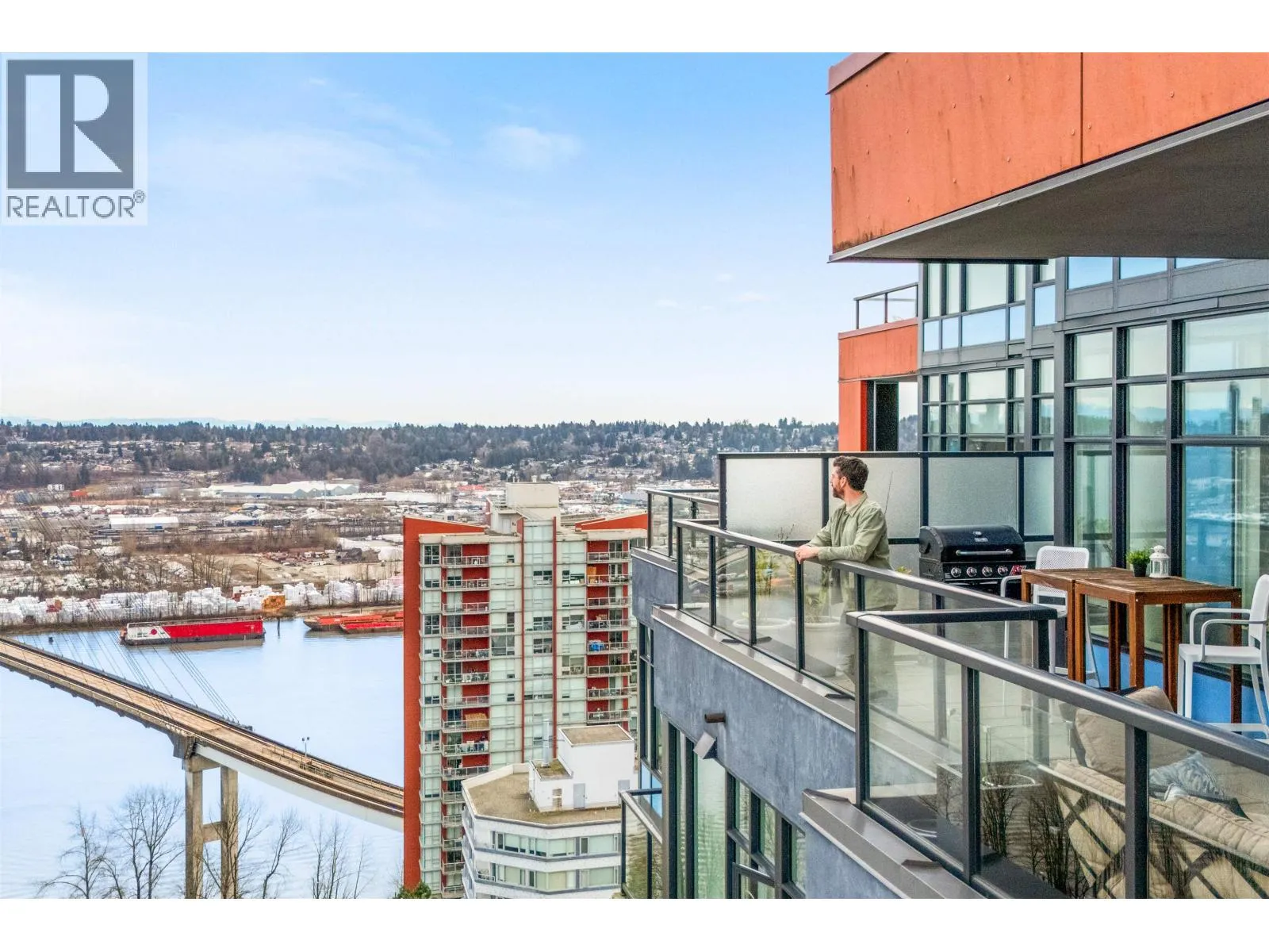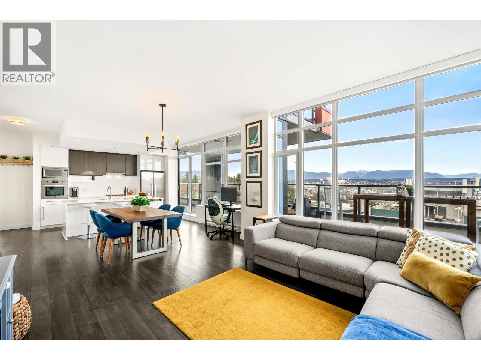 Stunning sub-penthouse high above downtown New West, this corner unit at Elliot Street offers panoramic views from the North Shore mountains, to the Fraser River & Mt Baker. Huge wrap around semi-covered patio, great for entertaining, over 300sf, enjoy morning sunsets & north, east & south facing views! Open floor plan, 1,154sf of living space, with 2 bedrooms, 2 bathrooms, open-concept living/dining/kitchen area with 10´ ceilings, large kitchen with island, high-end European appliances, gas range, and modern cabinetry. Located on the east side of Downtown New West, backing onto Albert Crescent park, tucked away from city noise and a close walk to Columbia Skytrain, Restaurants, Shopping and Pier Park. Includes 1 parking & 1 storage. (id:27476)