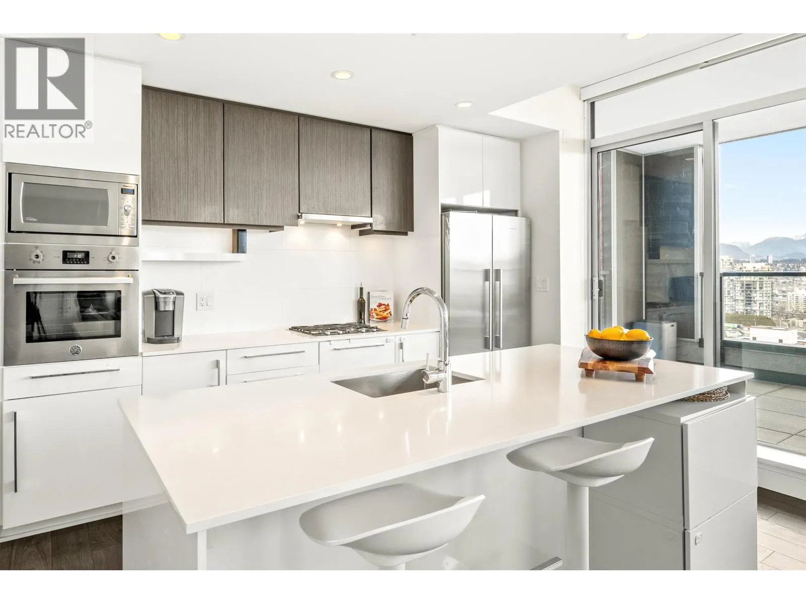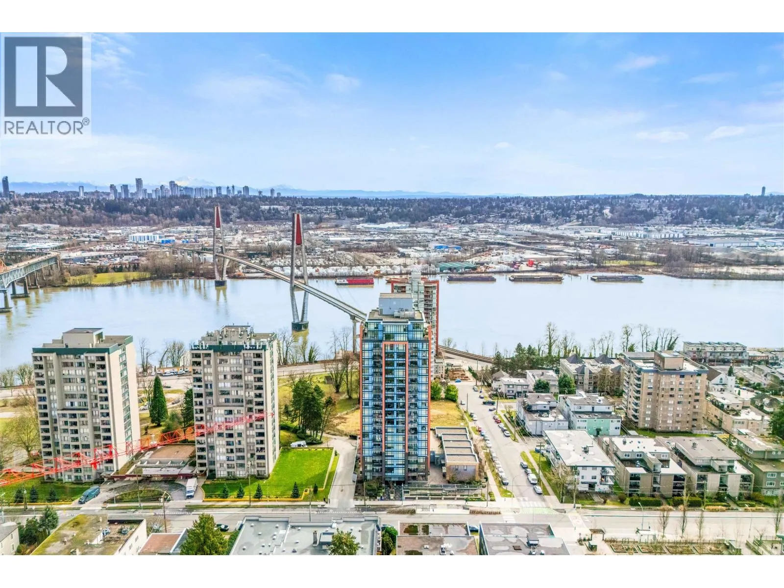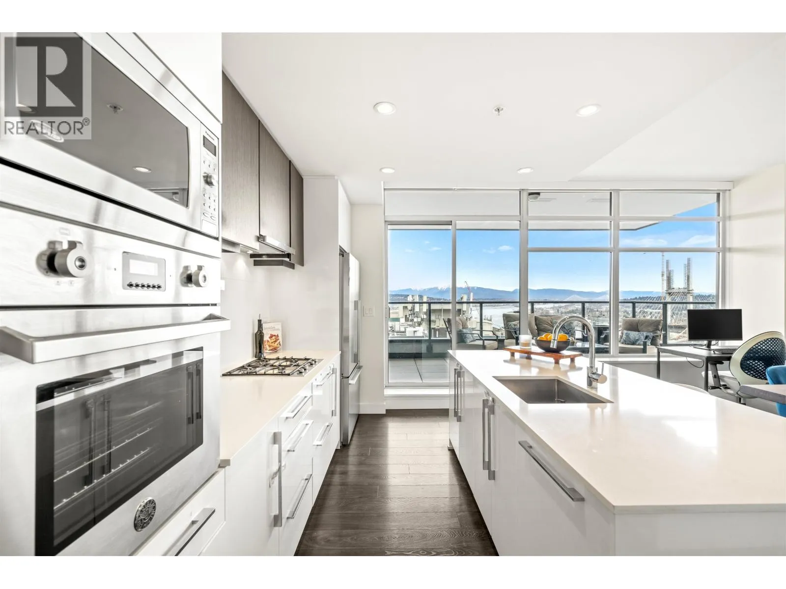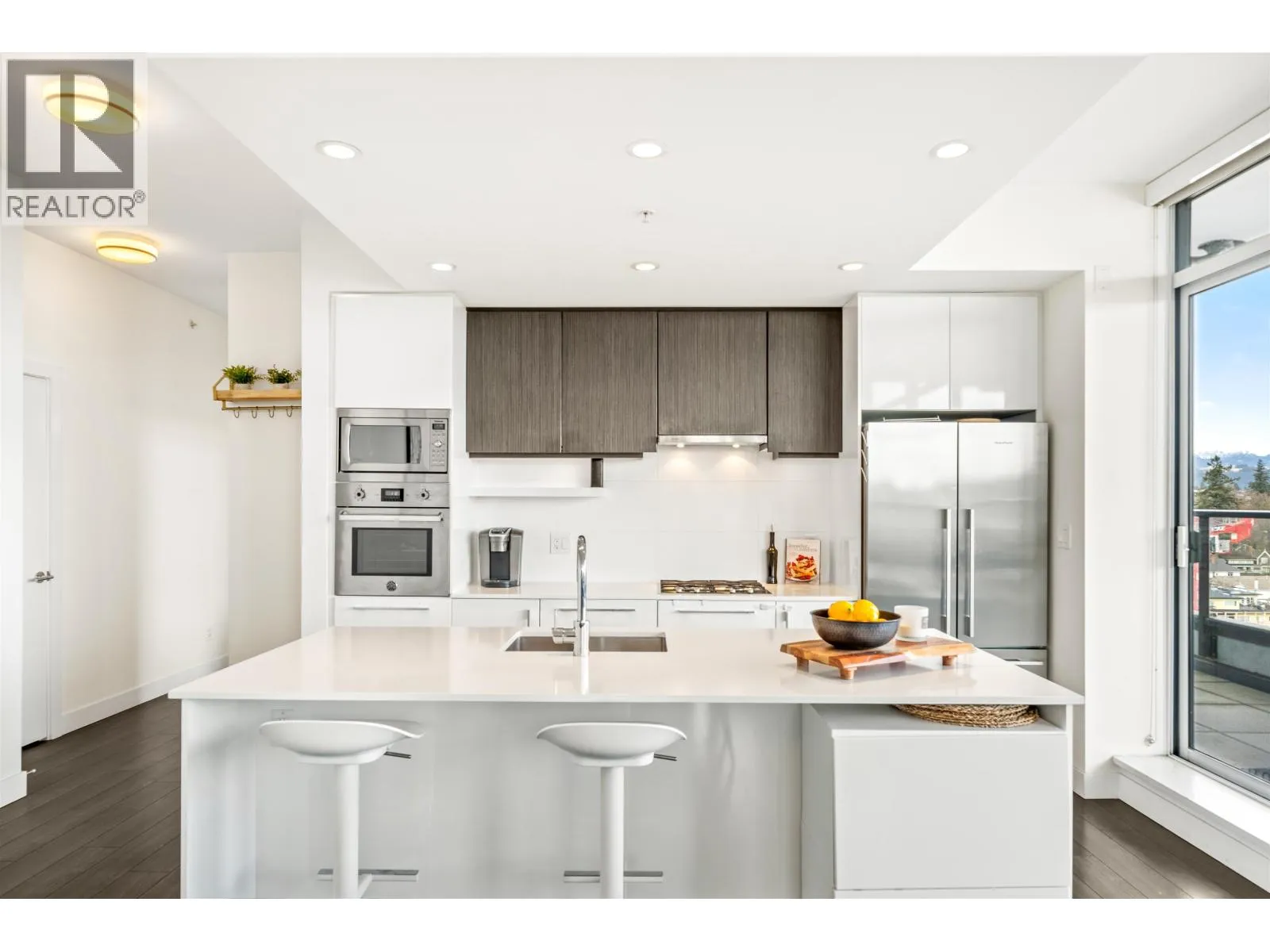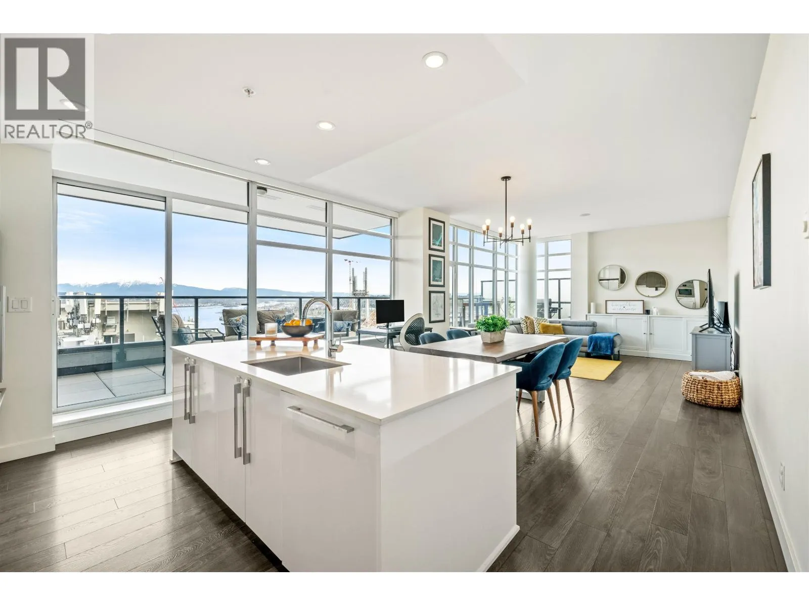 Stunning sub-penthouse high above downtown New West, this corner unit at Elliot Street offers panoramic views from the North Shore mountains, to the Fraser River & Mt Baker. Huge wrap around semi-covered patio, great for entertaining, over 300sf, enjoy morning sunsets & north, east & south facing views! Open floor plan, 1,154sf of living space, with 2 bedrooms, 2 bathrooms, open-concept living/dining/kitchen area with 10´ ceilings, large kitchen with island, high-end European appliances, gas range, and modern cabinetry. Located on the east side of Downtown New West, backing onto Albert Crescent park, tucked away from city noise and a close walk to Columbia Skytrain, Restaurants, Shopping and Pier Park. Includes 1 parking & 1 storage. (id:27476)
