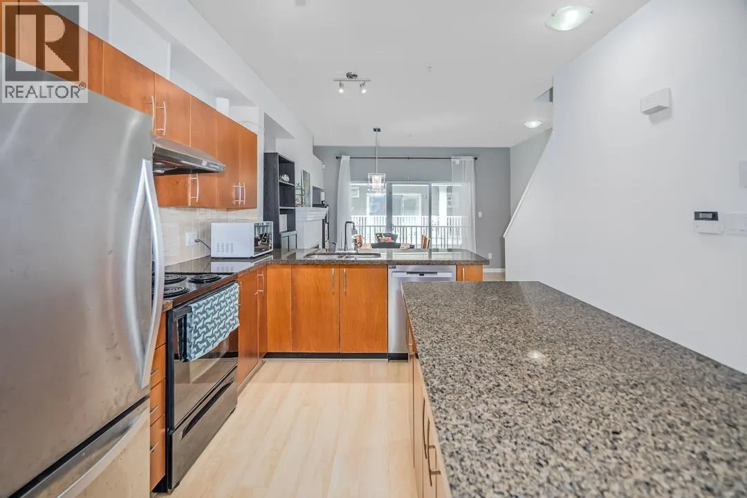 Welcome to this inviting 3-bed, 2-bath townhome, perfect for a growing family! Enjoy an open-concept design with energy-efficient Mysa thermostats and laminate flooring throughout. The spacious kitchen features granite countertops, a large island, and updated stainless steel appliances, including a fridge, dishwasher, and range hood. Step outside to a private fenced yard and covered deck for year-round enjoyment. Upstairs, find 3 generously sized bedrooms and 2 fully remodelled bathrooms. The ground level offers a 1-car garage with a new opener and versatile den-perfect for a home office or gym. Conveniently located near schools, transit, the community centre, and more. Open House: 11/15 Saturday 2-4pm. (id:27476)
