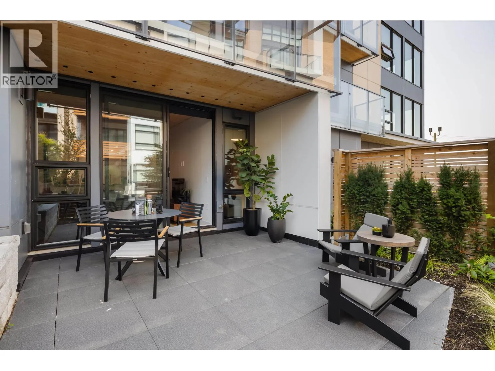 NEW PRICING & MOVE-IN READY! Welcome to Timber House by Aragon. This spacious 2 bed/1 bath ground floor home offers 940 SF of interior living space and approx 764 SF PRIVATE PATIO. Modern, high-design interiors feature exposed CLT panels, wide-plank oak floors, black roller blinds & A/C. The sleek kitchen offers full size Fisher Paykel + Smeg appliances, quartz counters, matte black hardware. Spa-inspired baths feature heated floors, floating vanities & frameless glass showers. Building amenities include: Courtyard, gym, BBQ area, dog wash, 1 parking (EV-ready opt), 1 storage. Steps to the boardwalk, 12 min to DT New West, 30 min to YVR, 35 min to DT Van. Photos shown may be from a display suite - not the actual unit. Sales Centre Closed for Christmas Holidays until January 3rd. Showings by private appointment. (id:27476)