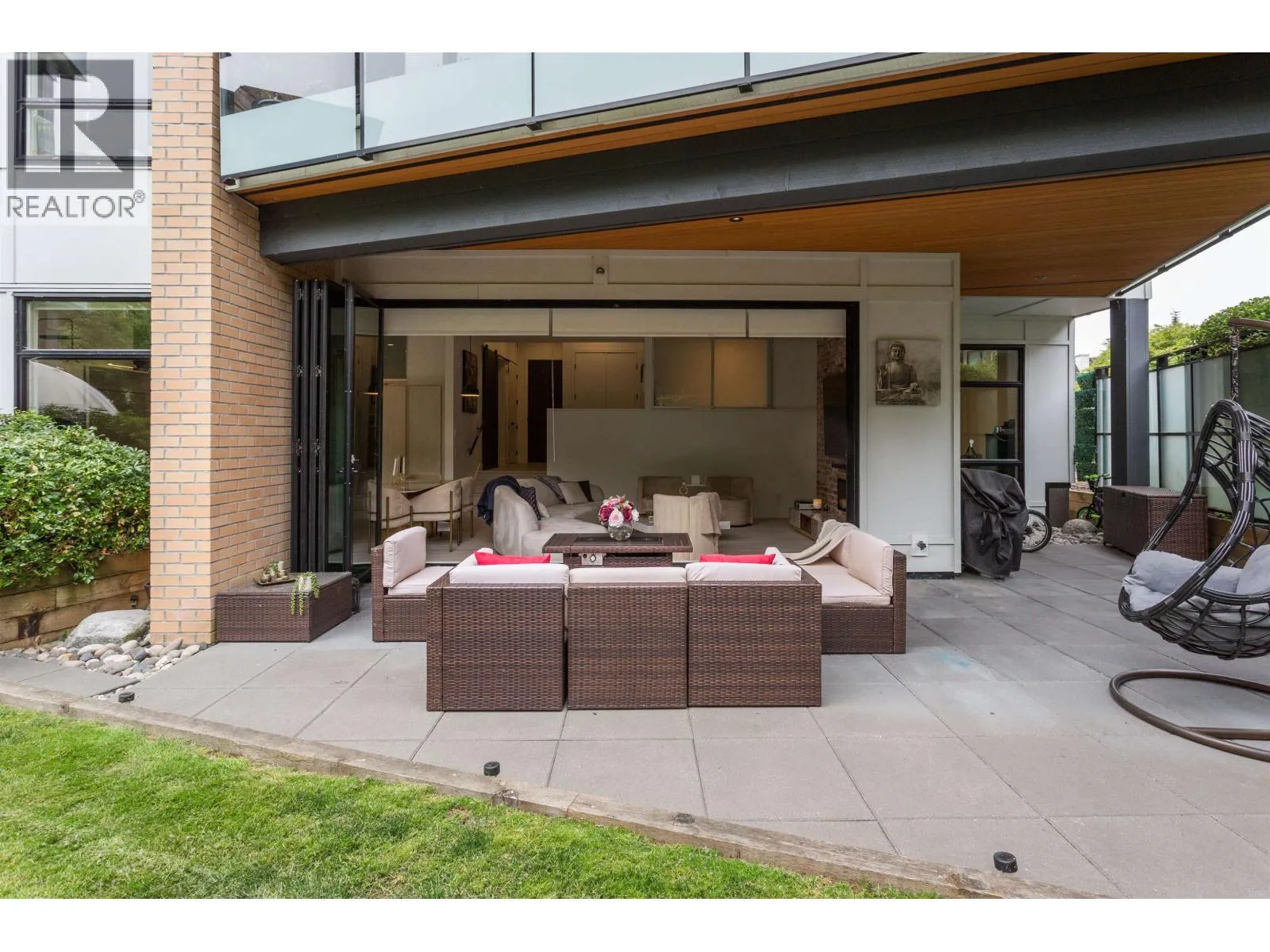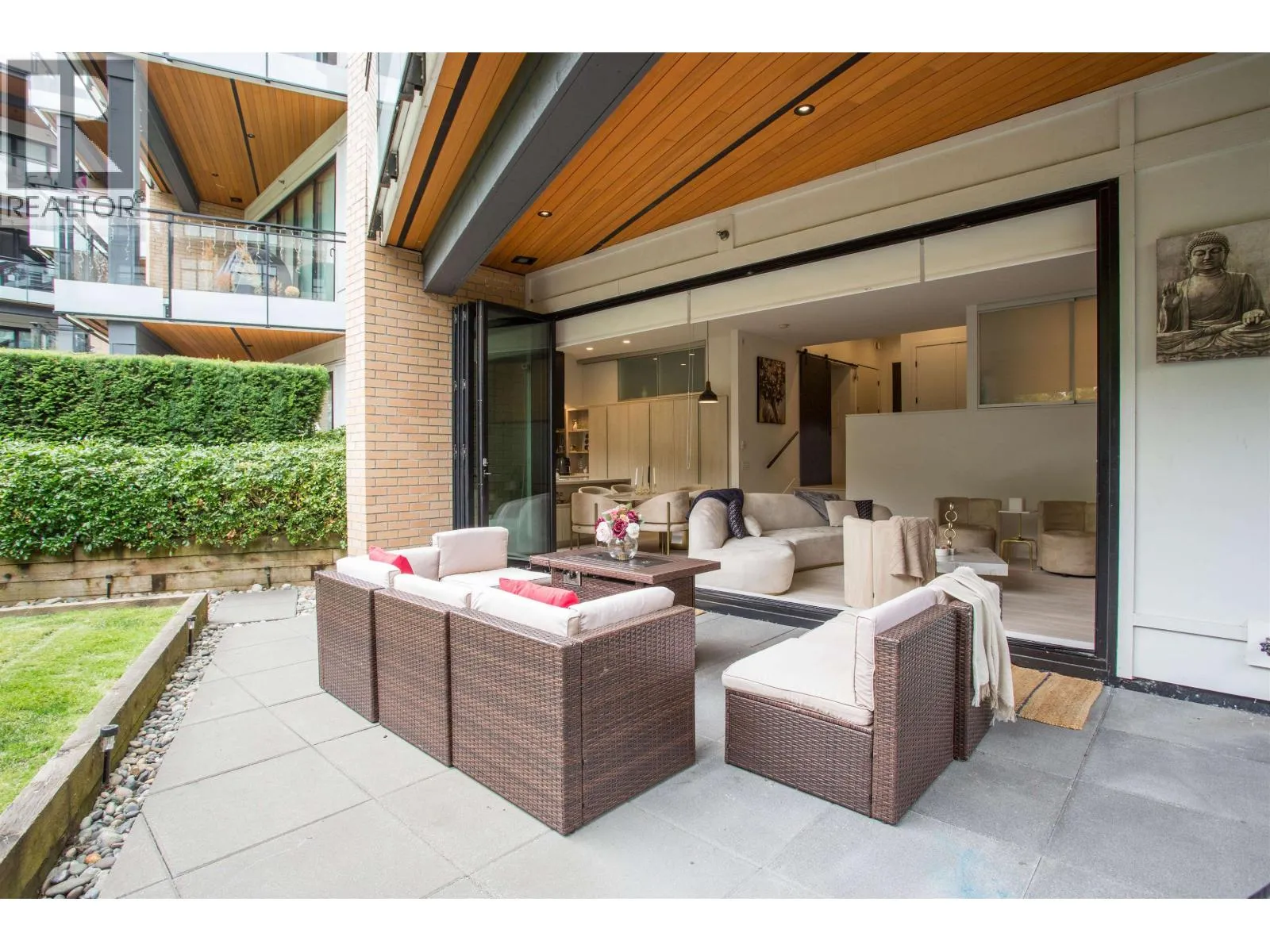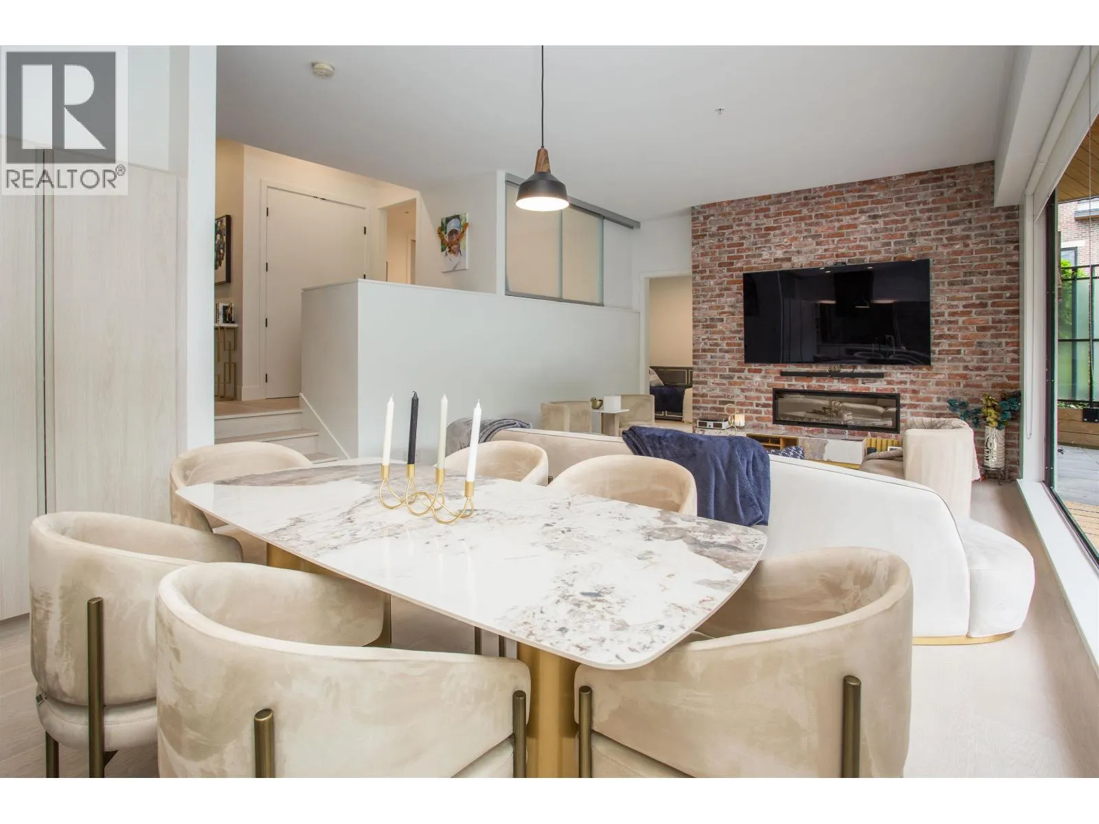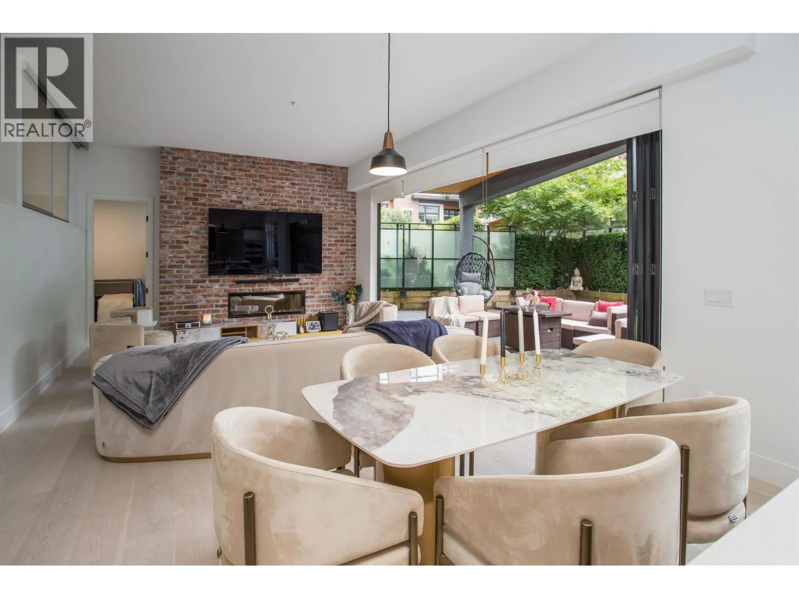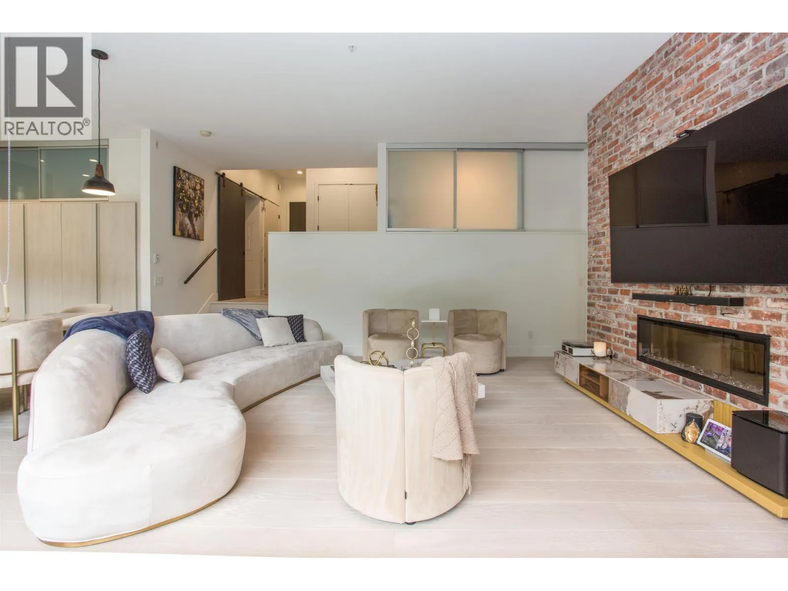 Welcome to Light House in Port Royal! This stunning 3 bed, 2 bath ground-level loft-style home features in-floor heating in both spacious bathrooms, engineered hardwood floors, and a beautiful brick feature wall. Accordion doors off the main living space open to a large patio and private yard-perfect for entertaining or letting the kids play. Filled with natural light and finished with care throughout. Family-friendly community with parks, shopping, and Q2Q Ferry access to SkyTrain and downtown New West. 2 Parking and a locker. EV Charger in parking spot! Open house Sunday November 16th 2-3PM. (id:27476)