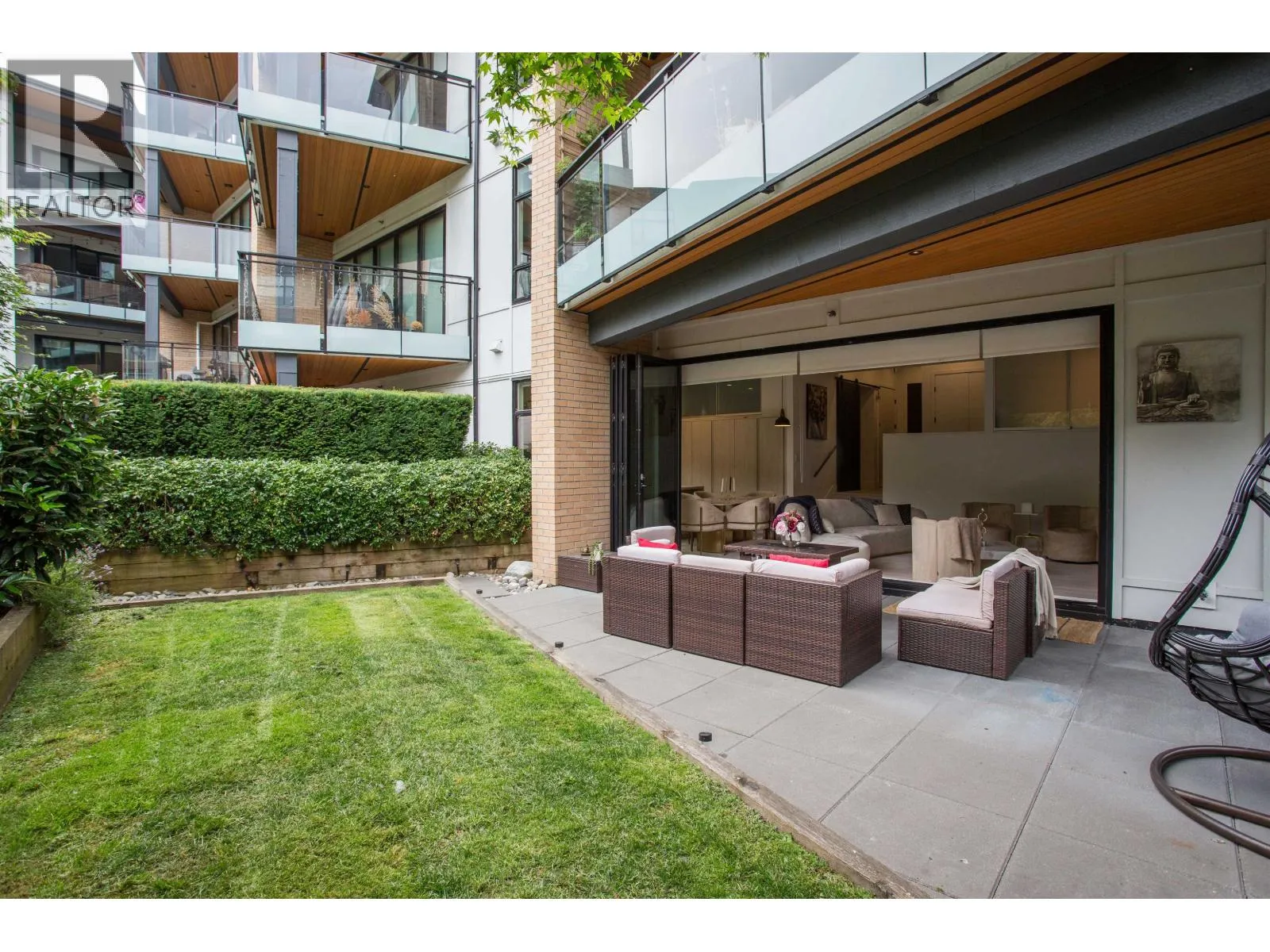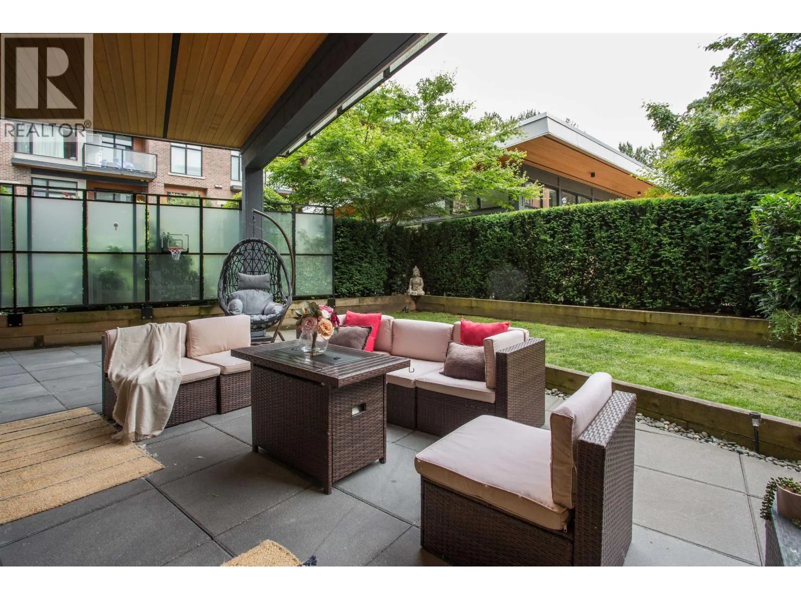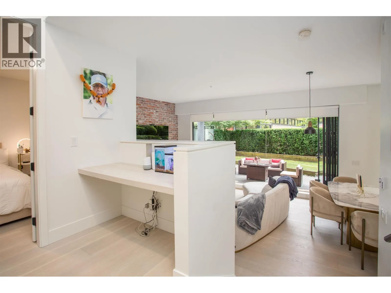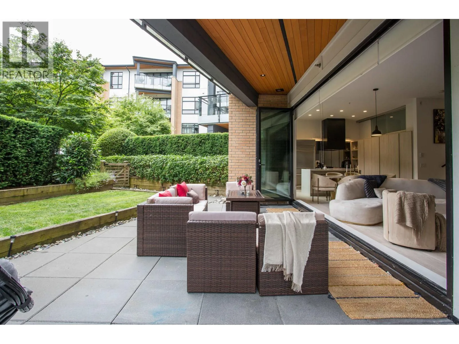 Welcome to Light House in Port Royal! This stunning 3 bed, 2 bath ground-level loft-style home features in-floor heating in both spacious bathrooms, engineered hardwood floors, and a beautiful brick feature wall. Accordion doors off the main living space open to a large patio and private yard-perfect for entertaining or letting the kids play. Filled with natural light and finished with care throughout. Family-friendly community with parks, shopping, and Q2Q Ferry access to SkyTrain and downtown New West. 2 Parking and a locker. EV Charger in parking spot! Open house Sunday November 16th 2-3PM. (id:27476)