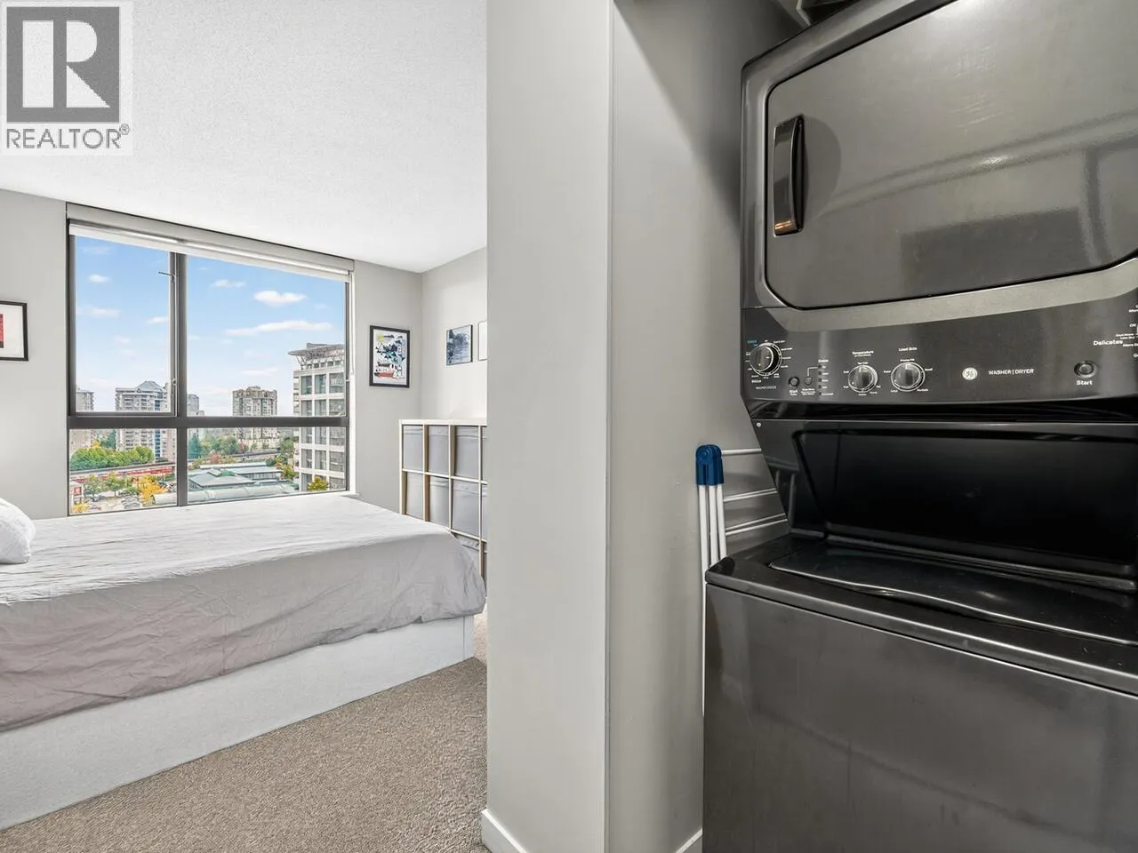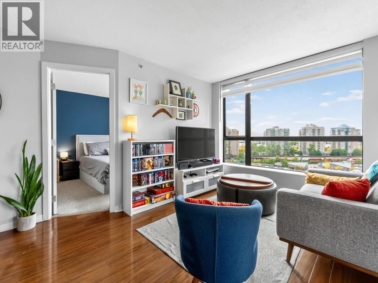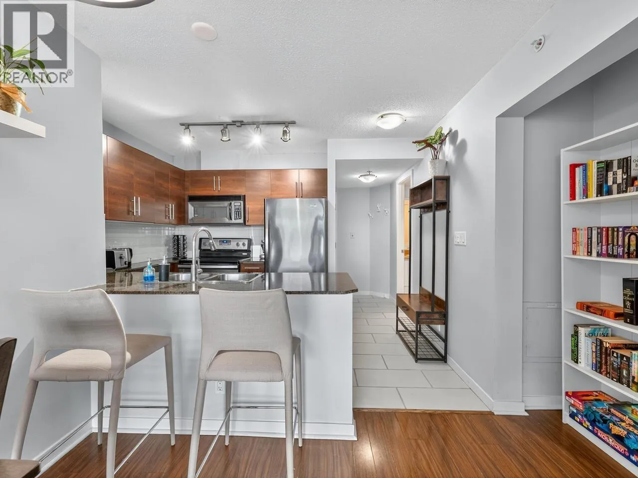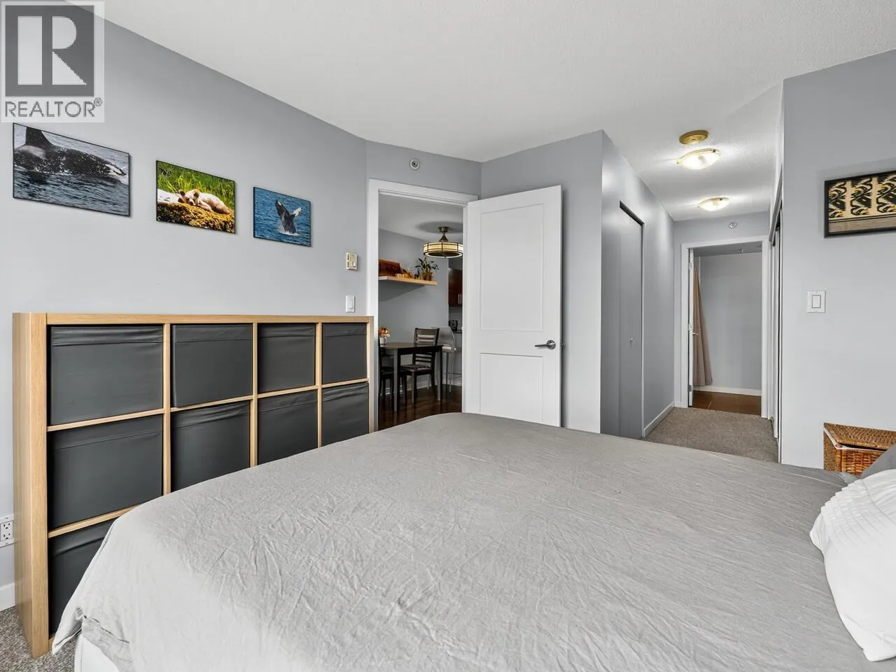 An incredible view is waiting for you at our corner suite home in downtown New West. A well cared for lobby greets you at the entry before you run upstairs. The covered balcony and living room offer an expensive view of New West Quay and Fraser River. Laminate wood floors flow through the living room and dining room, leading to an open kitchen with stainless steel appliances surrounded by granite countertops and a subway tile backsplash. Tile floors in the kitchen lead to the foyer and main four piece bathroom. The primary bedroom offers the same incredible view, and ample closet space sitting opposite the insuite laundry leading to the four piece en suite. The second bedroom sits on the opposite side of suite and looks out to the balcony. Off the lobby you'll find the well appointed fitness center. The News is located just steps from Columbia Square and one block further leads to New West skytrain station. 1 cat or dog allowed. 3D virtual tour at Realtor's site. (id:27476)