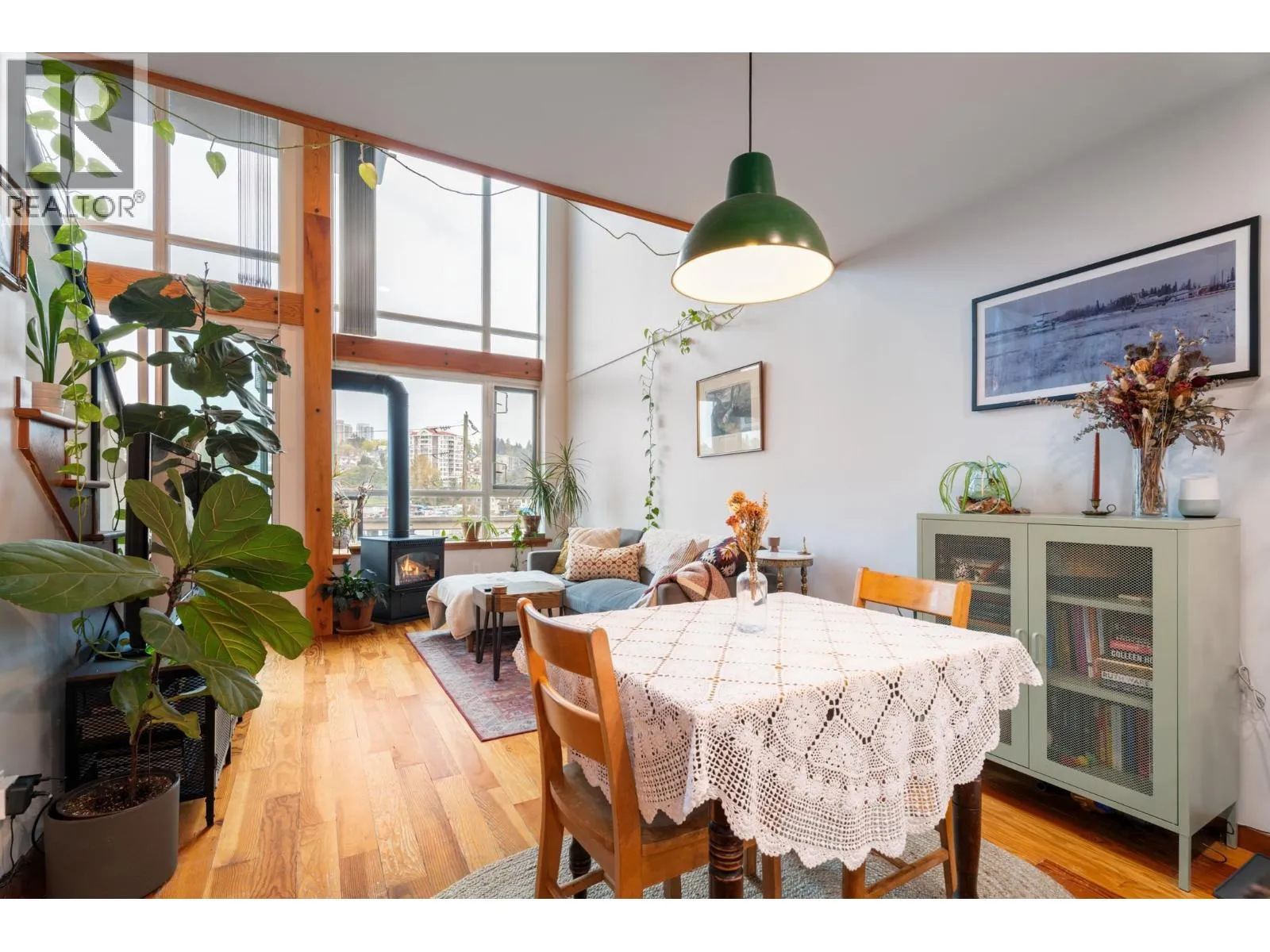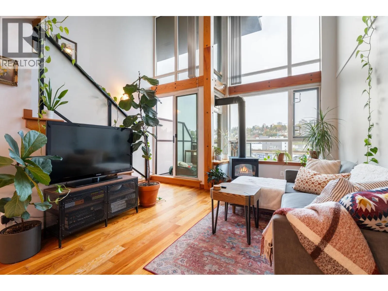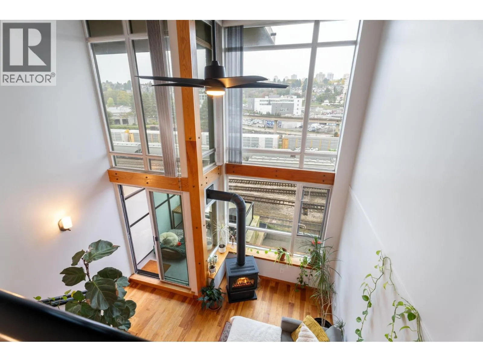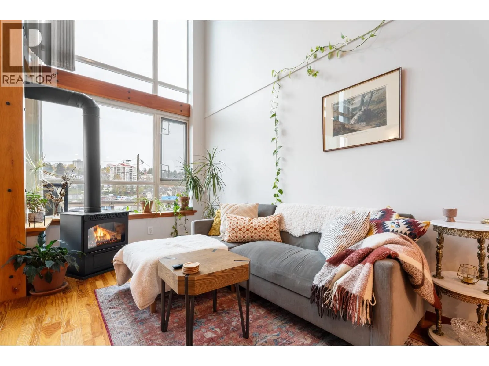 Spacious 1-bed, 1.5-bath loft at Murano Lofts! Bright open layout with 17-ft ceilings, large windows, and a private north-facing balcony. Features a gas fireplace, in-suite laundry, and 1 parking. Pet-friendly building with gym and gardens. Steps to the Boardwalk, SkyTrain, River Market, and shops. Urban living in a vibrant Quay community! (id:27476)