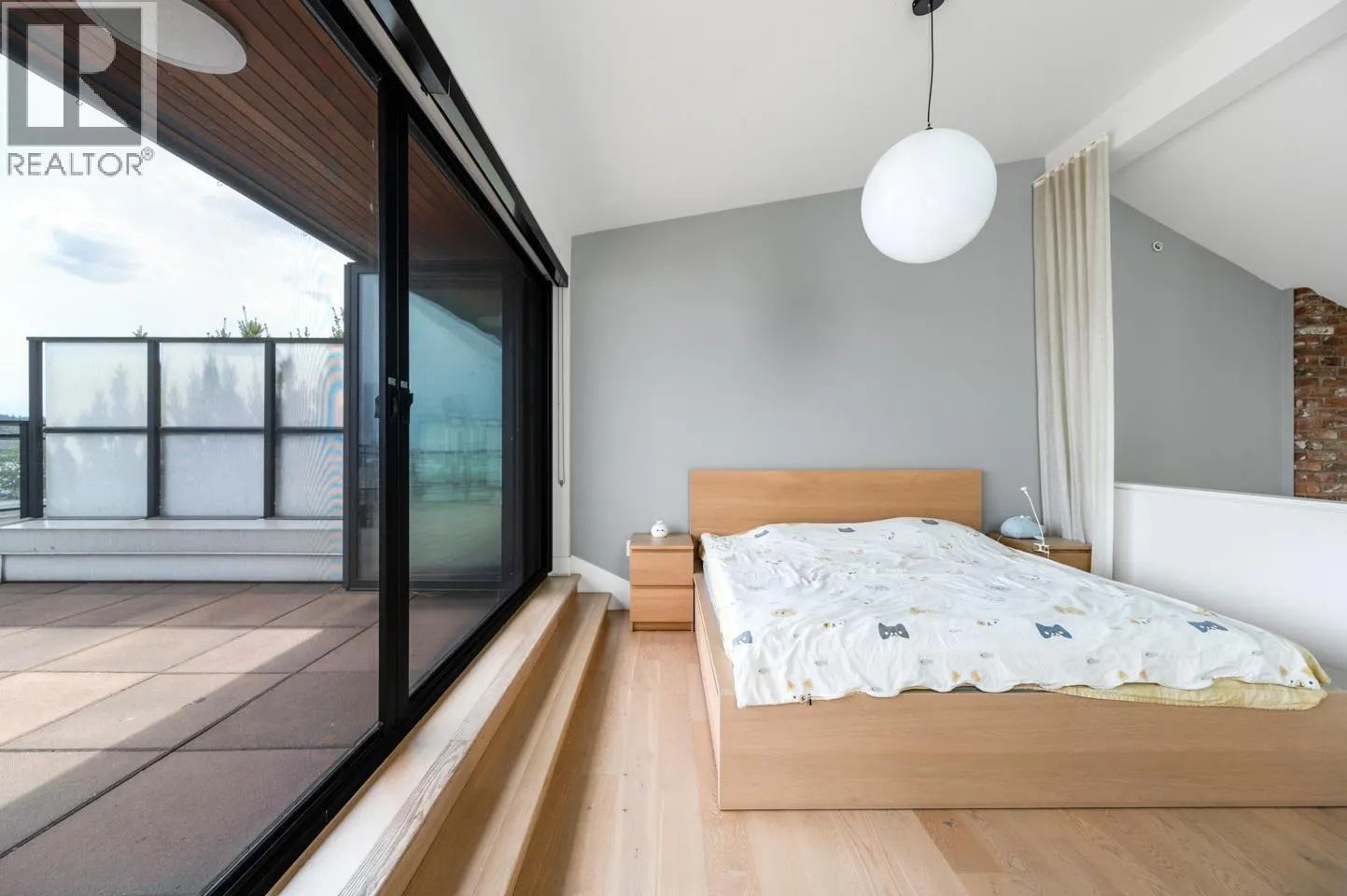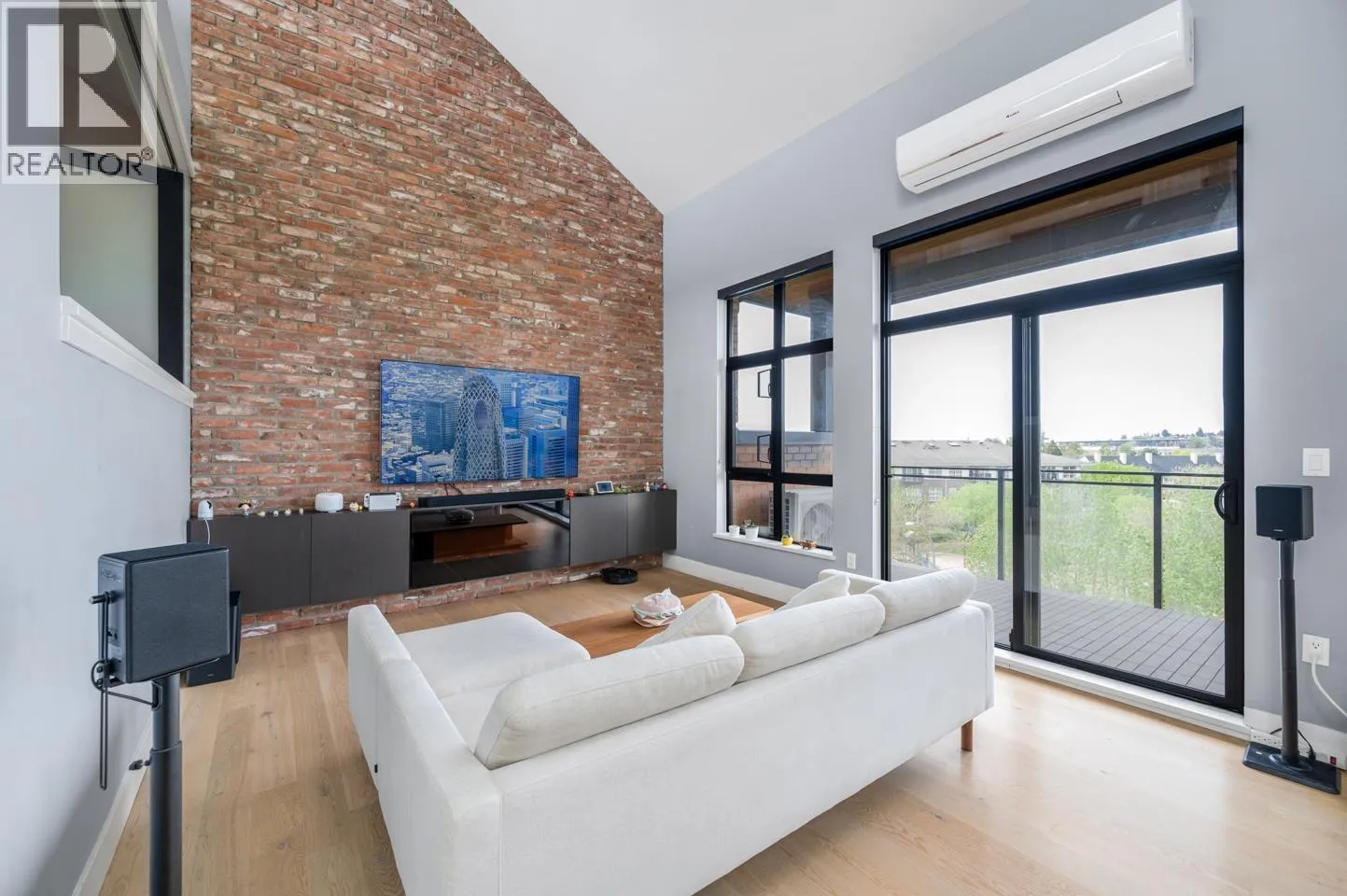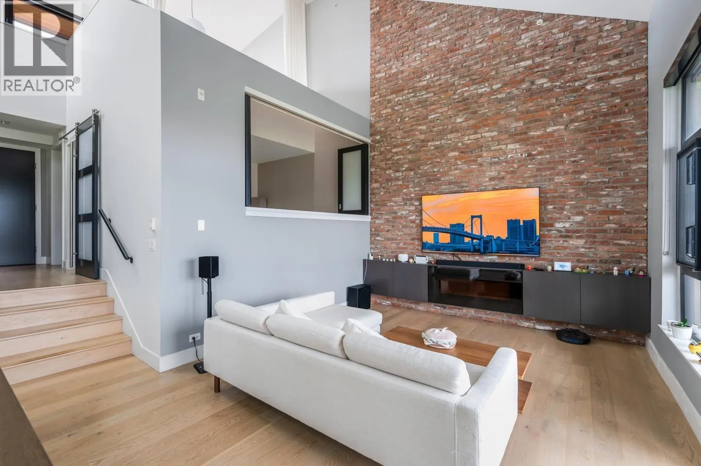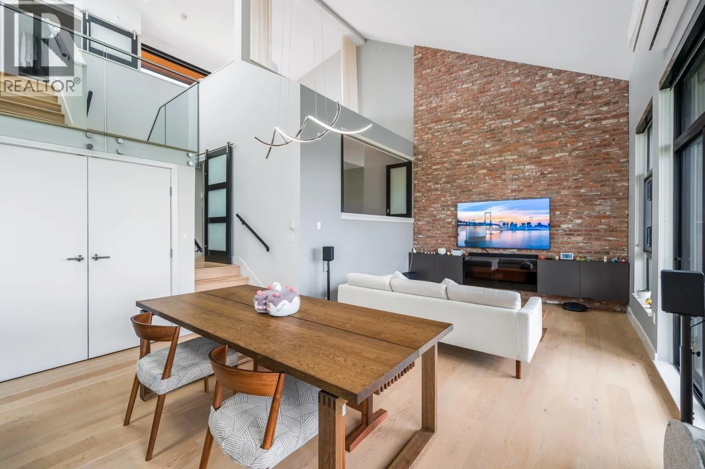 This rarely available penthouse offers a unique blend of modern elegance and urban charm. Featuring 2 bedrooms plus a loft (serve as the master bedroom), this residence boasts 20 ft ceilings, a stunning reclaimed brick feature wall, and an open concept kitchen equipped with quartz countertops and s/s appliances. The spacious dining/living room area provides the perfect setting for entertaining guests. The loft opens up to a magnificent 500 sqf rooftop patio, where you can enjoy mesmerizing water, mountain, and city views. With two parking stalls (one with EV charging rough-in) and one storage locker included, convenience is at your fingertips. Located steps away from the riverfront promenade and the Q2Q ferry, this penthouse offers unparalleled access to the best of New Westminster living. (id:27476)