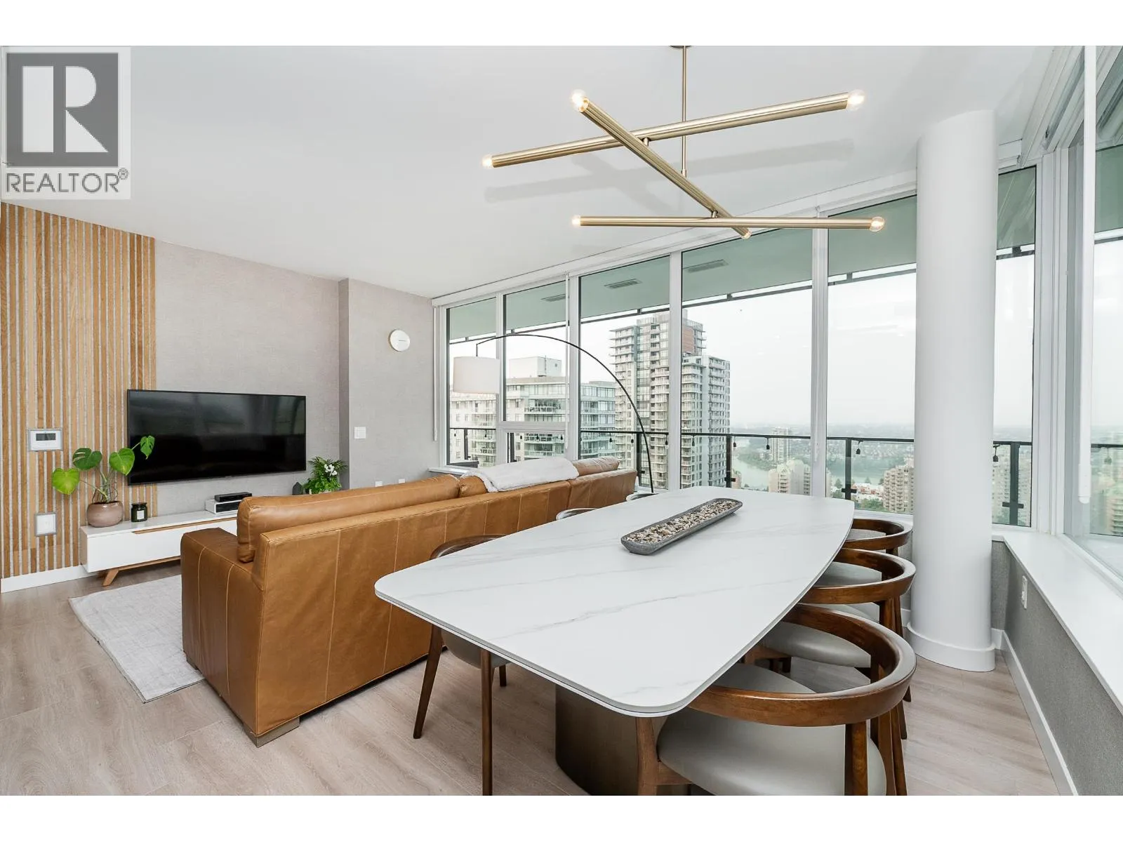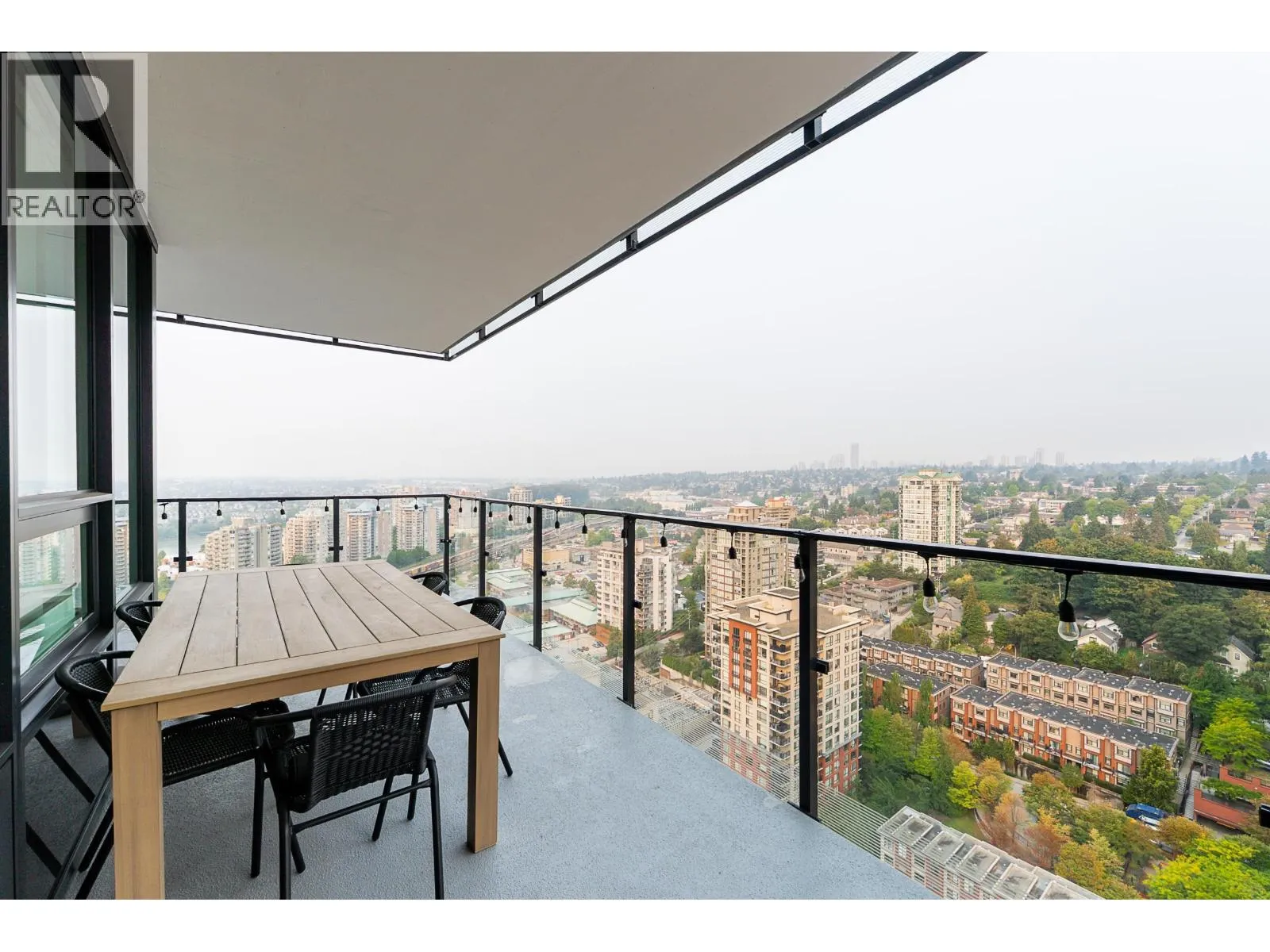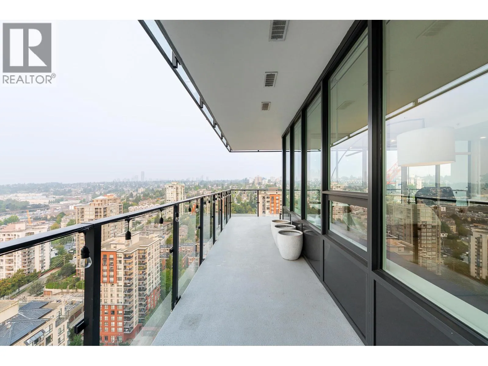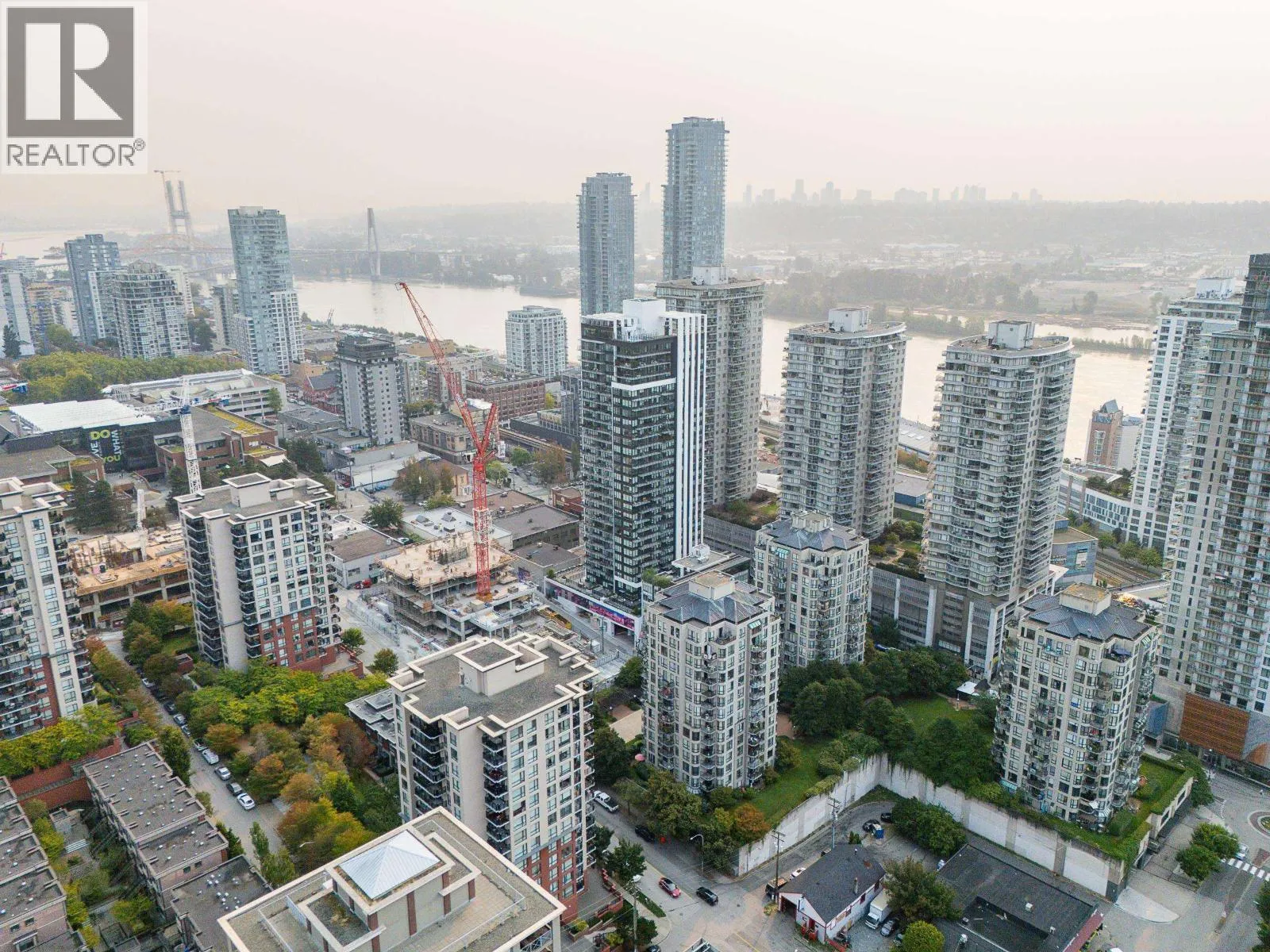 Sky-high luxury living at Ovation, in the heart of downtown New Westminster - NO GST! This beautifully updated 3 bed, 2 bath residence features 2 side-by-side parking stalls including an EV charger, 3 storage lockers, and 1245 sq/ft of luxurious living space. Incredible open layout, A/C, and breathtaking views through the oversized windows. The 458 square foot wrap-around balcony is perfect for entertaining, or morning coffee as the sun comes up. The gourmet kitchen offers a sleek design, integrated appliances, quartz counters and contemporary finishes. The spacious primary connects to the spa-like ensuite and large WIC. Outstanding amenities including a rooftop gym, hot tub, clubhouse, concierge services and more. Conveniently located within steps from Skytrain, shopping and restaurants. (id:27476)
