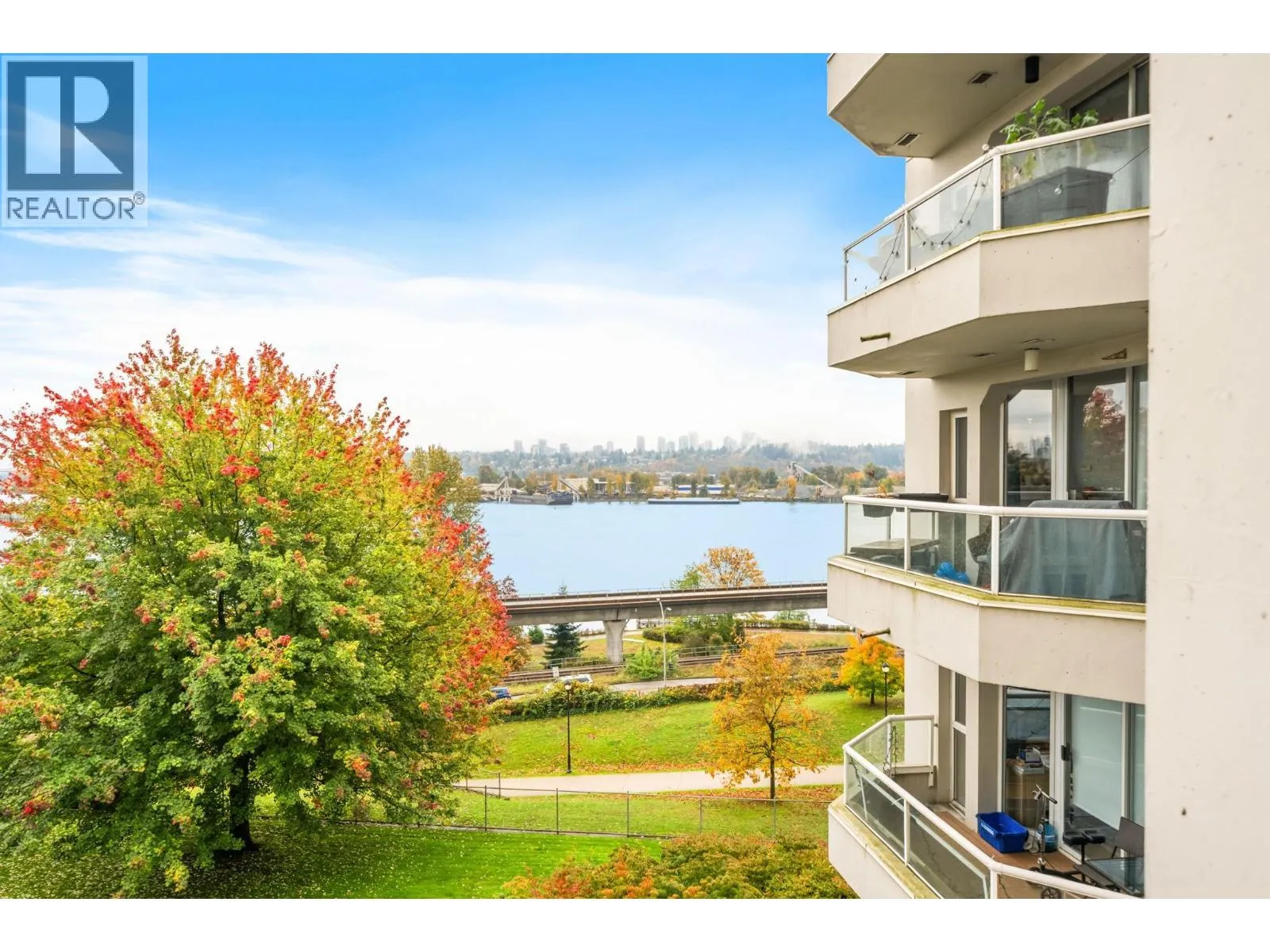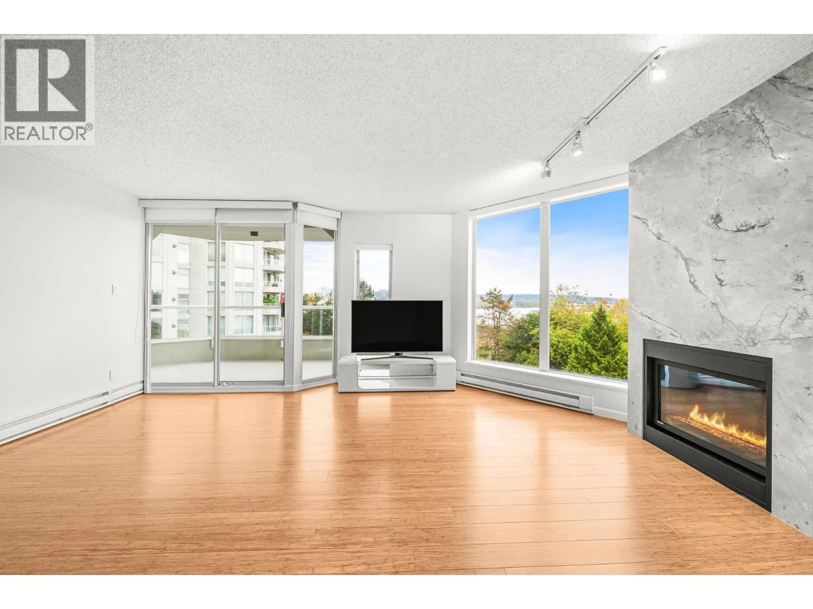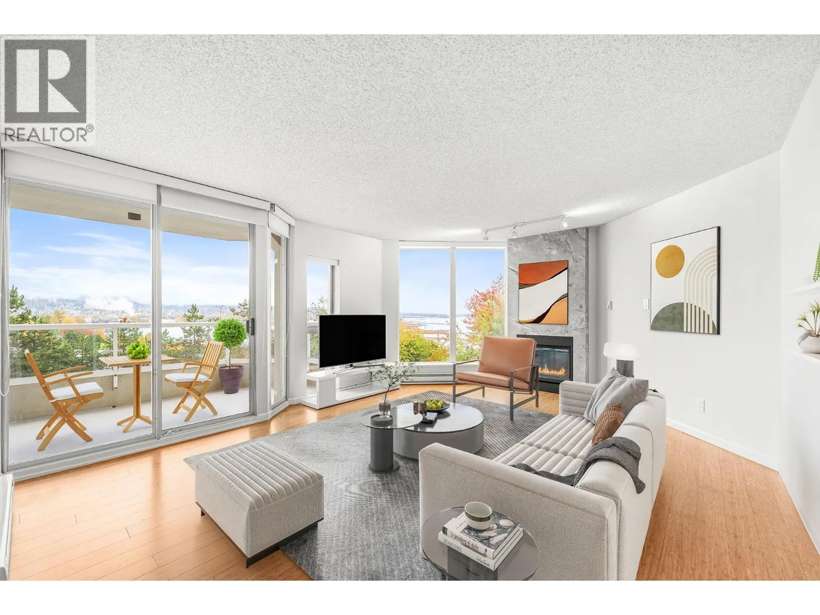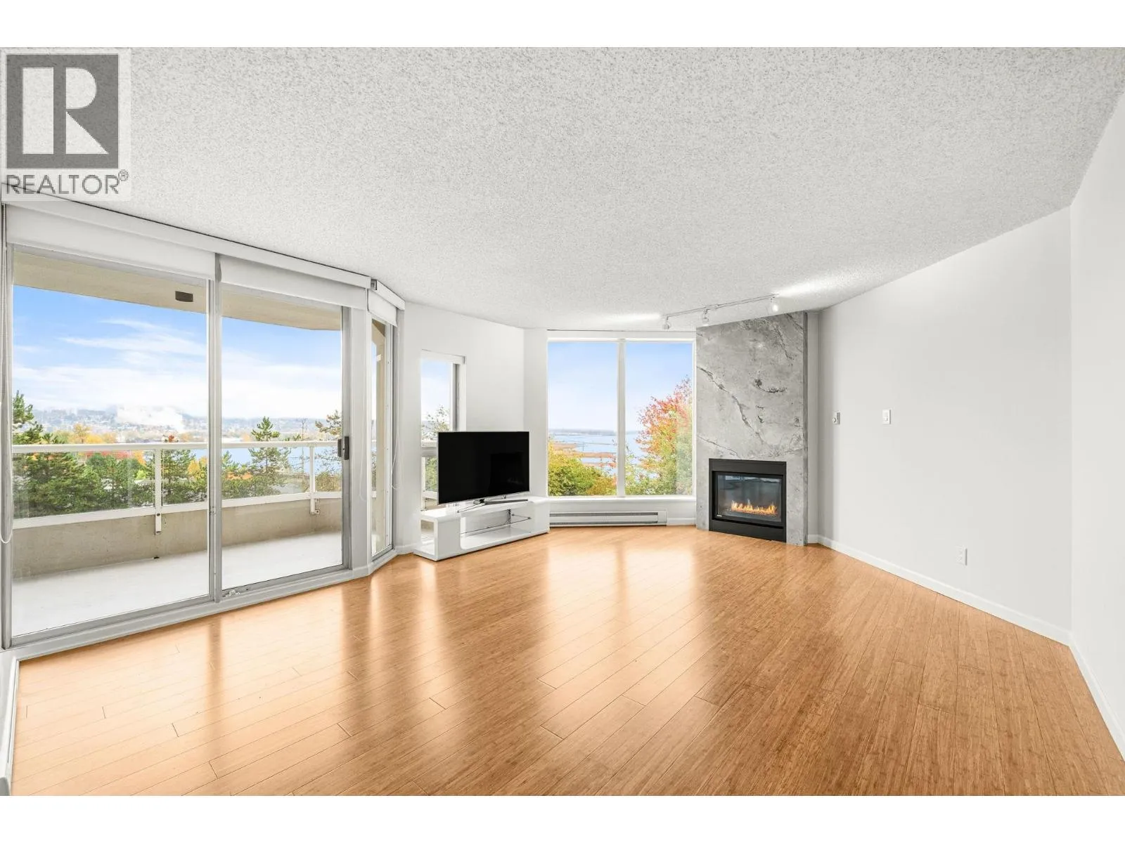 Stunning Fraser River & Mountain views from this beautifully renovated highly desirable '03' End Unit 2 bed 2 bath 1137 sf unit at Palace Quay! Fantastic open concept floorplan features solid engineered bamboo hardwood flooring, quartz counters, custom cabinetry, stainless steel appliances, 2 updated bathrooms. Large living/dining rooms with floor to ceiling windows showing off the beautiful view & an updated gas fireplace with custom marble surround. Good sized bedrooms incl spacious primary with walk through closets & 4 pce ensuite. Great location just a short walk to Glenbrook Ravine Park, Queens Park, Sapperton shopping, groceries, restaurants, cafes & skytrain. Building amenities: indoor pool/hot tub, gym. 1 parking & 1 storage! (id:27476)