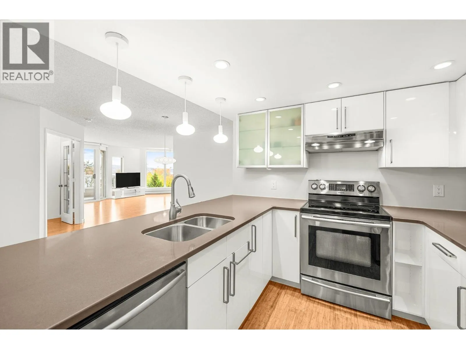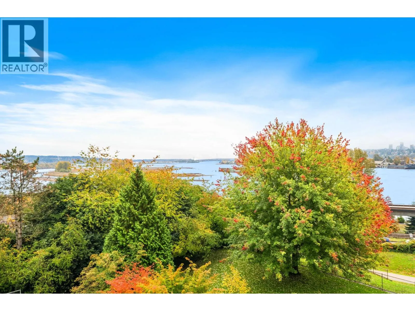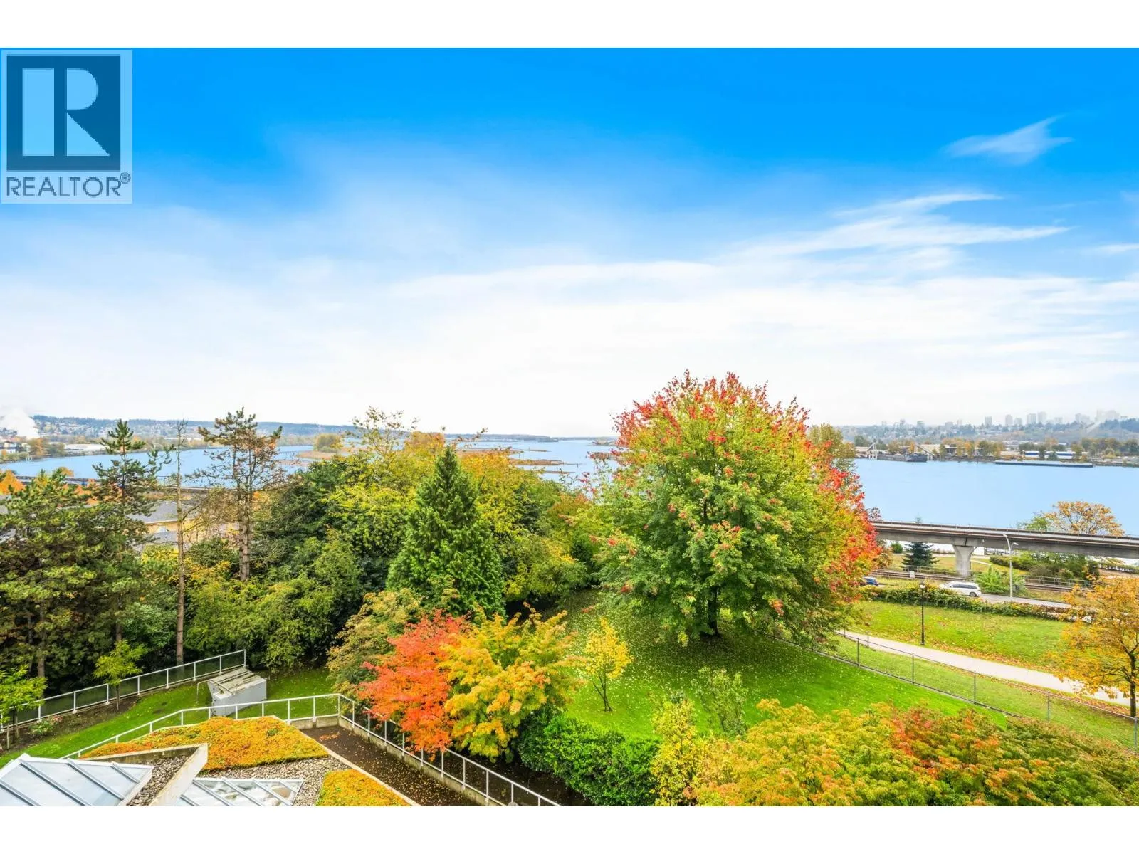 Stunning Fraser River & Mountain views from this beautifully renovated highly desirable '03' End Unit 2 bed 2 bath 1137 sf unit at Palace Quay! Fantastic open concept floorplan features solid engineered bamboo hardwood flooring, quartz counters, custom cabinetry, stainless steel appliances, 2 updated bathrooms. Large living/dining rooms with floor to ceiling windows showing off the beautiful view & an updated gas fireplace with custom marble surround. Good sized bedrooms incl spacious primary with walk through closets & 4 pce ensuite. Great location just a short walk to Glenbrook Ravine Park, Queens Park, Sapperton shopping, groceries, restaurants, cafes & skytrain. Building amenities: indoor pool/hot tub, gym. 1 parking & 1 storage! (id:27476)