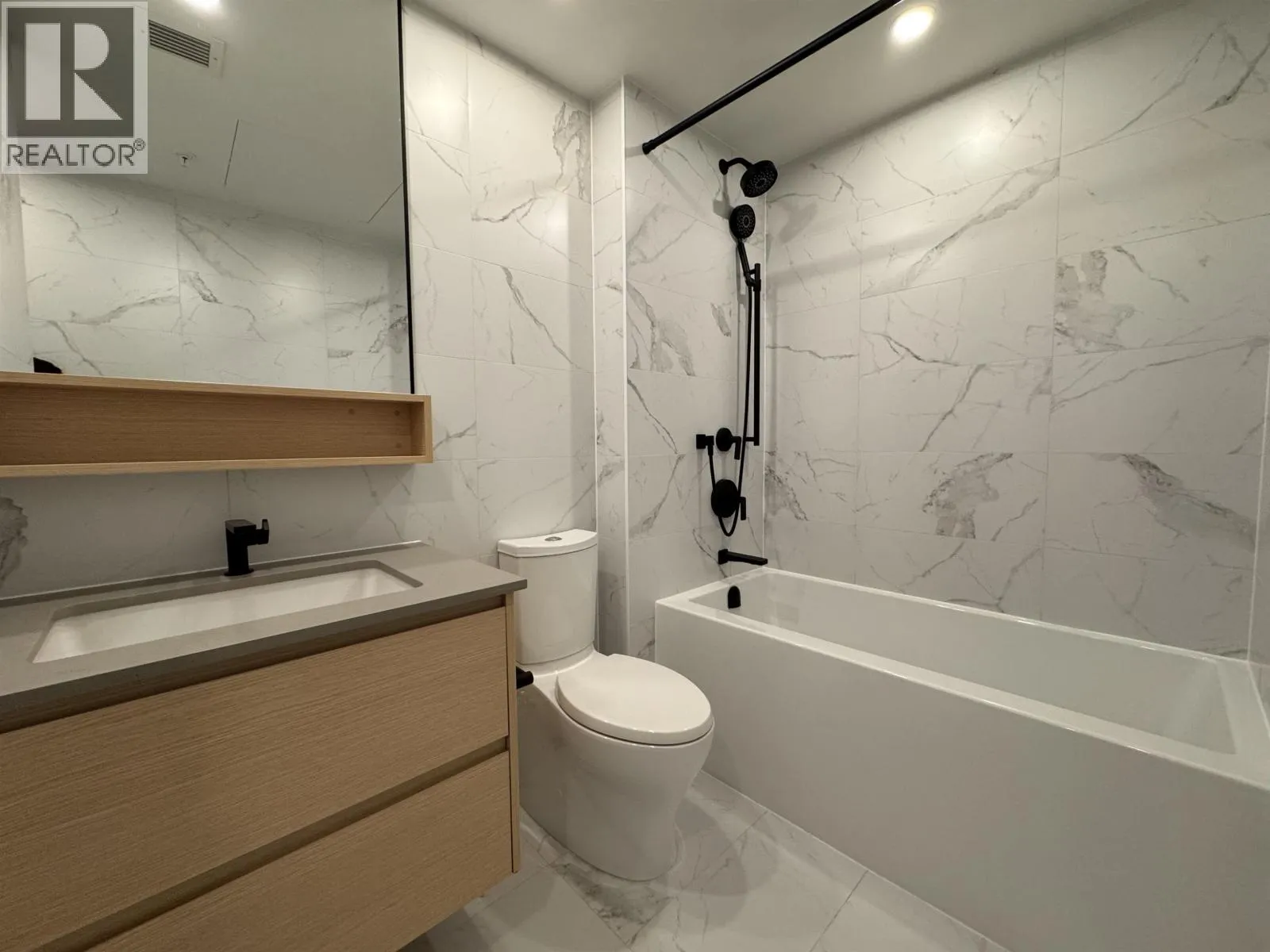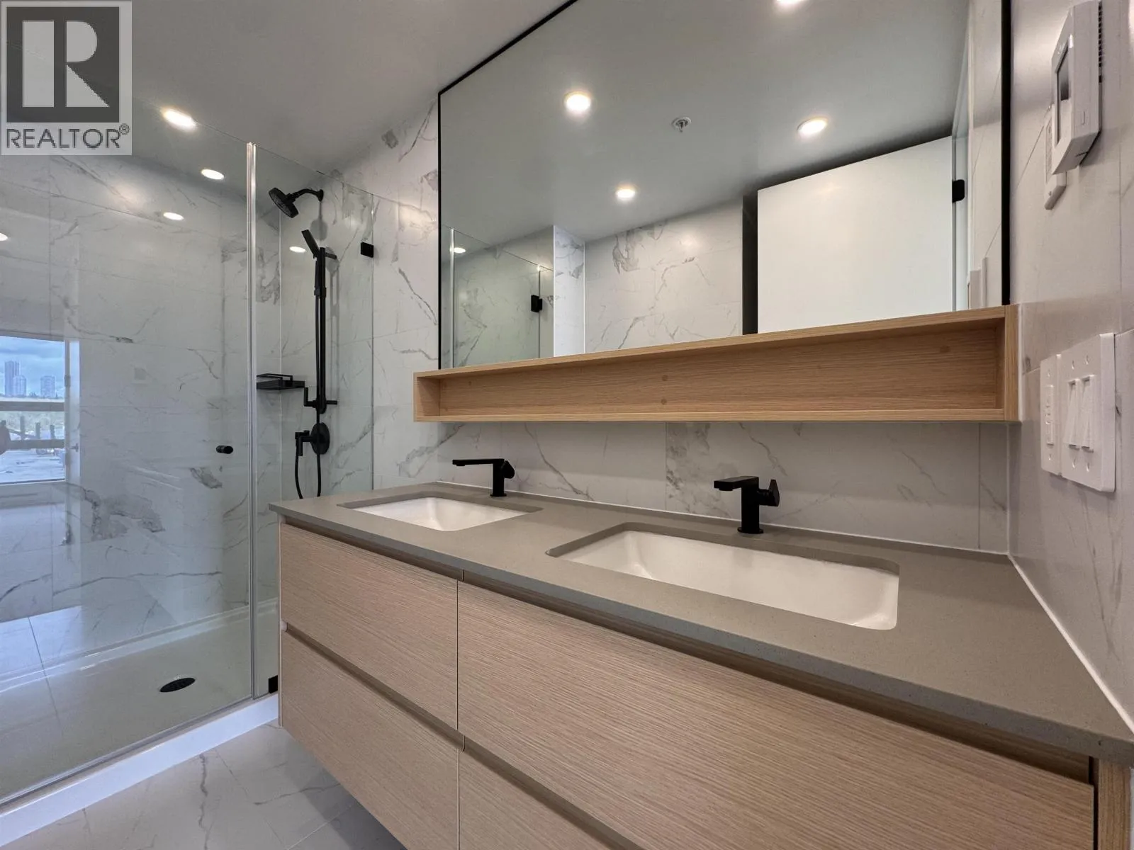 NEW PRICING & MOVE-IN READY! Welcome to Timber House by Aragon. This spacious 1,150 SF 2BR, 2 bath corner home offers lots of windows, natural light & a wide living/dining layout for flexible living & a large balcony. Modern, high-design interiors feature exposed CLT panels, wide-plank oak floors, black roller blinds & A/C. The sleek kitchen offers full size Fisher Paykel + Smeg appliances, quartz counters, matte black hardware. Spa-inspired baths feature heated floors, floating vanities & frameless glass showers. Building amenities include: Courtyard, gym, BBQ area, dog wash, 1 parking (EV-ready opt), 1 storage. Steps to the boardwalk, 12 min to DT New West, 30 min to YVR, 35 min to DT Van. Sales Centre Closed for Christmas Holidays until January 3rd. Showings by private appointment. (id:27476)