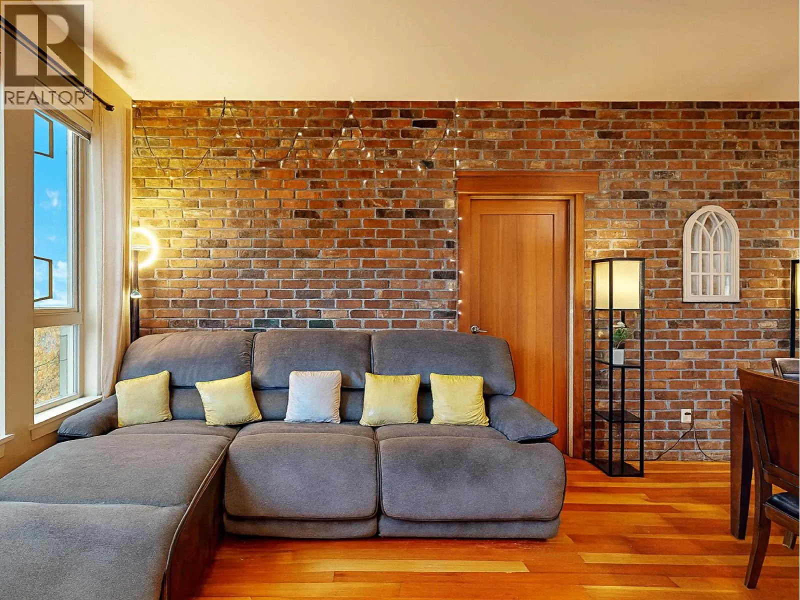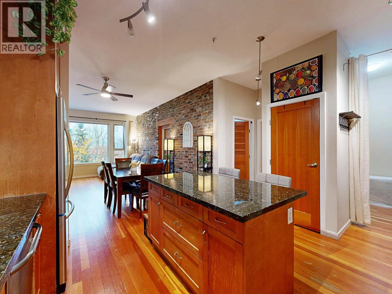 RARE SOUTH-FACING WATER-VIEW GEM at Paddlers Landing! Wake up to sparkling Fraser River views and step straight out onto the riverfront boardwalk - this is waterfront living without the million-dollar price tag! This stunning 2 bed + den, 2 full bath unit feels massive thanks to soaring 10-ft ceilings, walls of windows, and over 1,031 square ft of beautifully curated space. Gorgeous hardwood floors flow past a jaw-dropping exposed brick feature wall into the chef's kitchen with gas range, stainless appliances, granite counters & rich maple cabinets. Master bedroom boasts custom closet organizers + spa-like 4-pc ensuite. In-suite laundry and 1 parking. Pets & rentals welcome! Queensborough Landing shops, cafes & transit close-by. Quick hop to Hwy 91A/99. Come fall in love & book private showing (id:27476)