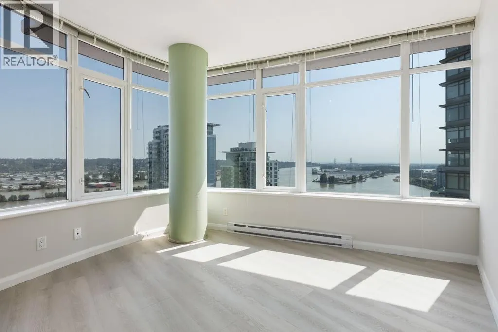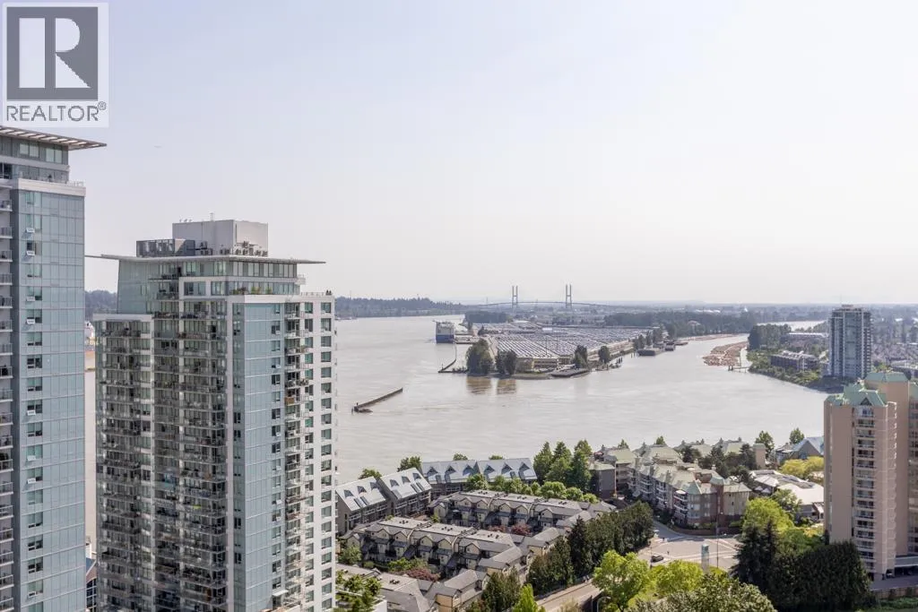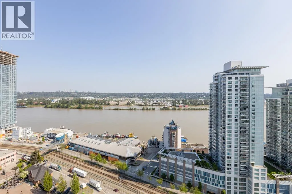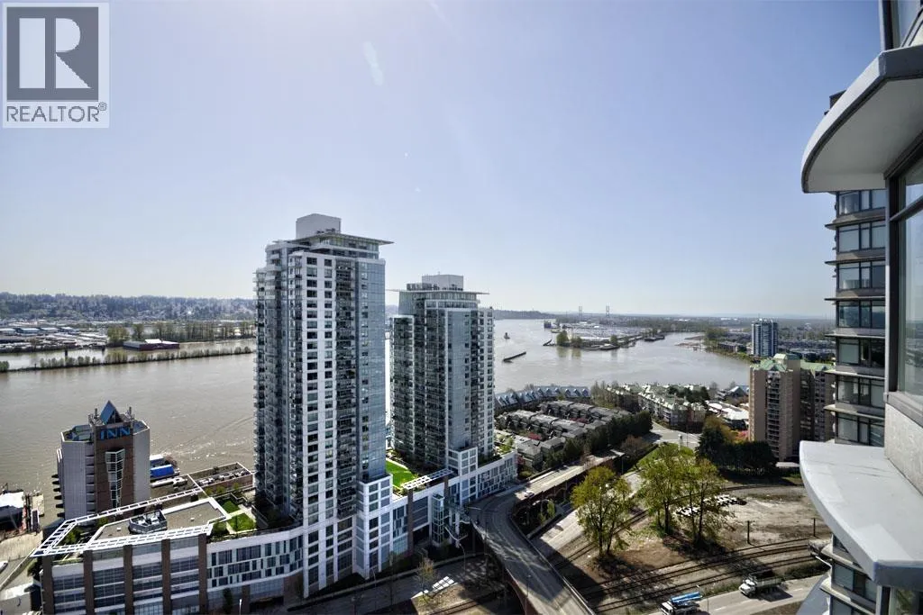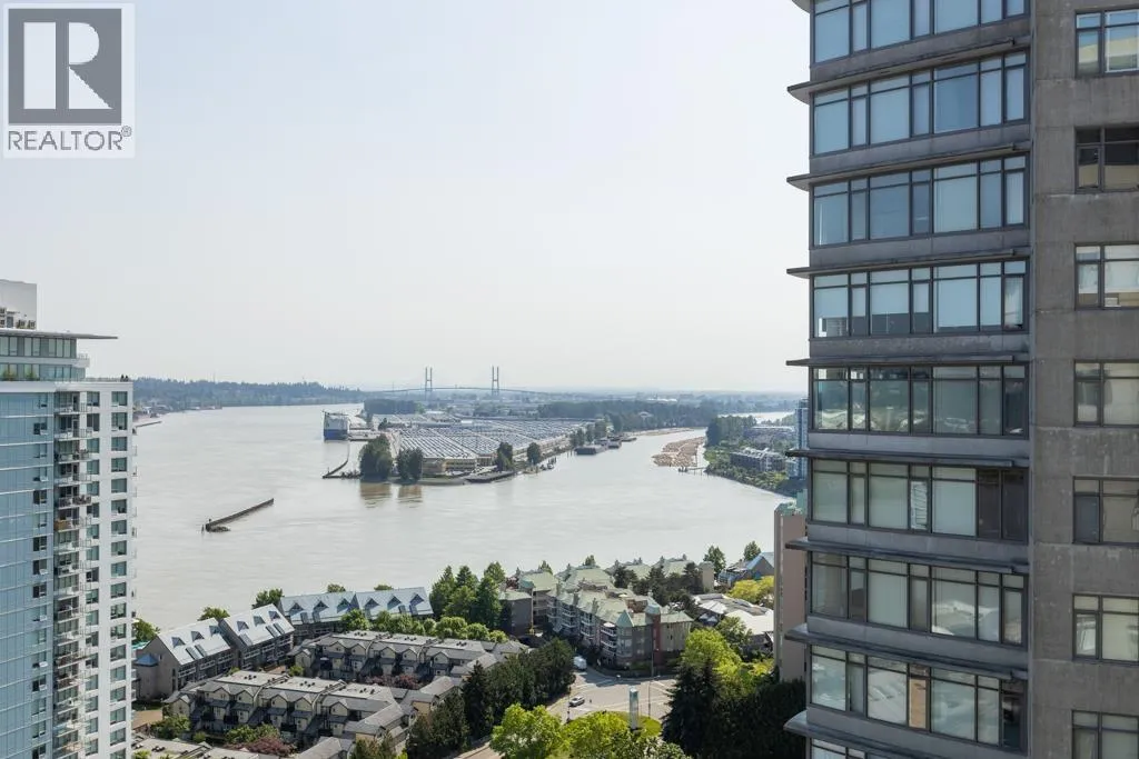 This south-facing, updated, 1151sf, 2 bedrooms + den, 2 bathrooms condo comes with a 148sf balcony overlooking the Fraser River, Downtown New Westminster, Queensborough Island, Annacis Island and Fraser Valley. This condo has a unique layout catering to the gorgeous views and exposing both bedrooms and the living area to plenty of sunshine year round. The living room has two sides of glass walls with lovely views. To the side is the dining room with a beautiful chandelier and access to the view balcony. The open kitchen features 3 sides of cabinets, a serving island with stone countertops and stainless steel appliances. (id:27476)