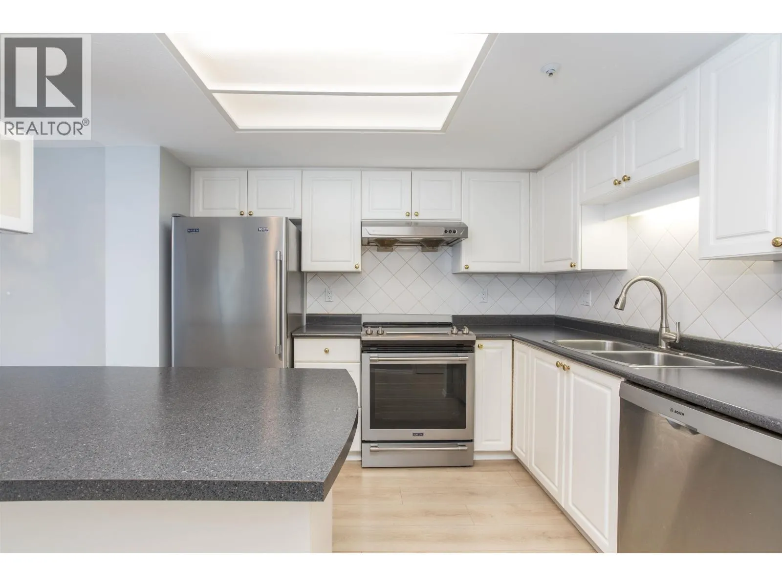 Stirling Place by Bosa! This bright 2 bedroom, 2 full bath and 2 balcony NE corner home has an updated kitchen with newer stainless steel appliances and newer laminate flooring. The large Primary has 4 piece ensuite, and both bedrooms have sliding glass doors out a balcony. The spacious living room will fit your house sized furniture, with cozy gas fireplace (incl in maint fee!) and double doors opening to another balcony. The dining room is open to the kitchen for easy entertaining. 1 large EV ready parking, lots of visitor parking and full size secure locker. Exercise room and club room in lobby, bike room and workshop in garage. Piping and elevators updated. Attentive onsite caretaker and proactive council. Solid concrete highrise in the heart of Uptown - across from Royal Centre Mall & Save On Foods, with all the shops and eats along Sixth St. Moody Park and Century House at the end of the block, medical, schools and library all just steps away. Sorry, no pets. OPEN HOUSE: Sa (id:27476)