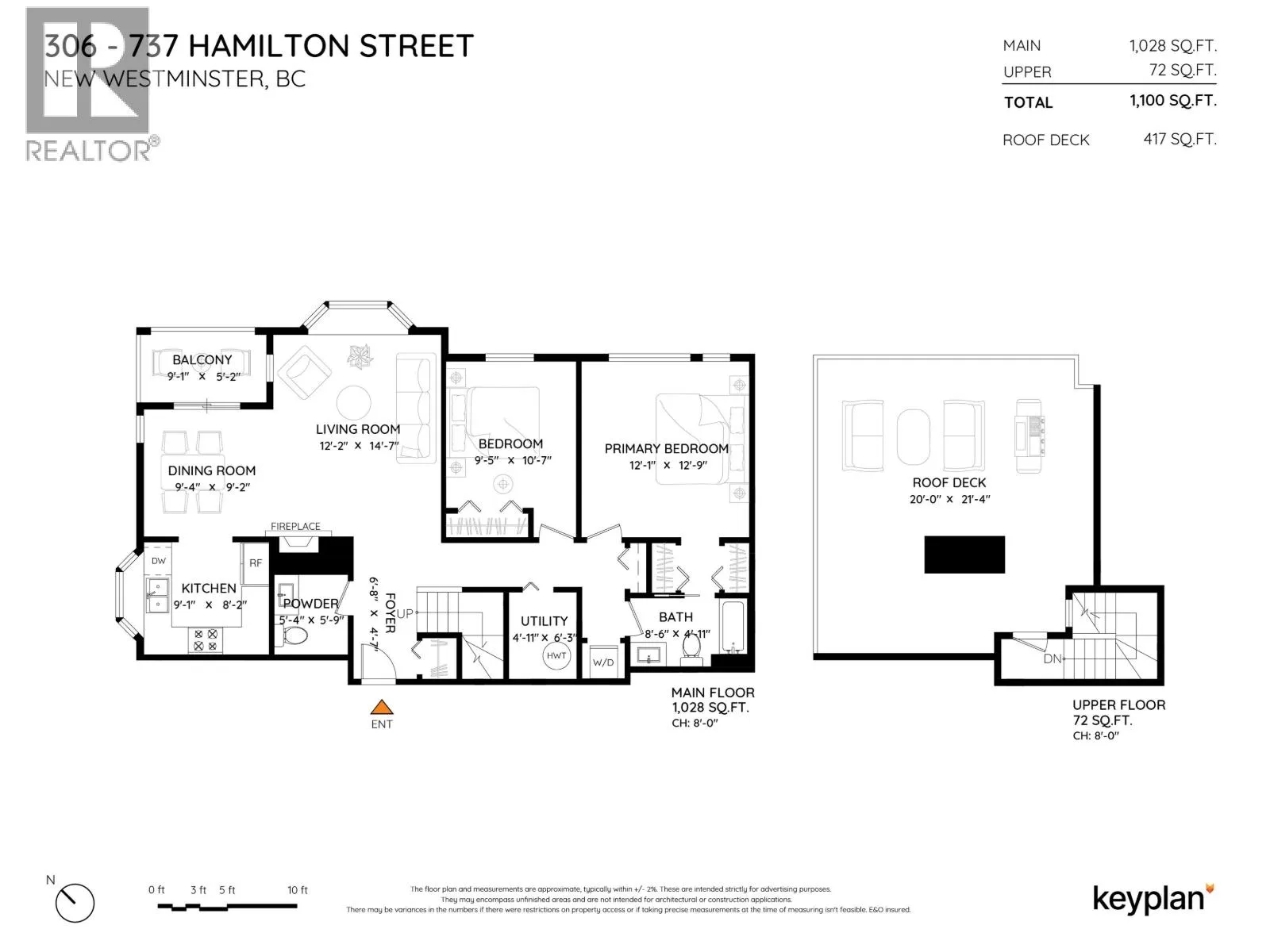 TOP FLOOR, CORNER 2 BED & 1.5 BATH updated suite with generous, private rooftop deck perfect for entertaining, BBQ, gardening or as an extension of your living space. Bright & spacious, 1100 square ft featuring new carpets throughout, fresh paint, upgraded appliances & light fixtures, newer HW tank (2023), 2 upgraded smart thermostats, wood burning FP, ample storage & covered balcony off the dining area. Recent building upgrades include: Fire Alarm System upgrades, 2 EV charger parking stalls in parkade & Telus Fibre Optics soon to be installed. Located in very convenient Uptown neighbourhood steps away from Moody Park, Royal City Center, transit, banks, shopping, library, restaurants, cafes & more! 1 Parking & 1 Storage included. Rentals allowed! No dogs permitted. ***OPEN HOUSE SAT JAN 10TH 2-4PM*** (id:27476)