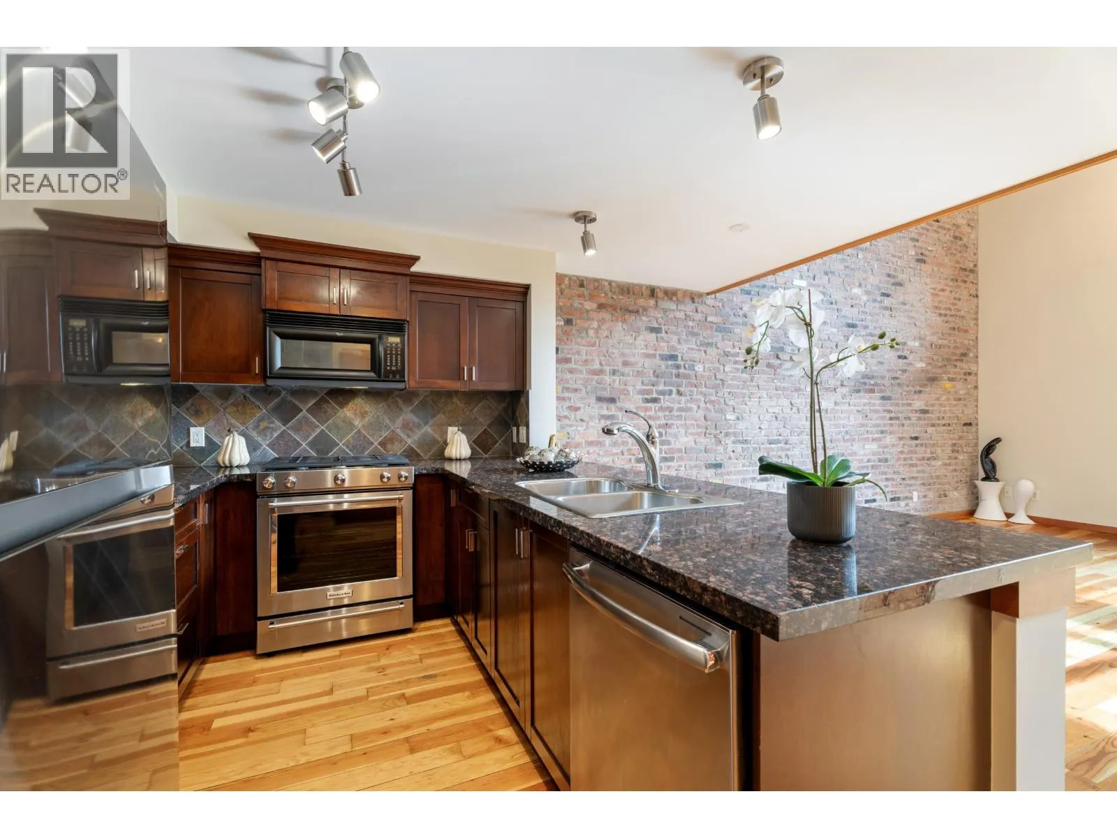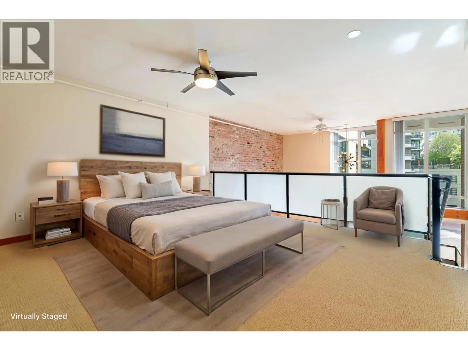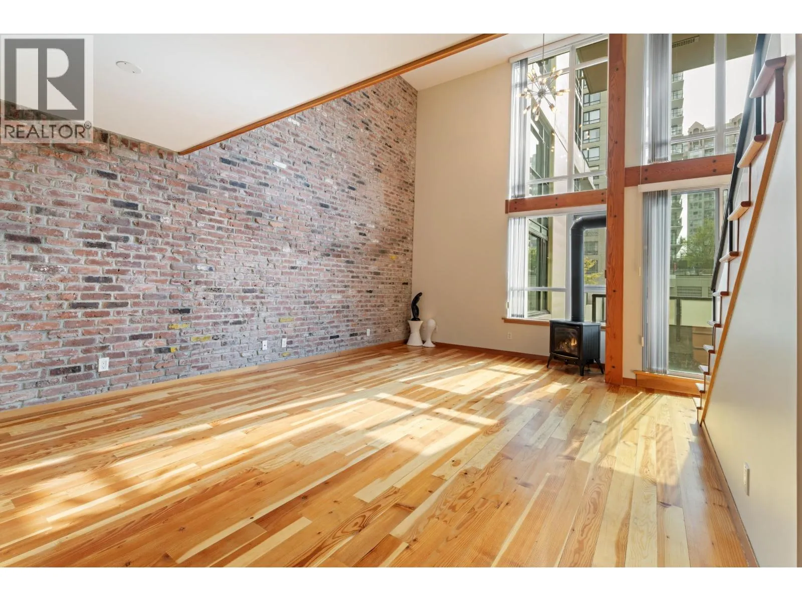 Experience urban living at its finest in this spacious and stylish 2-level loft, inspired by the iconic design of New York´s Soho district. One of the largest one-bedroom layouts in the building, this home offers a perfect blend of openness, character, and functionality. Dramatic 17-foot ceilings and expansive windows flood the space with natural light, while the exposed brick wall adds an authentic loft feel. The open main level includes a modern kitchen with granite counters and stainless steel appliances, plus a gas fireplace for added warmth and charm. Upstairs, the loft bedroom overlooks the living space and features a walk-in closet and in-suite laundry with updated washer and dryer. Freshly painted and move-in ready, this home includes 1 secure parking stall and a storage locker conveniently located on the same floor. This home offers front-row access to New Westminster´s premier waterfront destination. Enjoy artisan dining at the River Market, weekend strolls along the picturesque boardwalk. (id:27476)
