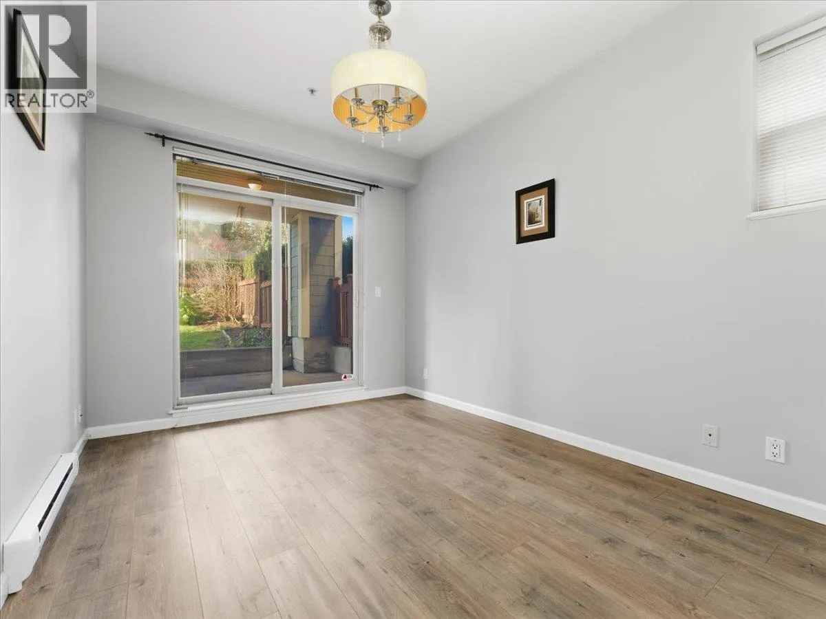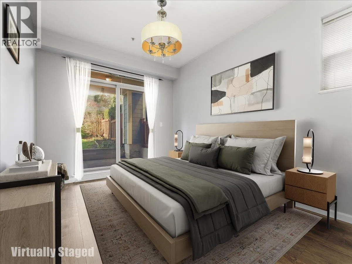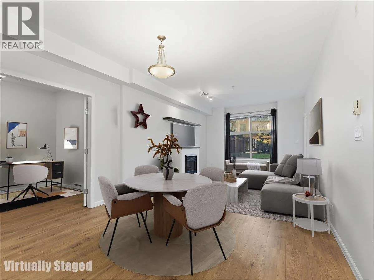 Rare ground floor end unit with private garden at The Grove. Thoughtfully designed 1 bed plus oversized den offers the flexibility of a 2nd bedroom or ideal work from home setup. Soaring high ceilings & airy atmosphere from the moment you step inside. Kitchen is both functional and stylish, featuring stainless steel appliances, durable countertops & generous storage. New Laminate floor. Step outside to your fully fenced patio & yard, a standout feature rarely found, offering the perfect setting for outdoor entertaining or pet friendly living. The spacious primary bedroom includes a walk-in closet, while the versatile den adapts easily to your lifestyle needs. Amenities: gym, theatre, lounge. close to parks / dog park, scenic trails, transit, schools, visitor parking available. Open House Sat Feb 14th 1pm -3pm (id:27476)