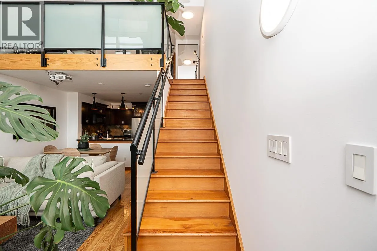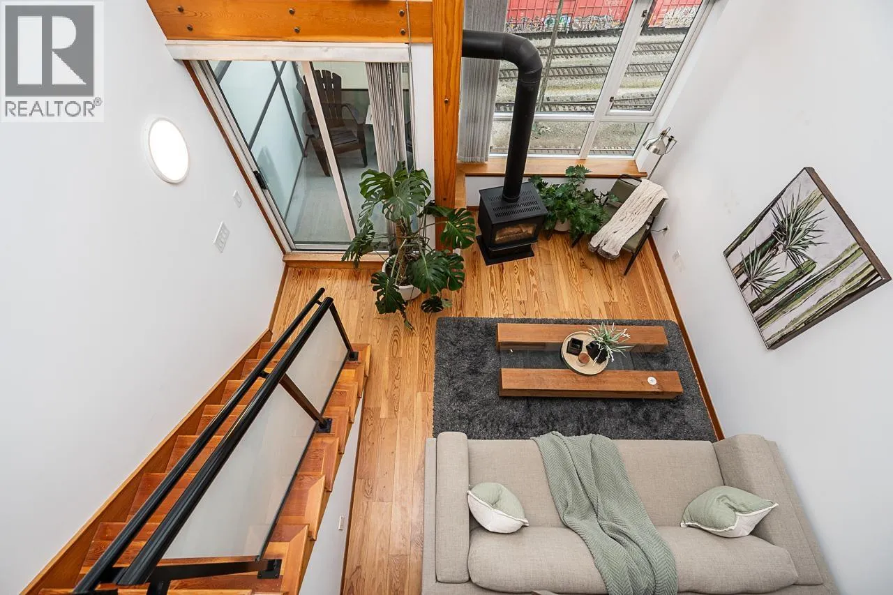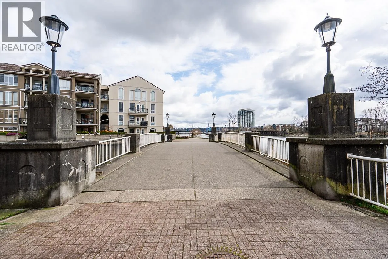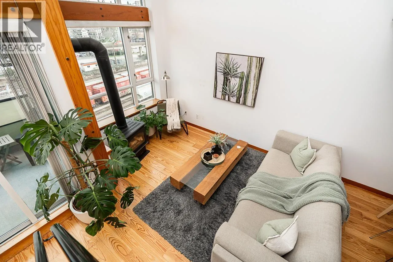 Welcome to Murano Lofts by Aragon Properties, where heritage charm meets modern loft living in a peaceful waterfront community. This bright two-level loft features 16´7" ceilings and expansive windows that fill the home with natural light. The open kitchen offers quartz countertops, a gas range, stainless steel appliances, and ample cabinetry. Upstairs, the spacious loft-style bedroom easily fits a king bed and includes a walk-in closet. Warm fir wood floors and a cozy natural gas fireplace add character. Amenities include a gym and guest suite, plus one parking stall and storage locker. Steps to the river boardwalk, parks, restaurants, River Market, and cinema, and only 5 minutes by bus to New Westminster SkyTrain. Unique loft living in a fantastic location! (id:27476)