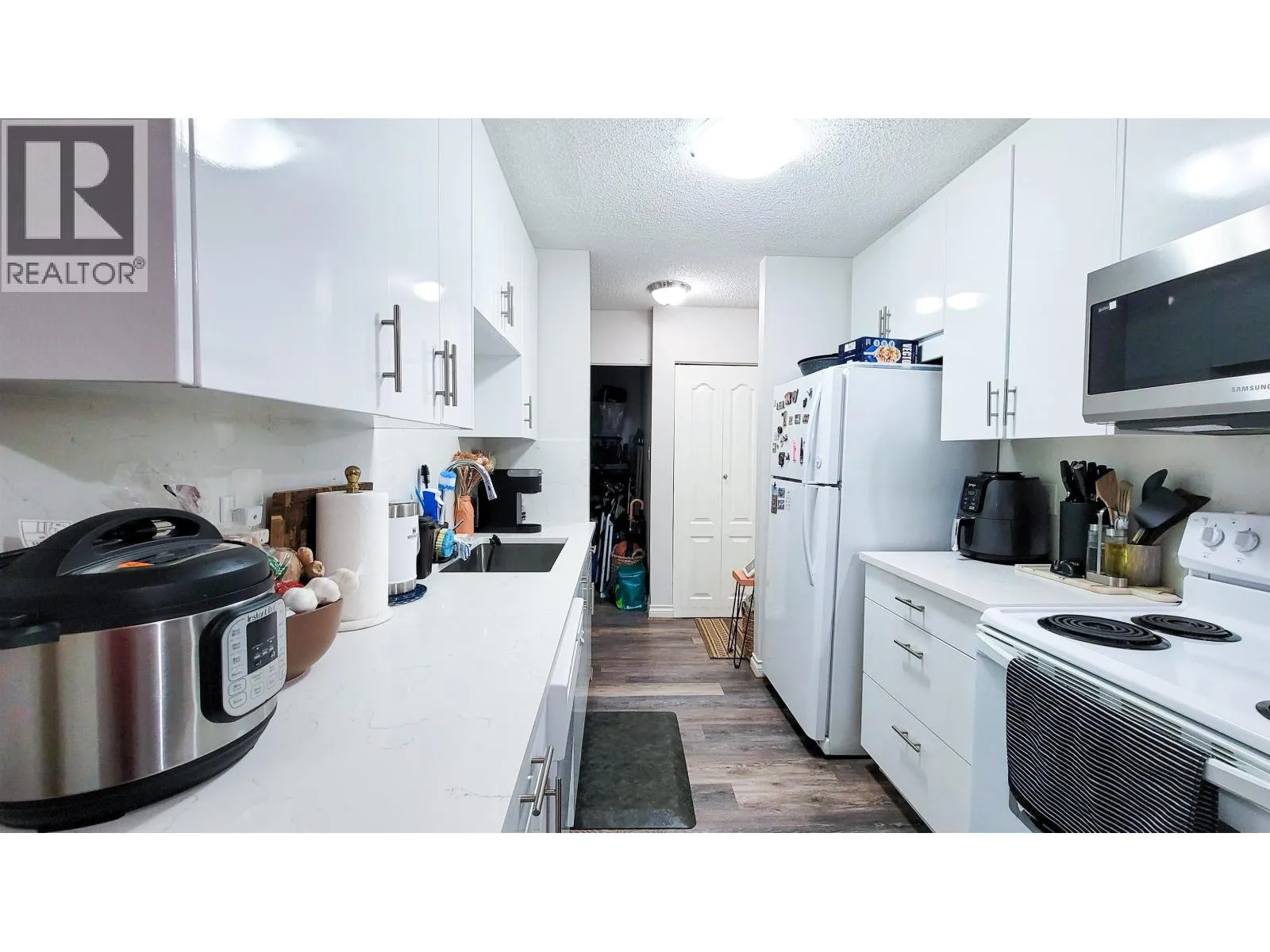 A very well cared 1-bedroom home with updated kitchen and washroom. This home offers custom-made quartz counter top and custom-made cabinetry. You will enjoy the updated stainless steel built-in microwave and hood range, new kitchen sink and faucet. The washroom has been updated with custom-made quartz counter top, drawers, and new toilet. This home has been owner occupied and been well taken care of. Enjoy 1 enclosed and secured garage parking and 1 enclosed and secured storage locker. This home is only minutes away from IHOP, Save-on-Foods, Walmart, Kin's Farm Market, Massey Theatre, Royal City Musical & Moody Park, and shopping amenities! Call now to book your appointment! (id:27476)