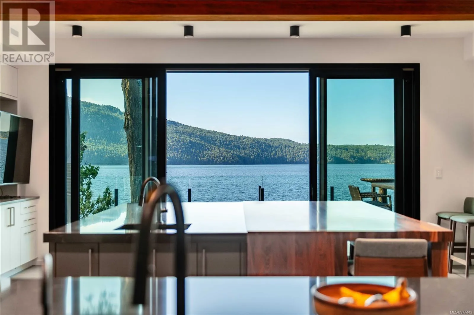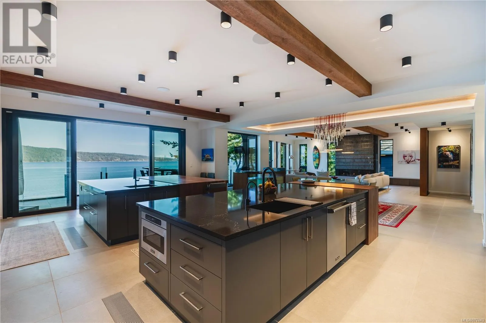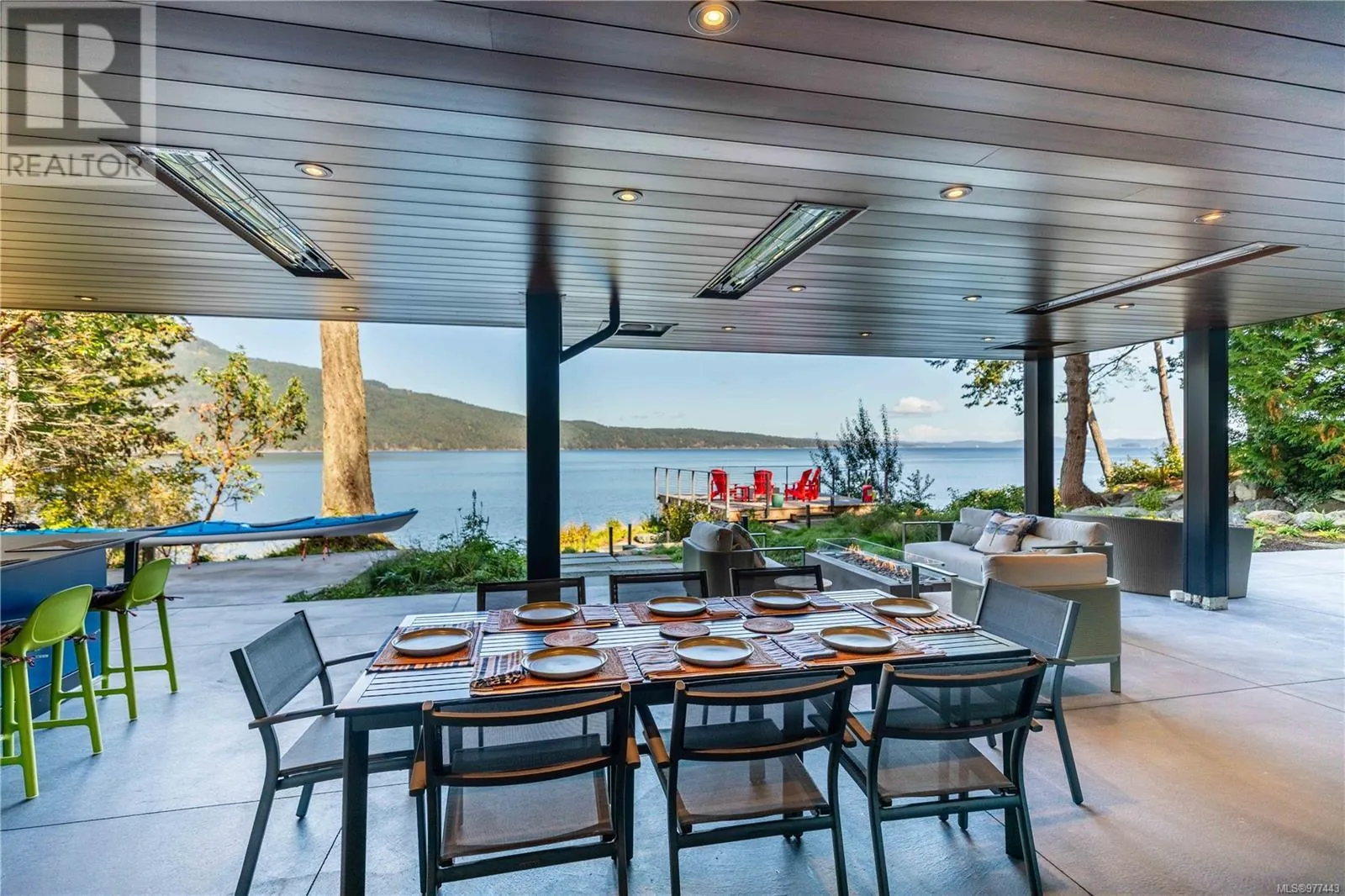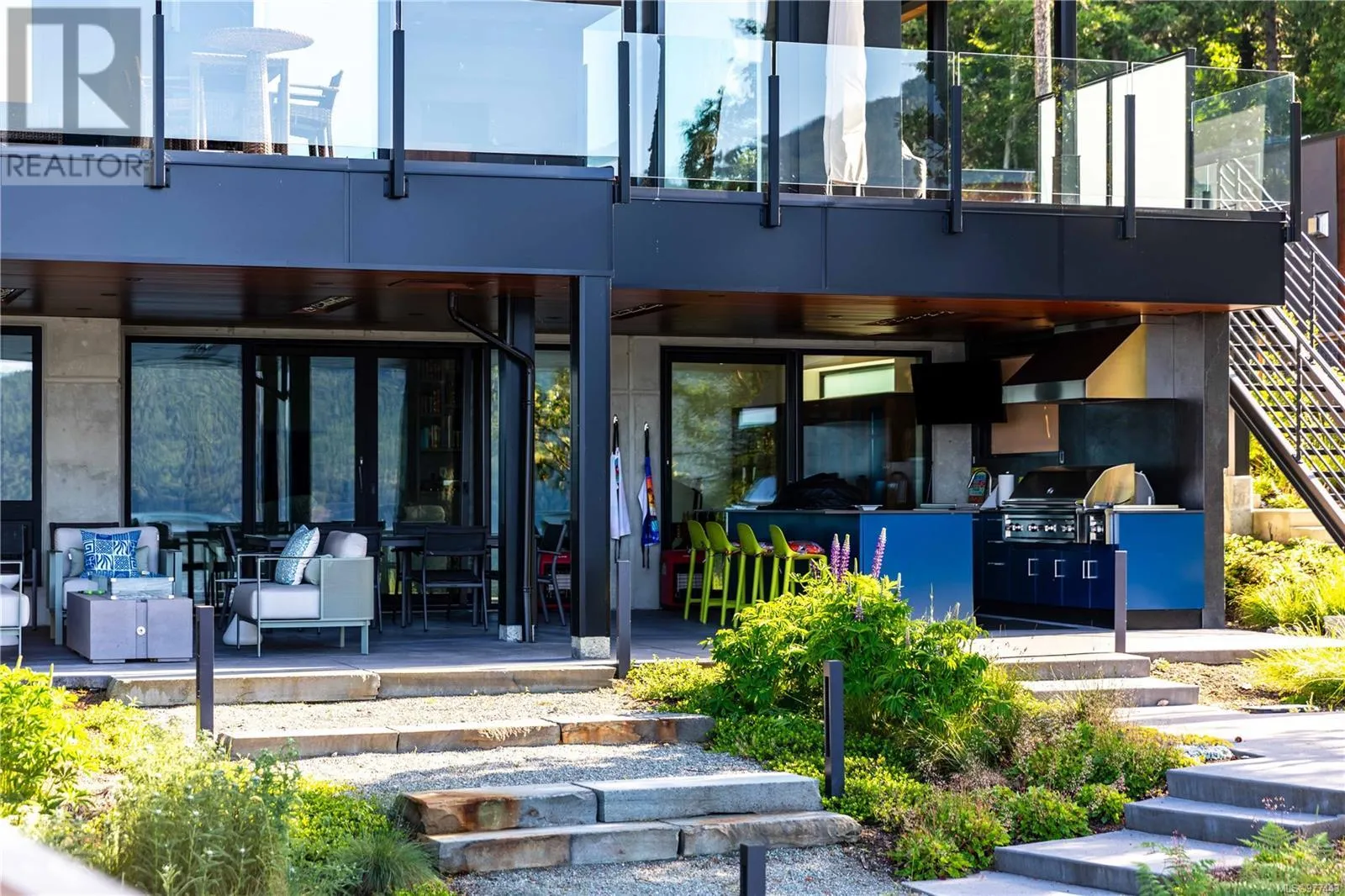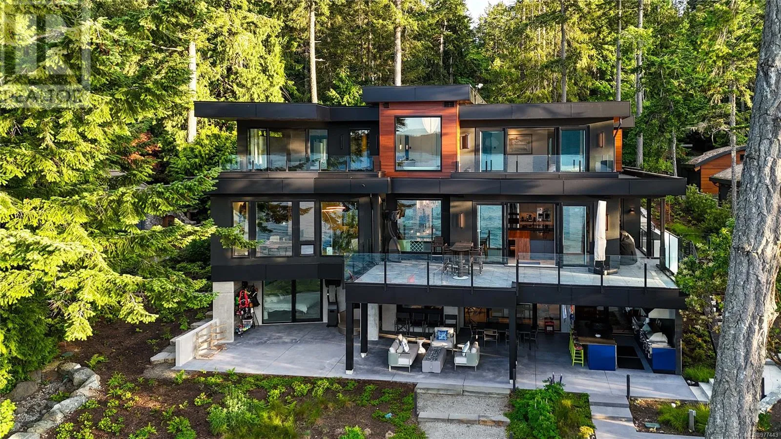 Welcome to this 2024 constructed luxury modern waterfront estate in North Saanich, Vancouver Island. Set on 1.02 acres of superb low-bank oceanfront, this luxurious property offers privacy and stunning views across the Satellite Channel to Salt Spring Island's Mount Tuam Ecological Reserve. Voted best Kitchen (over $150k) & Bathroom (over $75k) at the VI Building Industry Awards, the main residence spans 7,000 sqft, featuring four bedrooms, seven bathrooms, and a double attached garage. A zen garden with a water bowl and Japanese maple surrounds the entrance. Inside, floor-to-ceiling windows flood the main floor's open kitchen, dining, and living areas with natural light, leading to an outdoor patio. The kitchen is equipped with high-end Viking appliances, a Sub-Zero wine cooler, custom lighting and cabinetry, and a prep/pantry area for convenience. The upper level offers two primary suites with ocean-view balconies, walk-in closets, and luxe ensuites; one suite includes a private office. An exercise room, private bathroom, and laundry complete this floor. On the lower level, entertainment abounds with a home theatre, wet bar, indoor and outdoor kitchens, a guest bedroom, laundry, a heated patio, and access to a 350-sqft oceanfront deck. The 990-sqft guest house, located behind the main home, includes its own kitchen, two bedrooms, two bathrooms, laundry, and an expansive ocean view deck. A detached three-bay garage with a workshop and mezzanine provides ample storage and workspace. Equipped with Crestron Integrated Smart Home technology, a Step 5 energy-efficient rating, advanced heating and cooling systems, and comprehensive soundproofing, this home is both intuitive and eco-friendly. Minutes from BC Ferries Swartz Bay Terminal, Victoria International Airport, marinas, parks, and golf courses, this estate offers private, opulent waterfront living with easy access to recreation and amenities. Get in touch with us for an info package today! (id:27476)