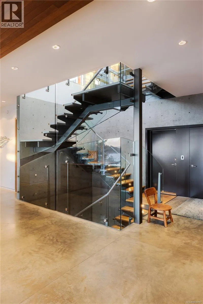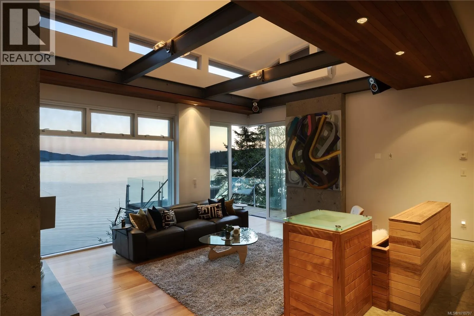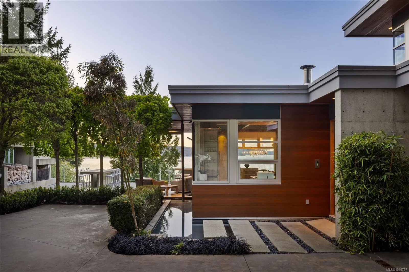 Oceanfront Masterpiece | Malibu Meets Vancouver Island. Experience a rare blend of oceanfront luxury and architectural brilliance in this custom steel and concrete estate home, set on 1.59 acres of private, landscaped grounds and 625 feet of ocean frontage. Floor-to-ceiling windows and signature porthole accents frame stunning panoramic views of the ocean, islands, and passing marine life. A bespoke flybridge extends from the living area, offering front-row views of the 82â infinity lap poolâperfectly aligned to track the sun from sunrises over Mount Baker, to glowing sunsets on the water. Inside, sustainable geothermal heating warms polished concrete floors, beautifully paired with the rich hues of inlaid wood, floating stair rungs, and custom cabinetry. The main floor primary suite is a serene retreat with spa-inspired ensuite and sweeping vistas. The lower level offers guest accommodations, a media room, wine cellar, and a poolside gym with retractable glass doors for seamless indoor-outdoor living. Upstairs, a flexible family room or office provides a quiet escape. The kitchen opens to an outdoor BBQ area with a fireplace and concrete formed dining table. A man-made stream and modern waterfall enhance the natural ambiance. Designed by Daniel Boot, this home is a true coastal sanctuaryâprivate and peaceful, yet minutes from shops, dining, and marinas. (id:27476)