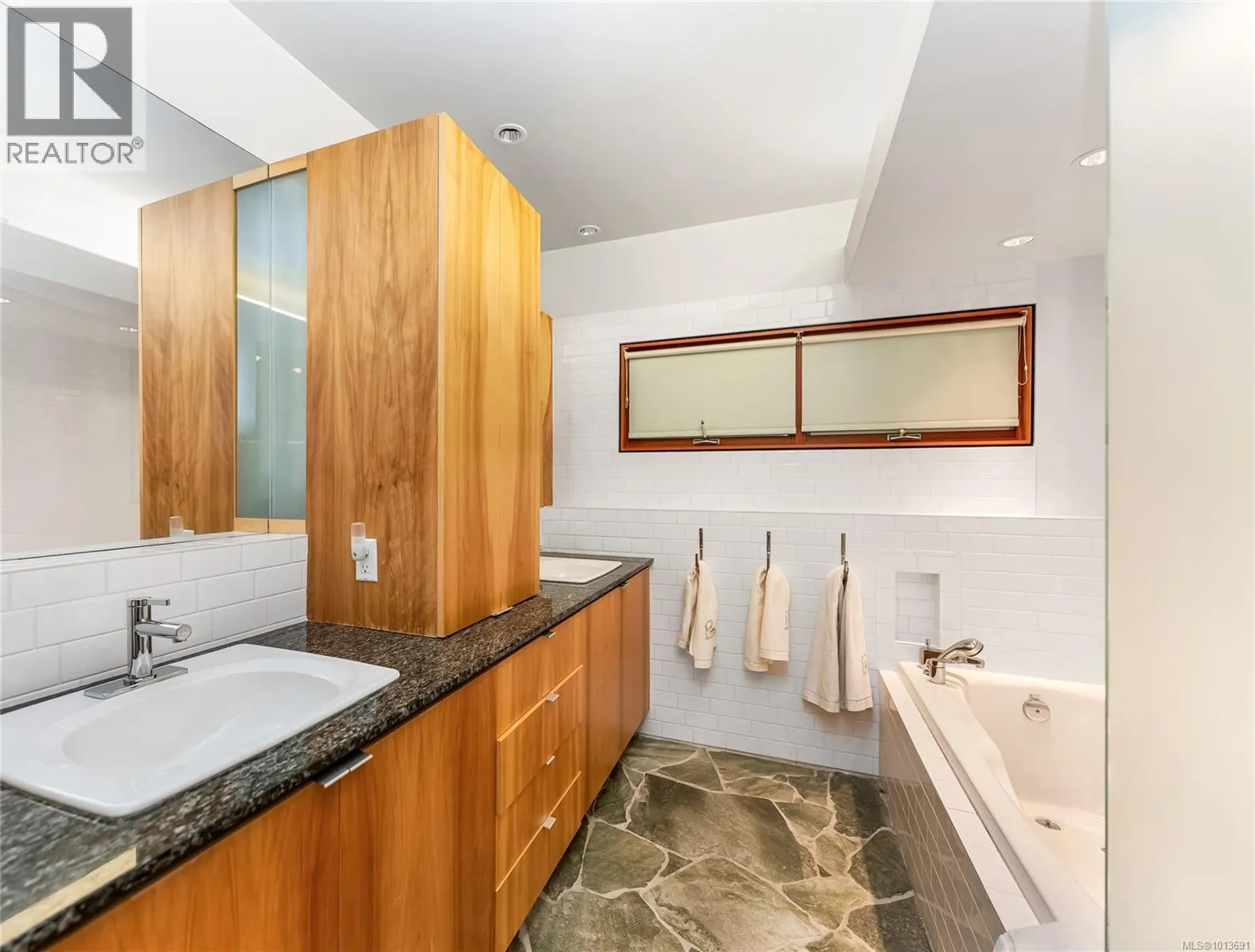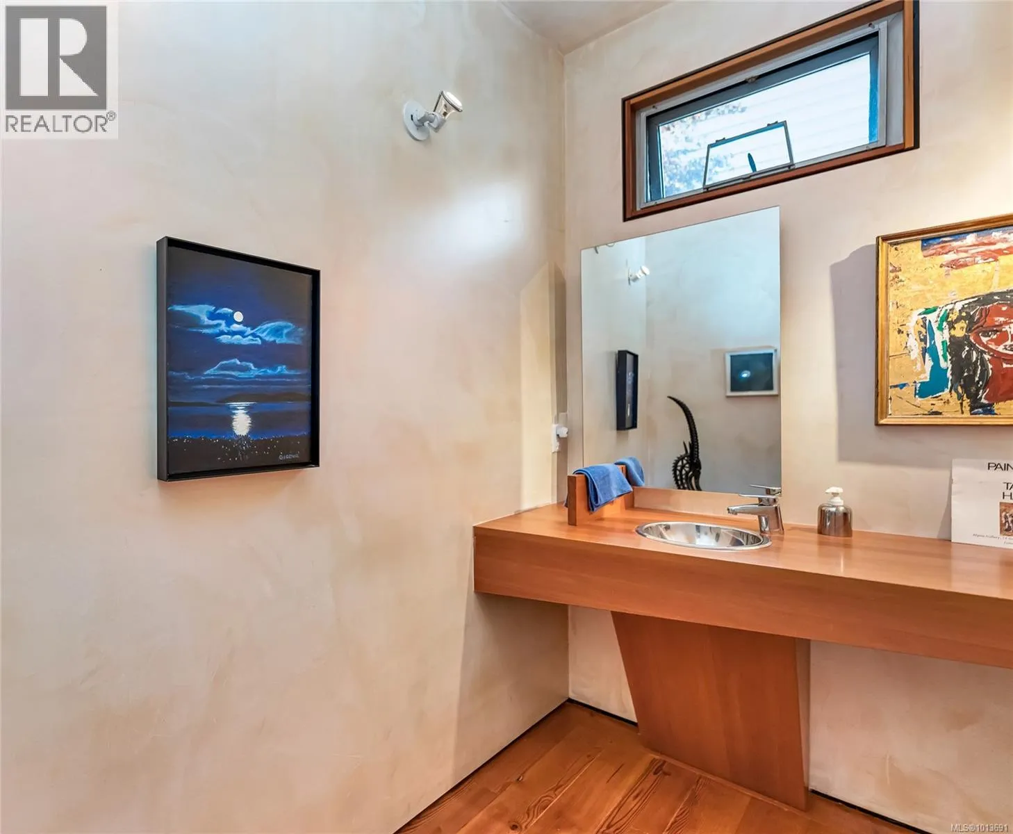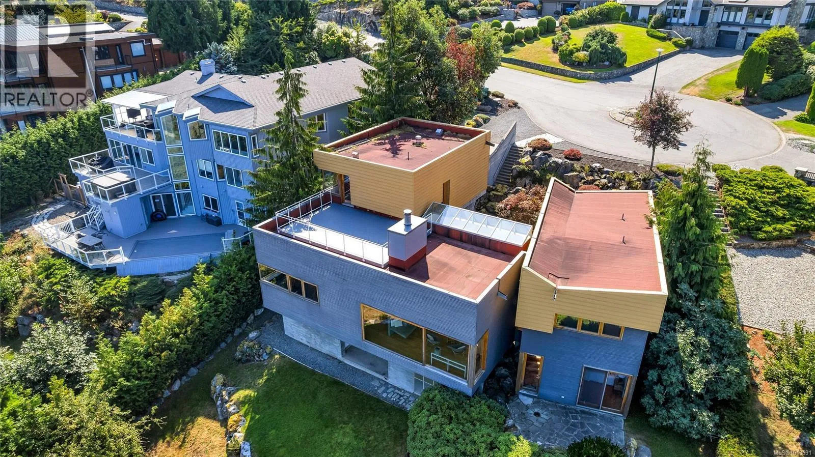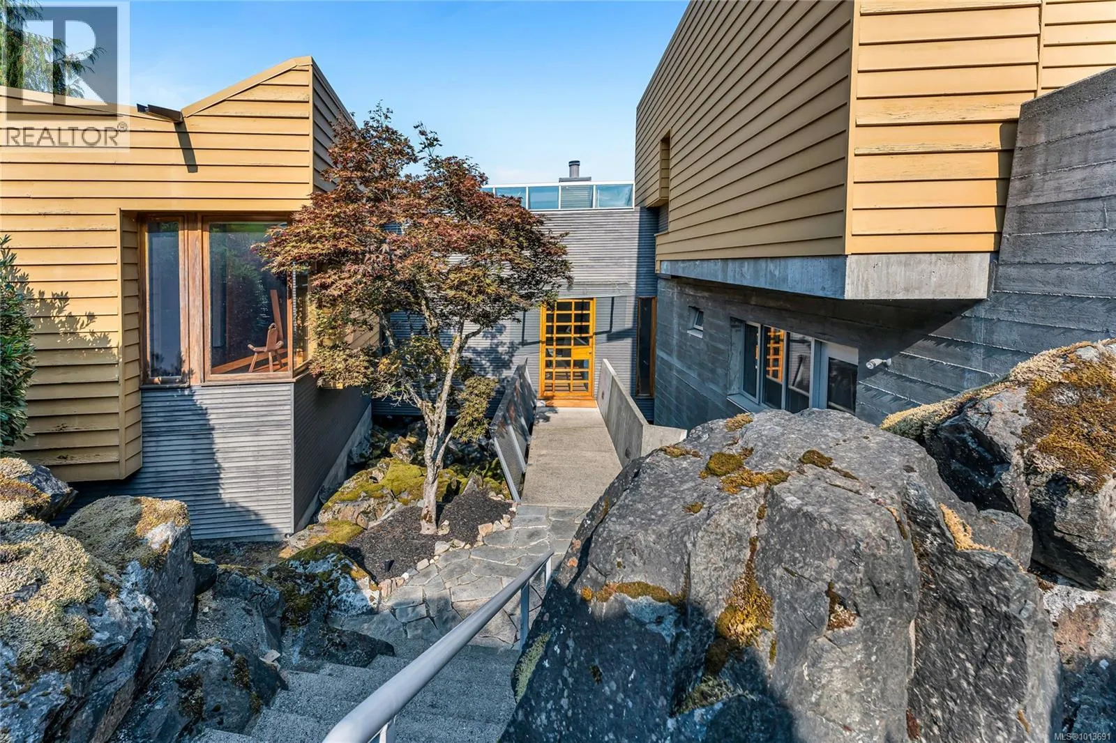 Available for the first time since its construction âBoulder House,â is an architectural icon in prestigious Dean Park, North Saanich on Vancouver Island, B.C. Designed by award-winning Daly Genik architects and built by the Città Group, this one-of-a-kind residence is nestled on a .45-acre lot with sweeping 180° Haro Strait views. Crafted to seamlessly integrate with its topography, Boulder House appears to float above its natural landscape, thanks to discreet concrete components, including a multi-functional structural mast. A meandering stairwell through a boulder landscape leads to a entryway with custom 50â cedar-and-glass zero-gravity door. The main living wing features skylit vaulted ceilings with exposed parallam beams, reclaimed fir floors with radiant heat, and a stunning crystal-inspired two-sided fireplace. Custom built-in cabinetry is finished with Colorado ash. Gallery walls are designed for art; a massive sliding and tilting glass door made from Japanese cedar connects the living room and outdoors. The chefâs kitchen boasts sculptured cabinetry, retractable shelves, solid-core doors with ash veneers. A 30â deep Indian granite counter sparkles with blood-red garnet. Premium appliances include a Sub-Zero fridge and induction cooktop. The north wing includes a guest bedroom and a study with an integrated Murphy bed and barn door. The private primary suite features a terrace, walk-in closet, built-in cabinets, and a spa-inspired ensuite. Additional features include a two-car garage, elevator, flex room with private entrance, rooftop deck, and robust concrete and steel construction designed to support future expansion. Featured in The New York Times, Dwell Magazine, Coastal Retreats and other publications, Boulder House is just blocks from John Dean Provincial Park, and a short drive to Victoria International Airport, Swartz Bay ferry terminal, and downtown Victoria. An immersion of tranquility, luxury, and world-class design, Boulder House awaits. (id:27476)