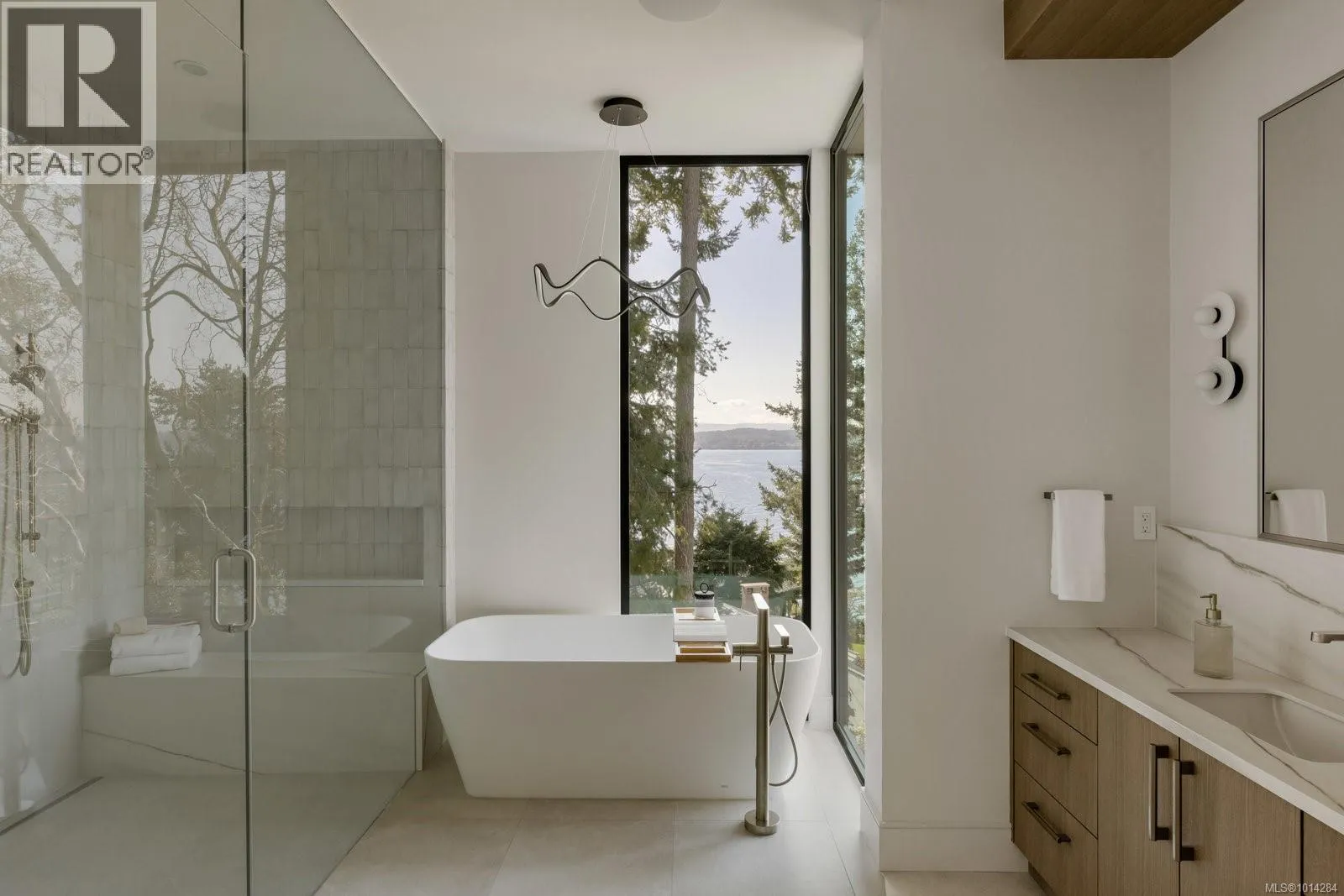 Extraordinary 1.08-acre west-facing waterfront estate in North Saanich, crafted by GT Mann Contracting. This 3,908 sq.ft. gated residence showcases soaring 10â12 ft ceilings and walls of glass capturing sweeping ocean vistas and sunsets. Designed for effortless one-level living, the chefâs kitchen with Miele appliances, butlerâs pantry, and custom millwork flows to a heated, partially covered sundeck with outdoor kitchen. Features include a media room, temperature-controlled wine room, office, 3 bedrooms, and 4 baths. The primary suite offers floor-to-ceiling windows, spa-inspired ensuite, and oversized wardrobe. Zoned for a detached guest cottage, the property provides added flexibility. A 3-car garage, manicured grounds, and refined finishes complete this modern masterpieceâan oceanfront sanctuary blending privacy, natural light, and timeless luxury. (id:27476)
