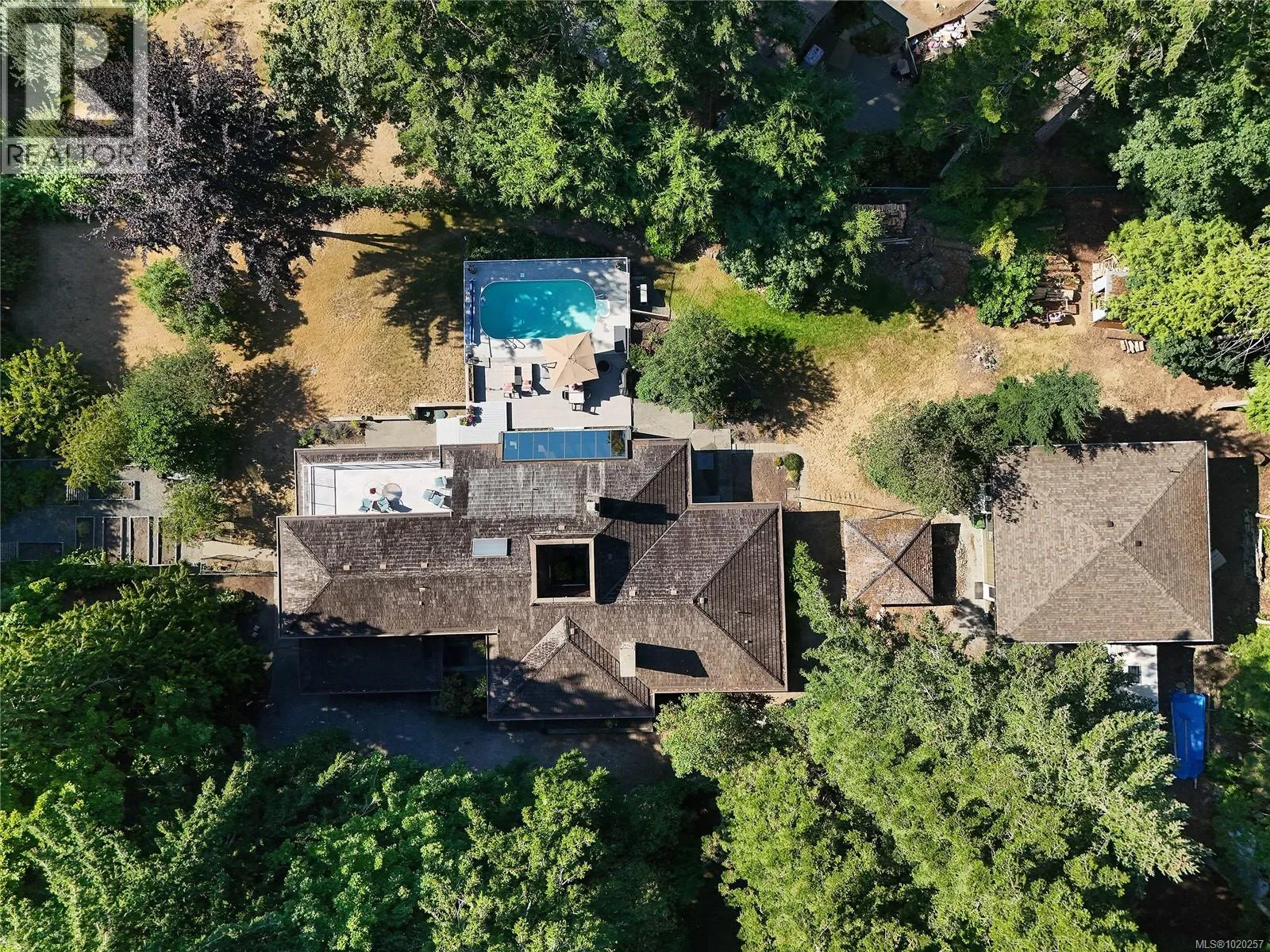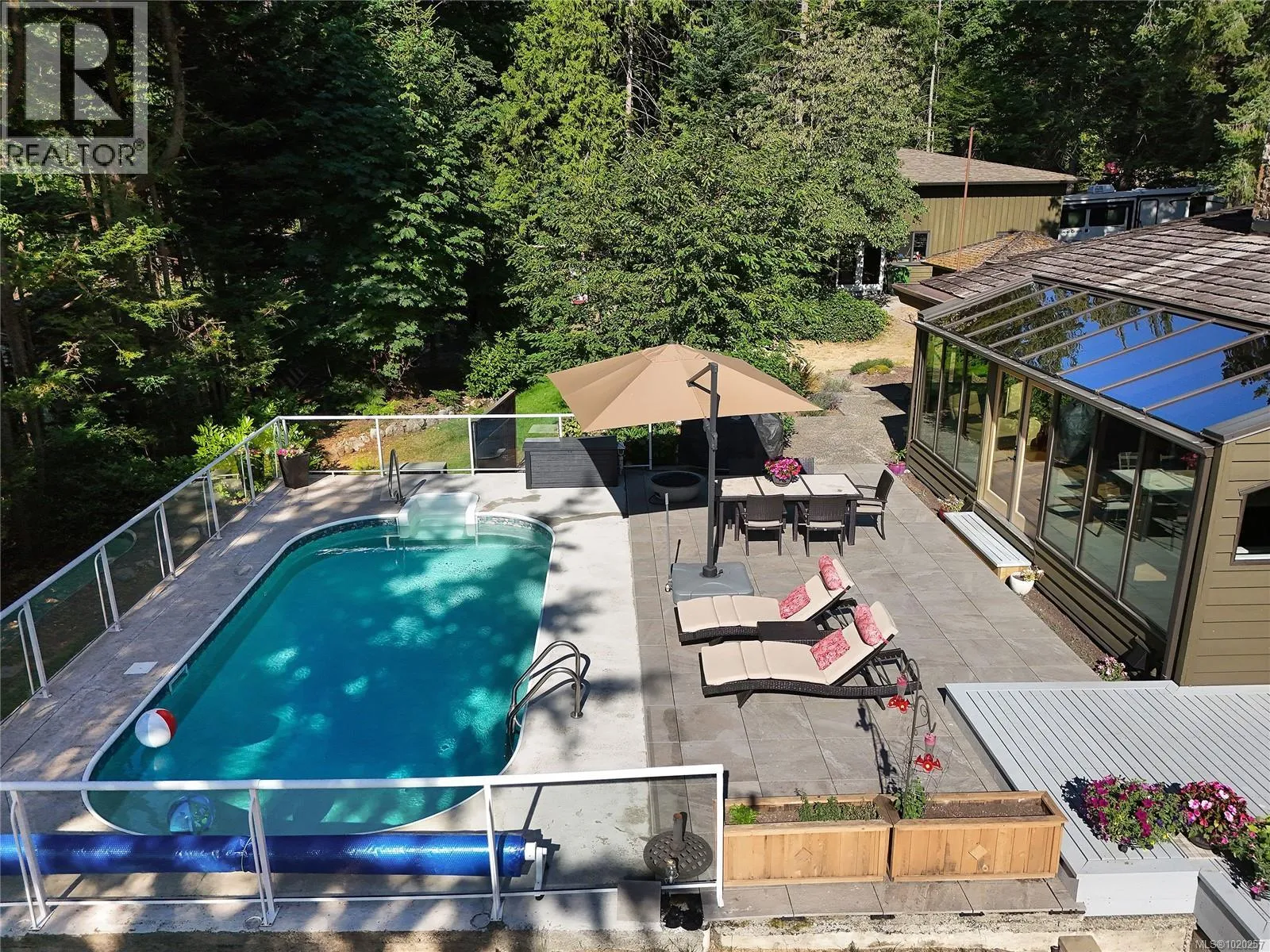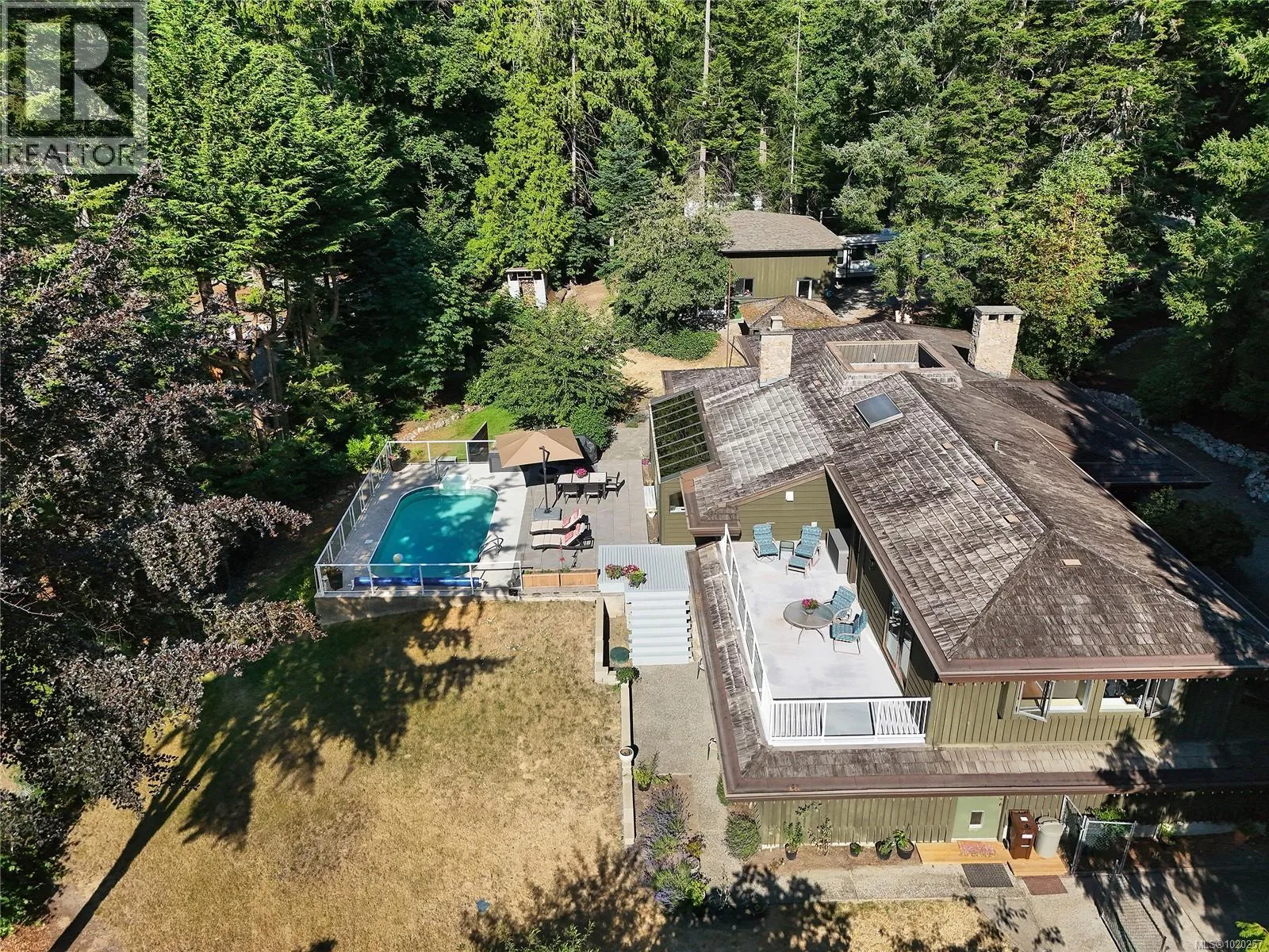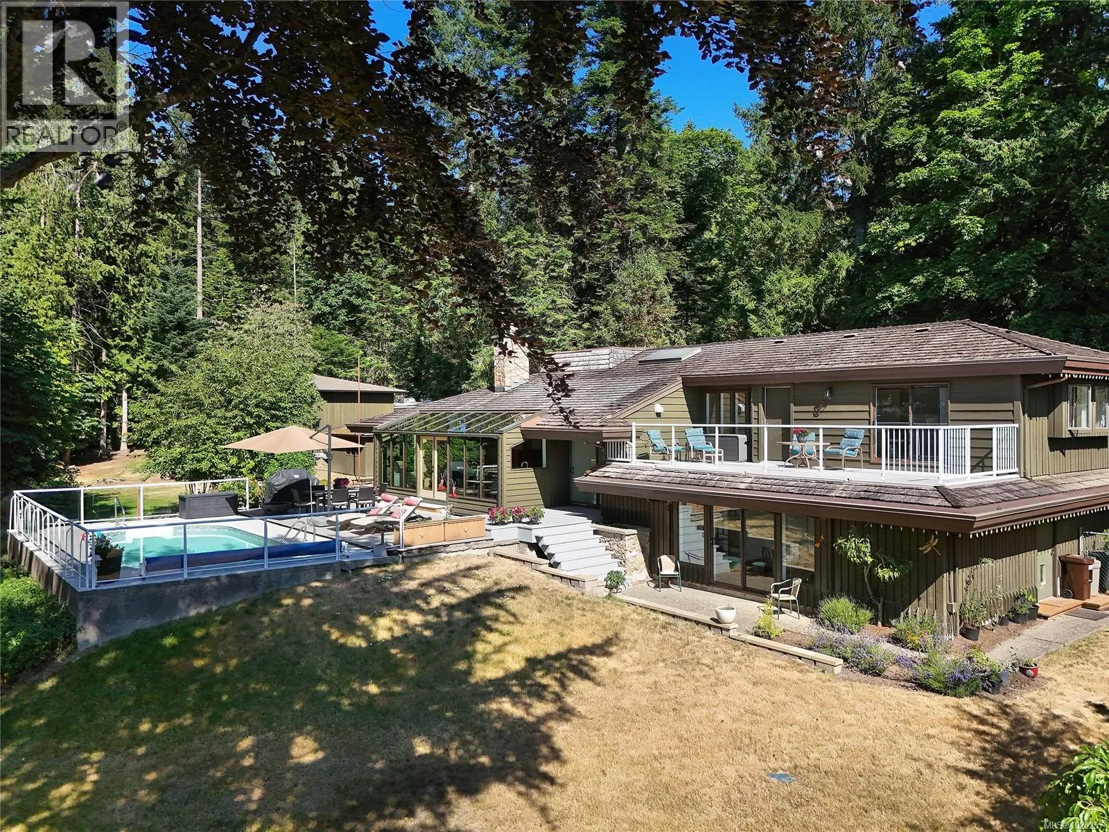 Welcome to your private retreat in sunny Ardmore. Set on 1-acre, this thoughtfully updated 4BD/4BA family home features a fully fenced garden, detached 1,100 sq.ft. workshop with its own heat pump, and a resort-style backyard with large deck and heated pool perfect for entertaining or unwinding. Inside, youâll find quartz counters, a large kitchen island, maple floors, SS appliances, and a cozy wood stove. The open-concept kitchen flows seamlessly into a bright sunroom, while an indoor atrium opens into the inviting living room with a wood-burning fireplace. The main floor offers easy one-level living, complete with a spacious primary suite that includes a walk-in closet and an ensuite with heated floors. A bonus crafts room for hobbies, an oversized double garage with RV/boat parking, and a self-contained in-law suite for added flexibility. Located just minutes to ferries, the airport, and the shops of Sidney, this home offers peaceful country living with urban convenience. (id:27476)